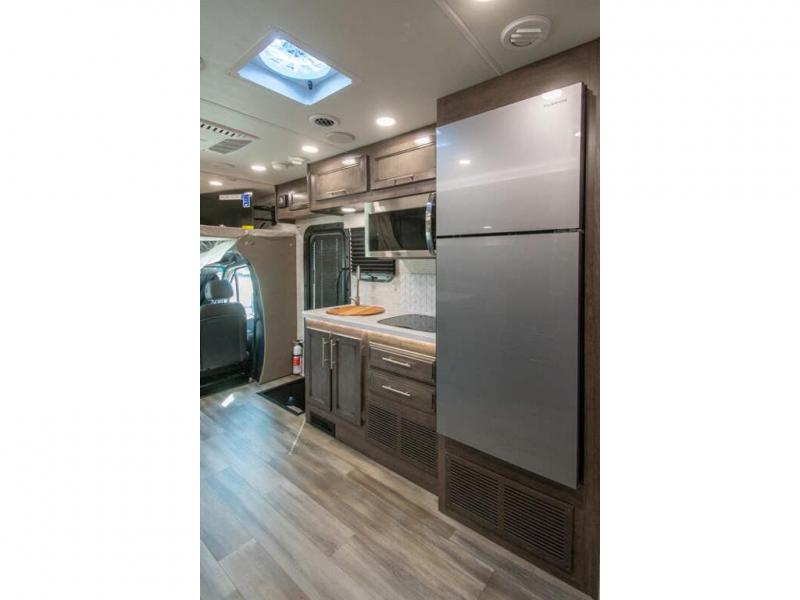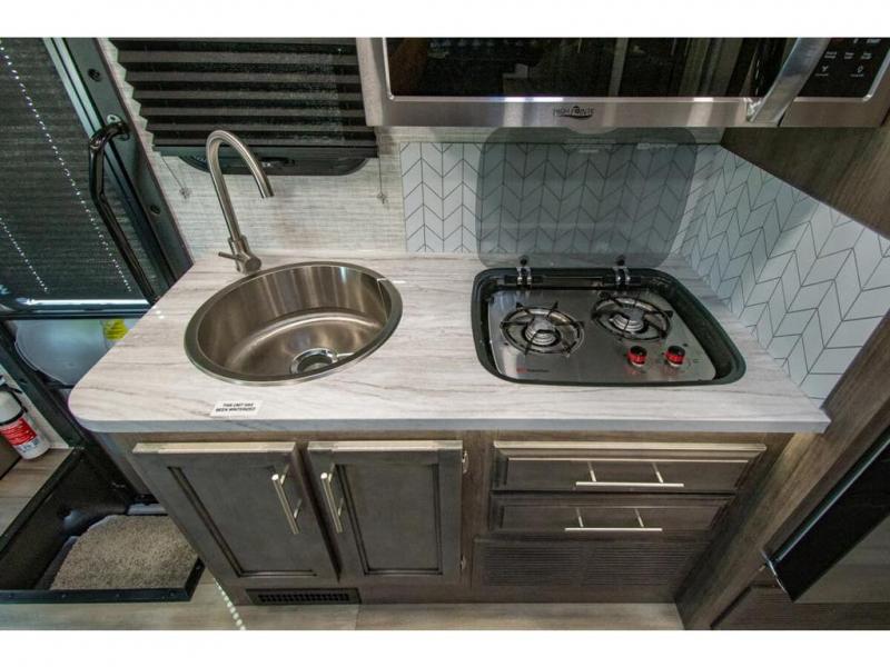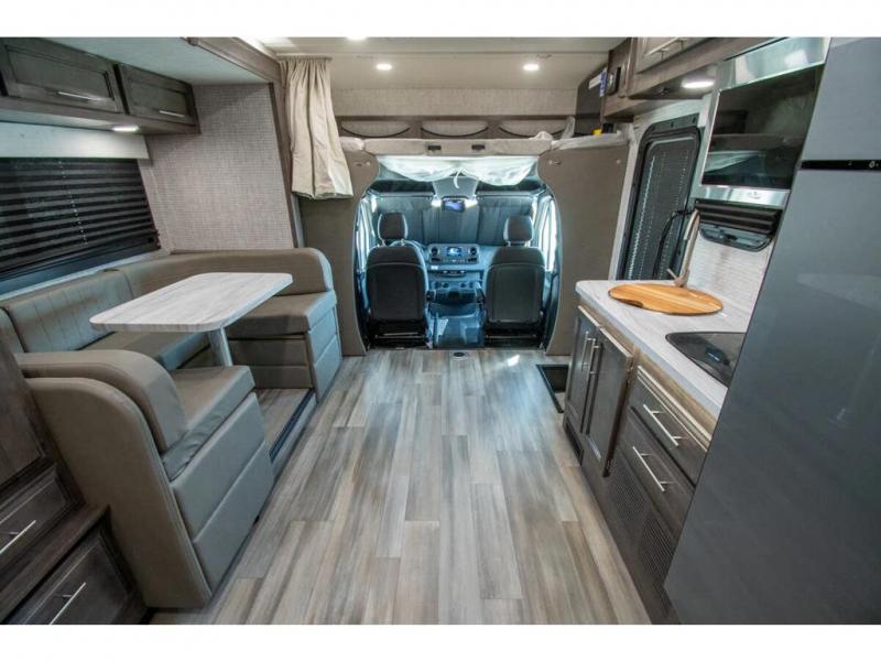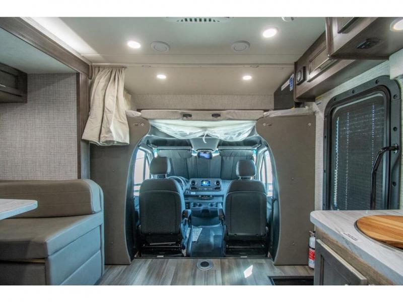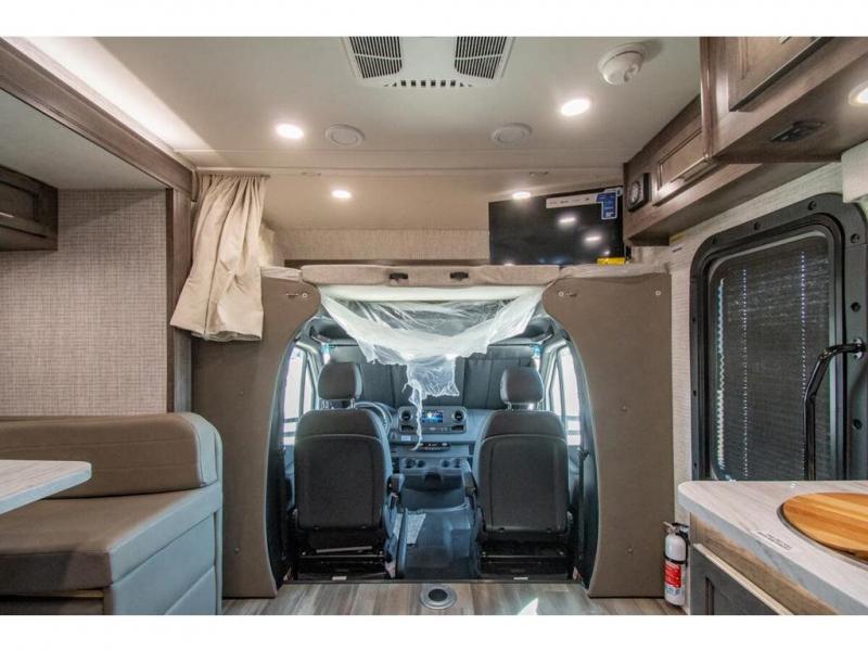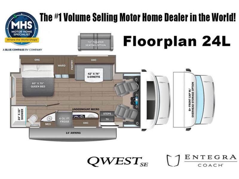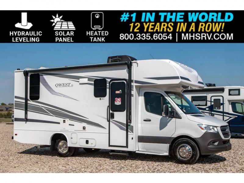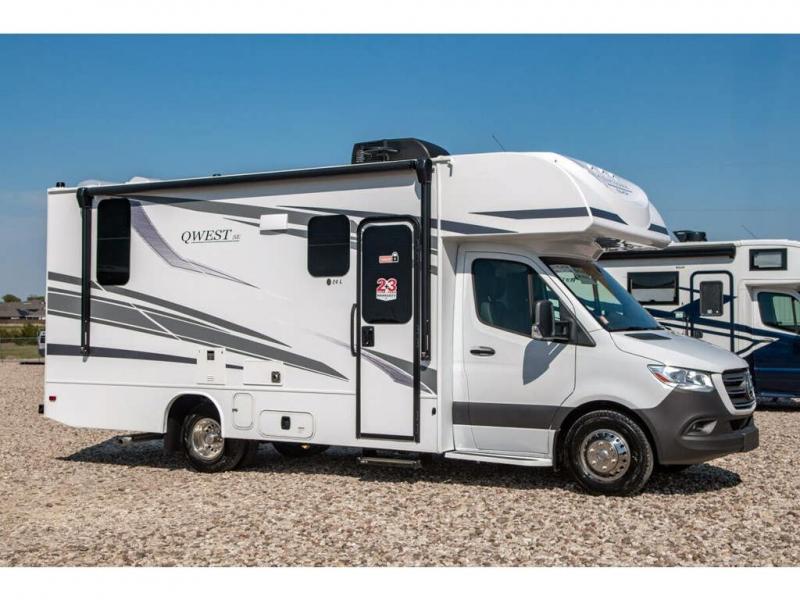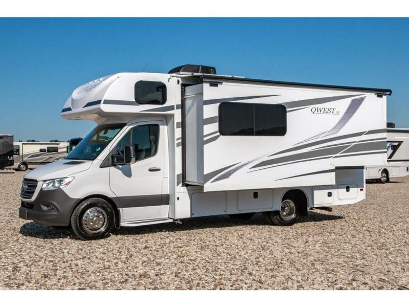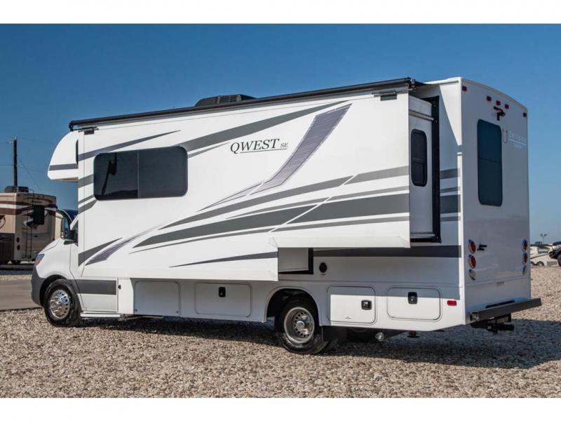 The 2025 Entegra Qwest SE Class C RV Model 24L features a one-piece seamless front cap, JBL audio system, blackout shades, Hardwood Cabinet doors, Mercedes 3500 chassis and a I4 Turbo 208HP diesel engine.