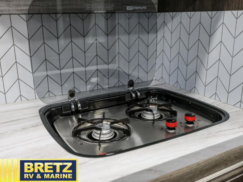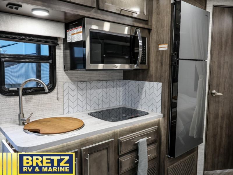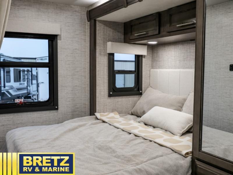 Pack your bags and head to your favorite camping destination in this cozy coach! You can sleep four to six between the RV queen bed, U-shaped dinette, and overhead bunk with a 750 lb. capacity. And if you don't need the extra sleeping space, just choose the entertainment center with overhead storage option in place of the bunk, and the theater seating option in place of the dinette! You can prepare meals each day on the two burner drop-in cooktop or in the convection microwave, and there is a 10 cu. ft. 12V refrigerator for perishables. A full bath, complete with a foot flush toilet, powered roof vent, and shower skylight will let you stay clean throughout each trip. You will also find plenty of storage space, including a wardrobe by the bed, a pantry, plus overhead cabinets!