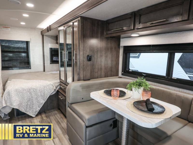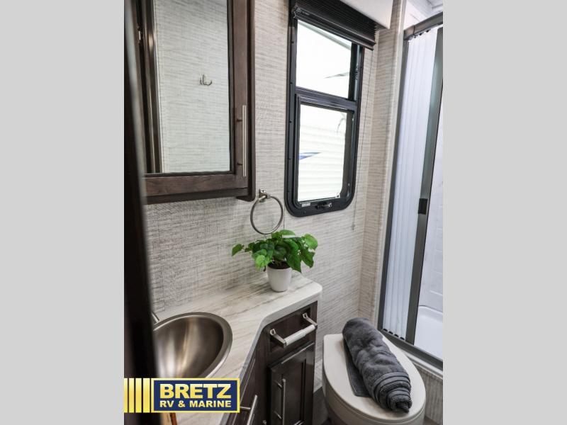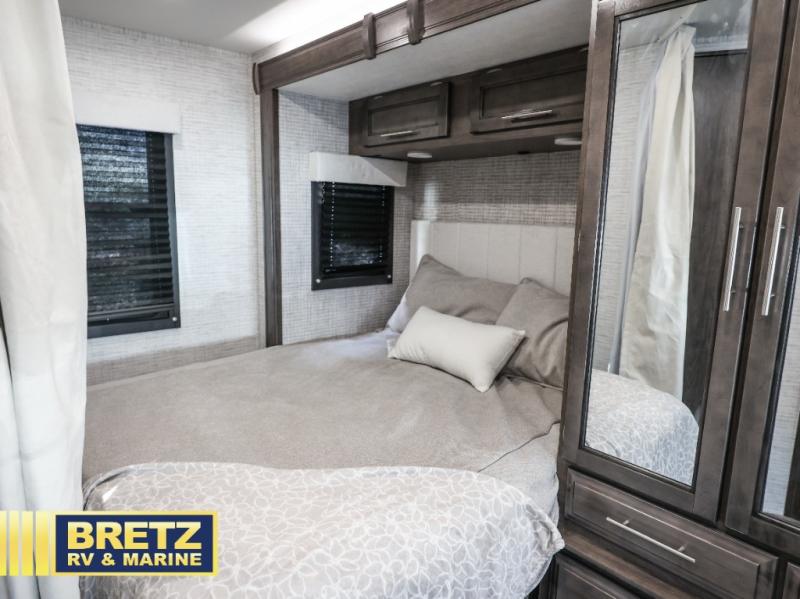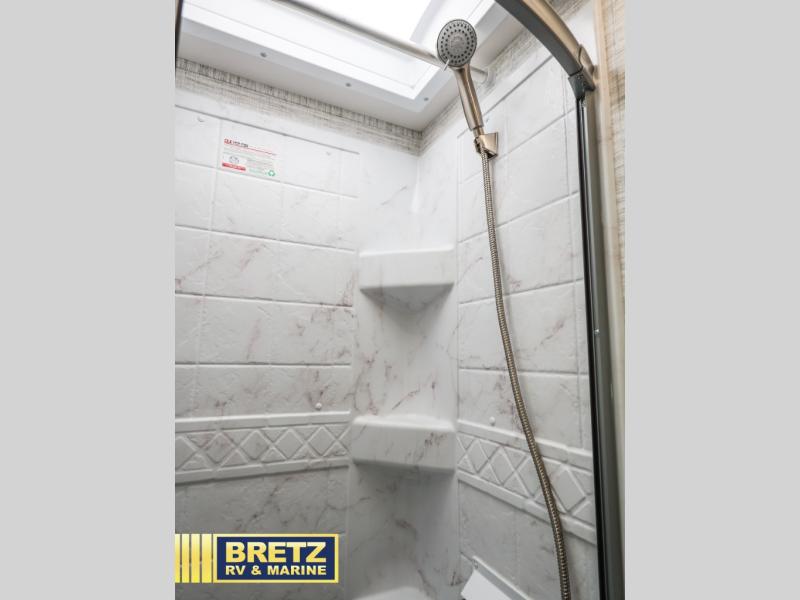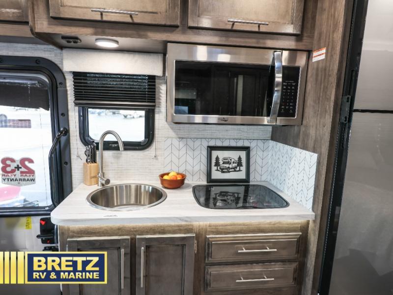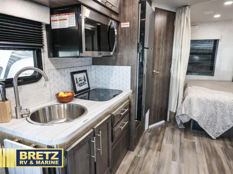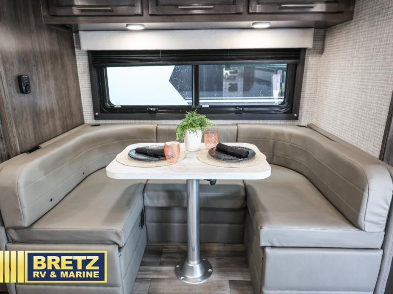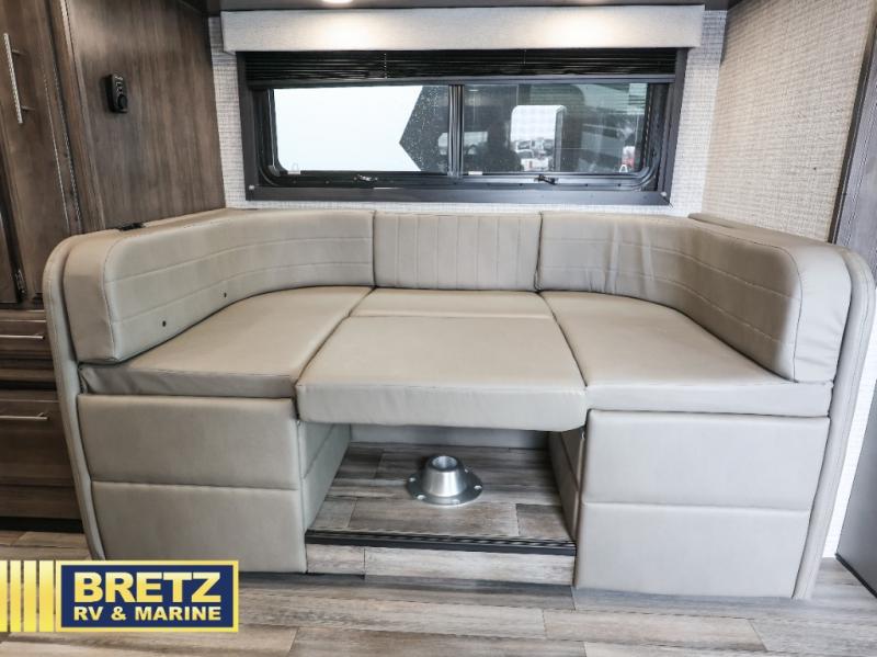 Pack your bags and head to your favorite camping destination in this cozy coach! You can sleep four to six between the RV queen bed, U-shaped dinette, and overhead bunk with a 750 lb. capacity. And if you don't need the extra sleeping space, just choose the entertainment center with overhead storage option in place of the bunk, and the theater seating option in place of the dinette! You can prepare meals each day on the two burner drop-in cooktop or in the convection microwave, and there is a 10 cu. ft. 12V refrigerator for perishables. A full bath, complete with a foot flush toilet, powered roof vent, and shower skylight will let you stay clean throughout each trip. You will also find plenty of storage space, including a wardrobe by the bed, a pantry, plus overhead cabinets!