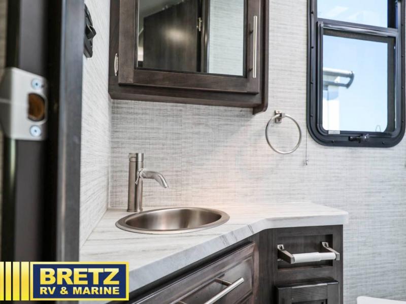 Pack your bags and head to your favorite camping destination in this cozy coach! You can sleep four to six between the RV queen bed, U-shaped dinette, and overhead bunk with a 750 lb. capacity. And if you don't need the extra sleeping space, just choose the entertainment center with overhead storage option in place of the bunk, and the theater seating option in place of the dinette! You can prepare meals each day on the two burner drop-in cooktop or in the convection microwave, and there is a 10 cu. ft. 12V refrigerator for perishables. A full bath, complete with a foot flush toilet, powered roof vent, and shower skylight will let you stay clean throughout each trip. You will also find plenty of storage space, including a wardrobe by the bed, a pantry, plus overhead cabinets!