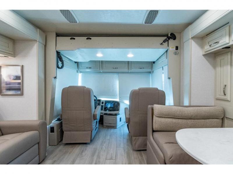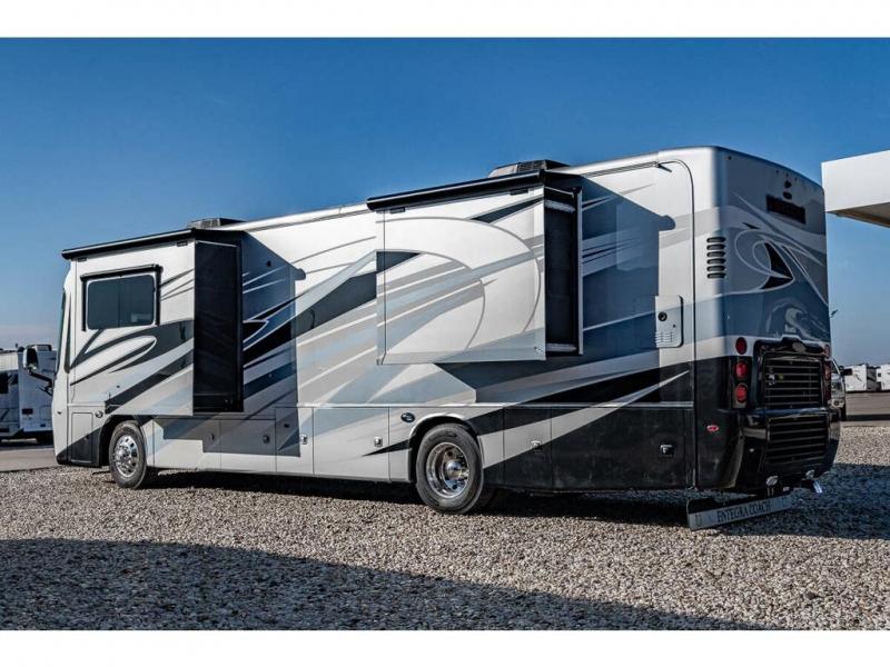 Experience a luxurious home on wheels with this motorhome! The rear private bedroom has a power head lift king bed slide for a great night's sleep, a rear wardrobe with a Splendide stackable washer and dryer to enjoy clean clothes throughout your entire trip, and a 32" TV to watch movies in bed. If you have guests, they can convert the dinette to sleeping space or you can choose the drop-down overhead bunk option for even more sleeping space! The full bathroom will have you feeling right at home with the 36" x 36" one-piece fiberglass shower with a skylight and the Aqua View SHOWERMI$ER water saving system recycles water to the fresh water tank so you don't waste water when you are dry camping. Prepare delicious home cooked meals with the induction cooktop then enjoy them at the 39" x 70" booth dinette. You can make yourselves comfy on the power theater seating directly across from the 50" TV on lift, or you can head outdoors to spend your evening under the Carefree power awning with LED lights. You even have an outside entertainment center with a 43" TV to watch the big game outdoors!