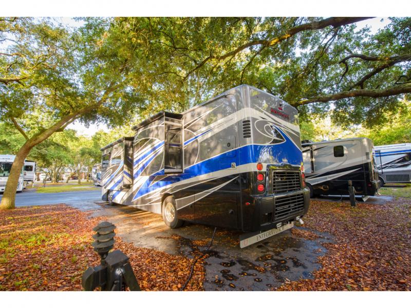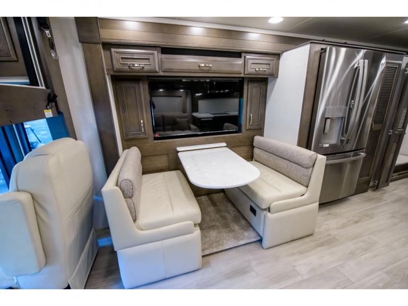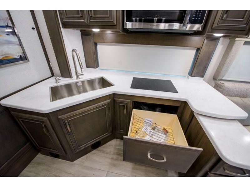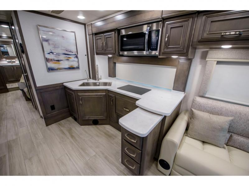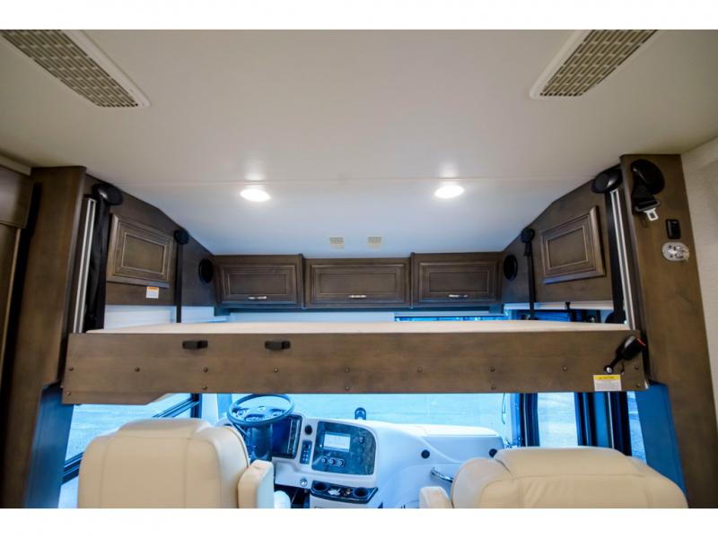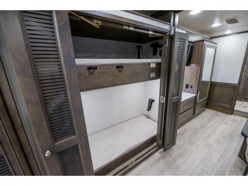 The whole family will have a fun time traveling in this motorhome! The kiddos can sleep on the set of 28" x 72" power bunk beds and you can sleep on the power head lift king bed slide in the private bedroom which also has a wardrobe next to drawers with a 32" TV on lift to watch movies in true comfort. You even have access to the full rear bathroom with a one-piece fiberglass 30" x 40" shower with a skylight, a linen closet to keep your towels close by, and a washer and dryer to clean your clothes. Keep everyone's bellies full with the two burner induction cooktop, stainless steel residential refrigerator, and even a 1.5 cu. ft. convection microwave. Gather together at the 39" x 74" booth dinette to play games and enjoy meals then head to the 68" tri-fold sofa to watch a movie with the 50" TV on a lift or you could head outside and watch a movie at the outside entertainment center with a 43" TV!