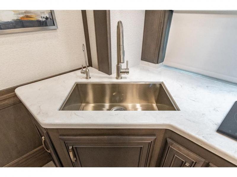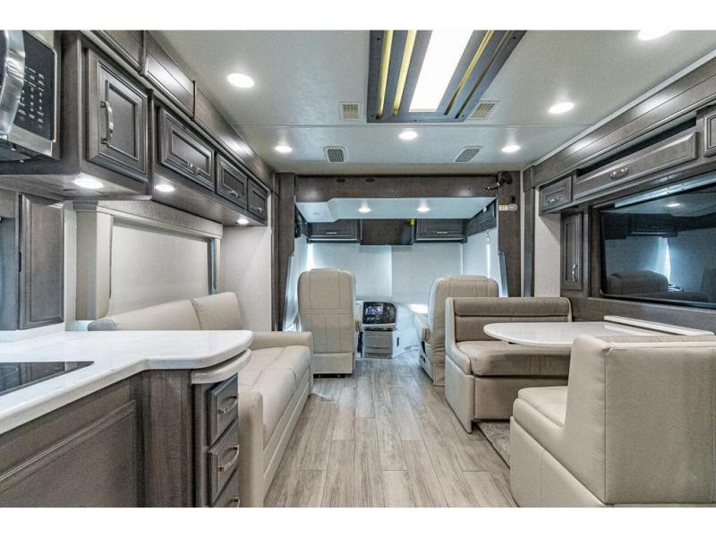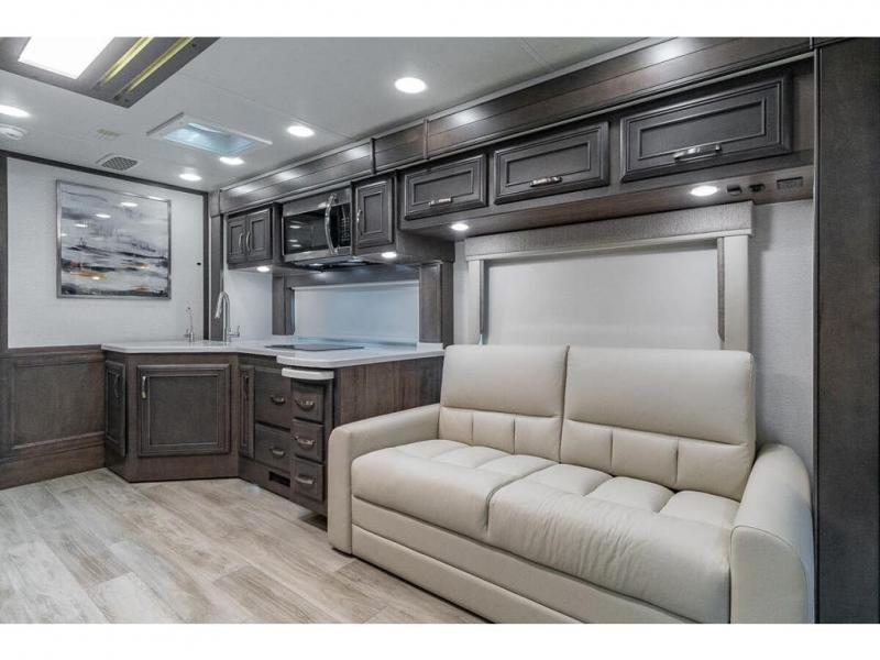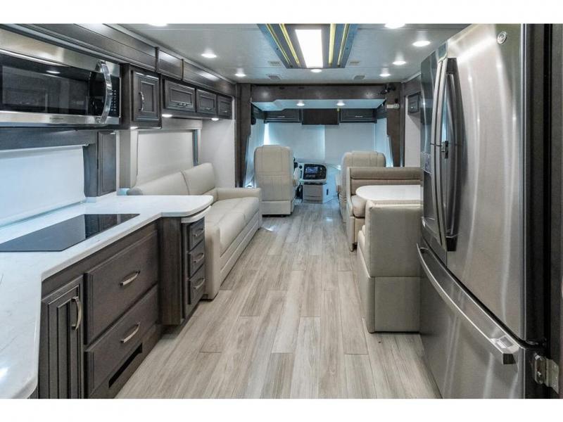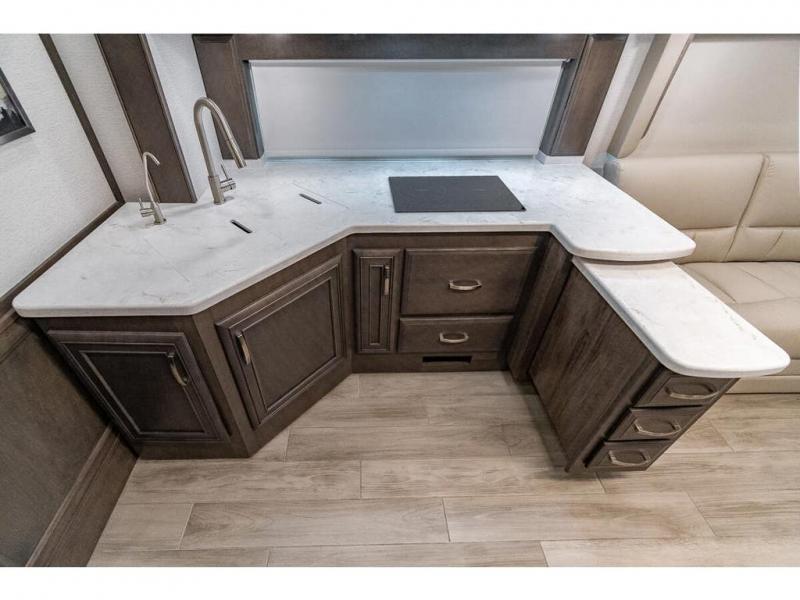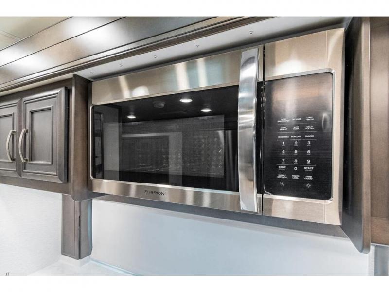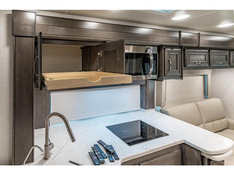 You can comfortably sleep seven to eight people in this spacious coach thanks to the power bunk beds across from the half bath, the power head lift king bed, plus the tri-fold sofa and booth dinette within the main living area. If you have more guests, then you can add the optional drop-down overhead bunk! You'll find the full rear bath to be convenient with its large linen closet and separate washer and dryer, plus there is a one-piece fiberglass shower with a skylight for more standing space. The chef of your group will love cooking in this Reatta XL kitchen that includes a two burner induction cooktop, a convection microwave oven, plus a plenty of overhead cabinets and a pantry for snacks. Since there is a 50" Samsung 4K UHD Smart TV in the living area, you can make it a movie night, or head outdoors to relax under the Carefree power awnings!