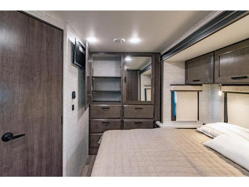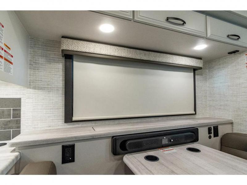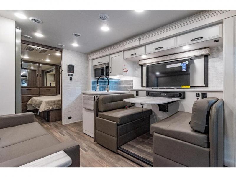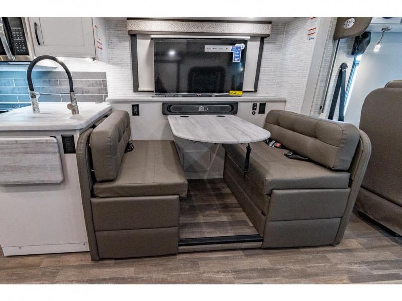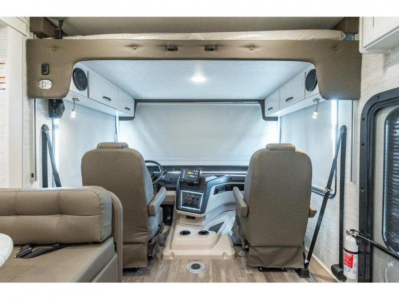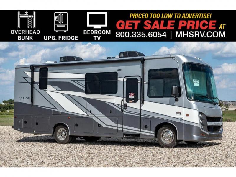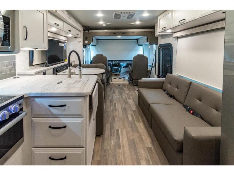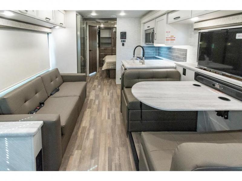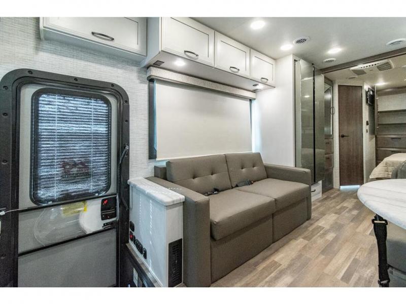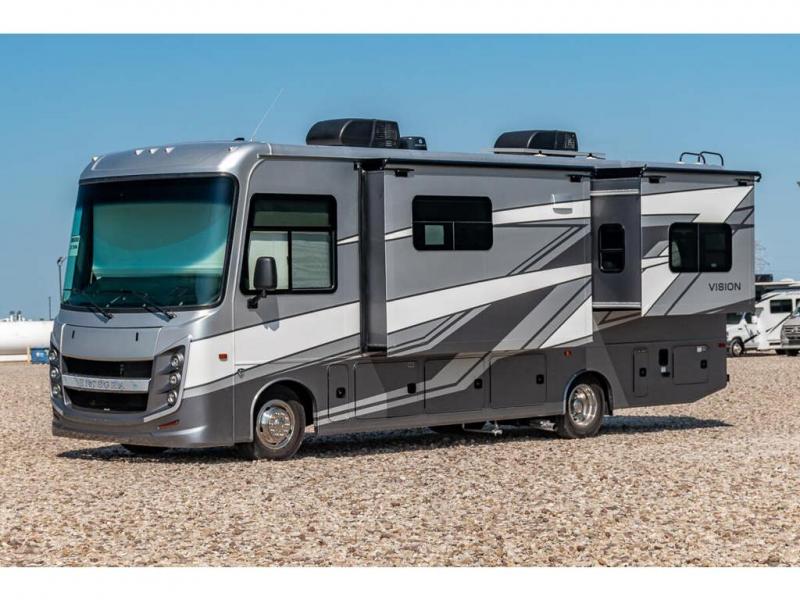 You'll love spending time with your favorite people in this Vision Class A gas motorhome! You can roam freely while inside thanks to the two slides, and the main living area has a booth dinette and 68" jack-knife sofa for relaxing. You can also turn these pieces of furniture into beds at night, and if you add the optional drop-down bunk above the cab, you'll have even more sleeping space. In between the two cab seats you'll find a removable cockpit table so that you can keep some snacks next to you as you travel. The rear private bedroom features an RV king bed within one of the slides so that you can get to the wardrobe, and a full bathroom is right there next to the bedroom for easy access to enjoy a refreshing shower.