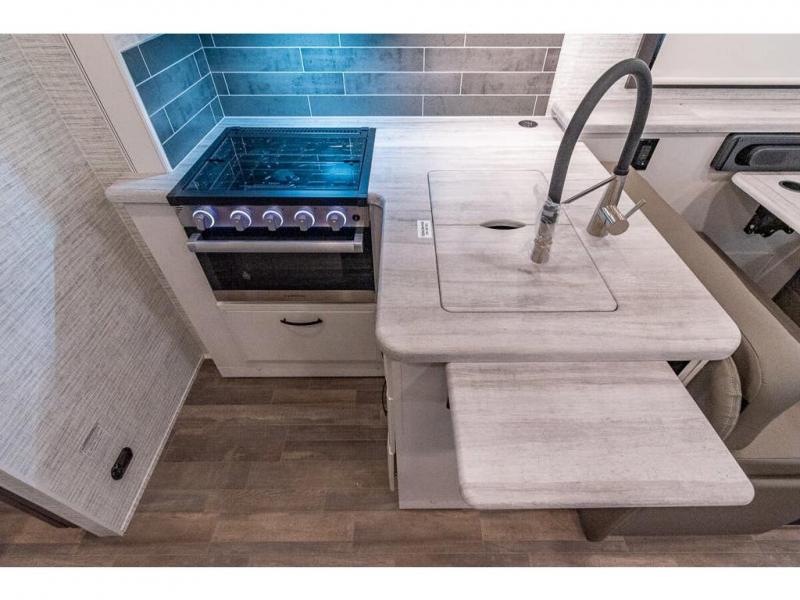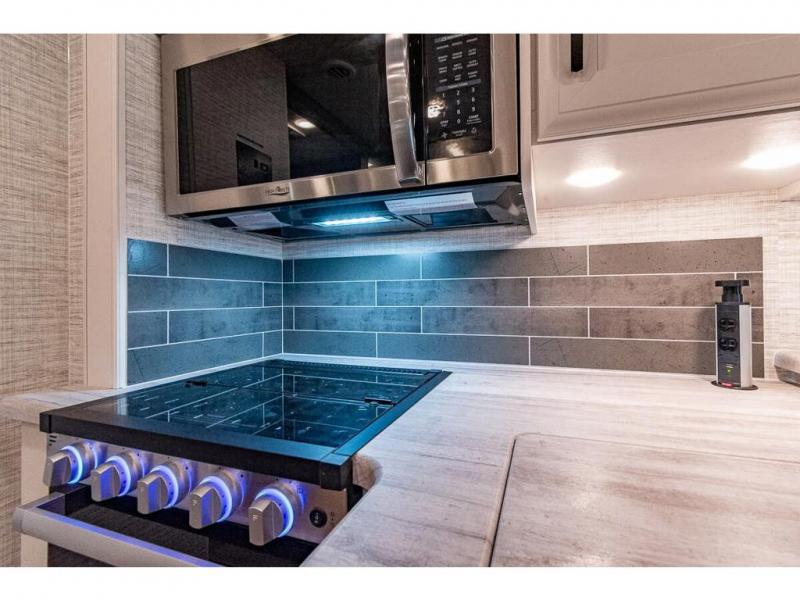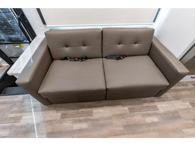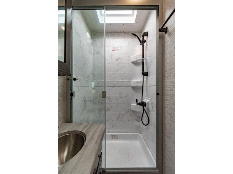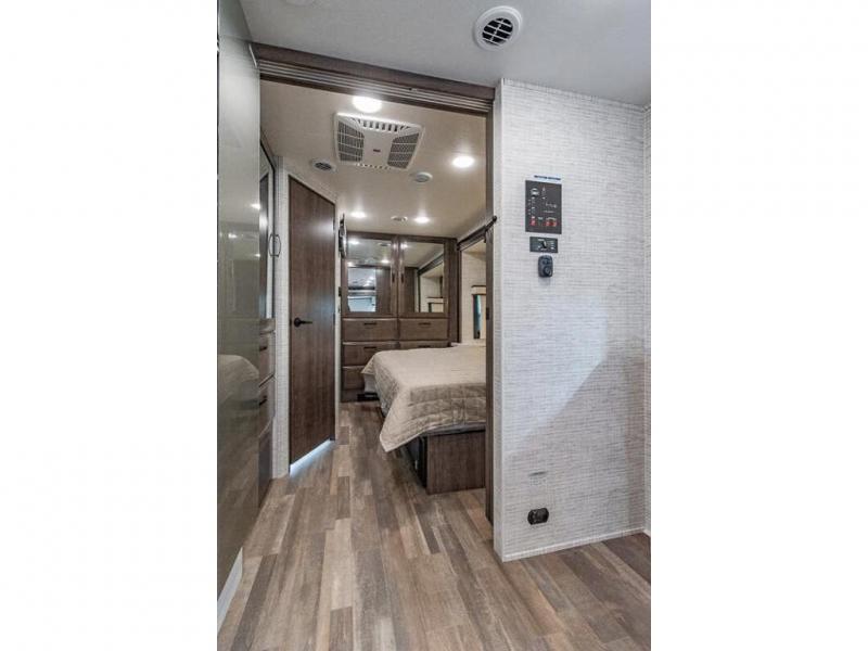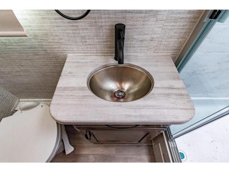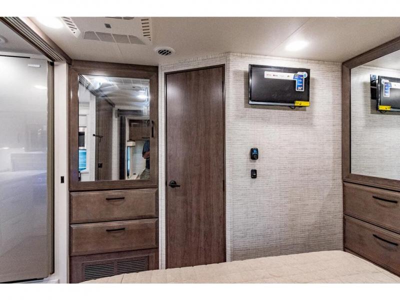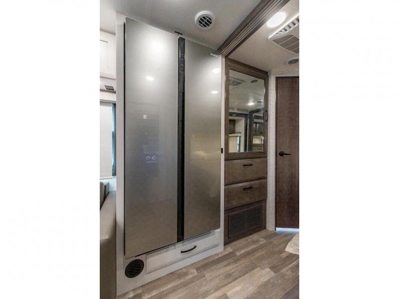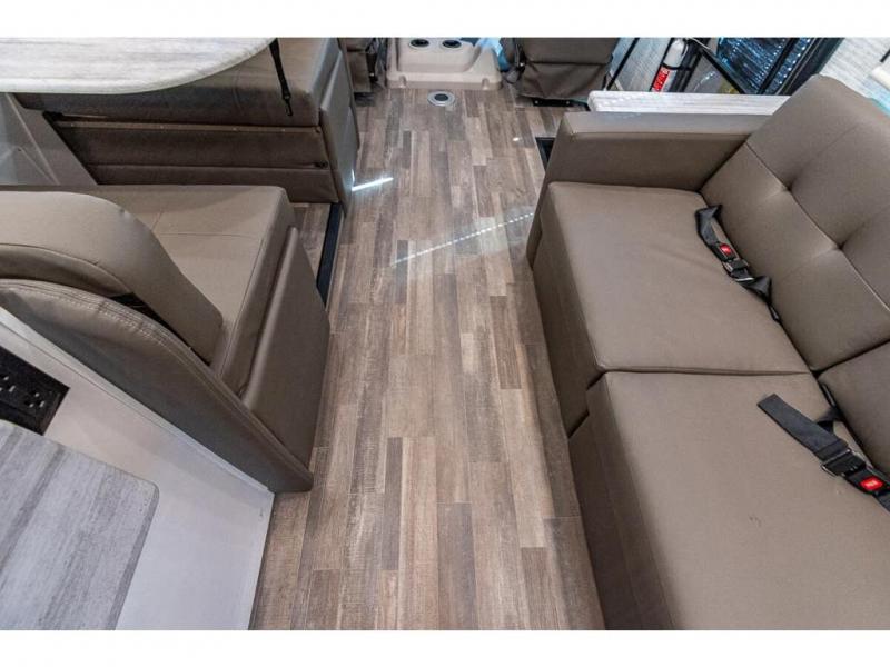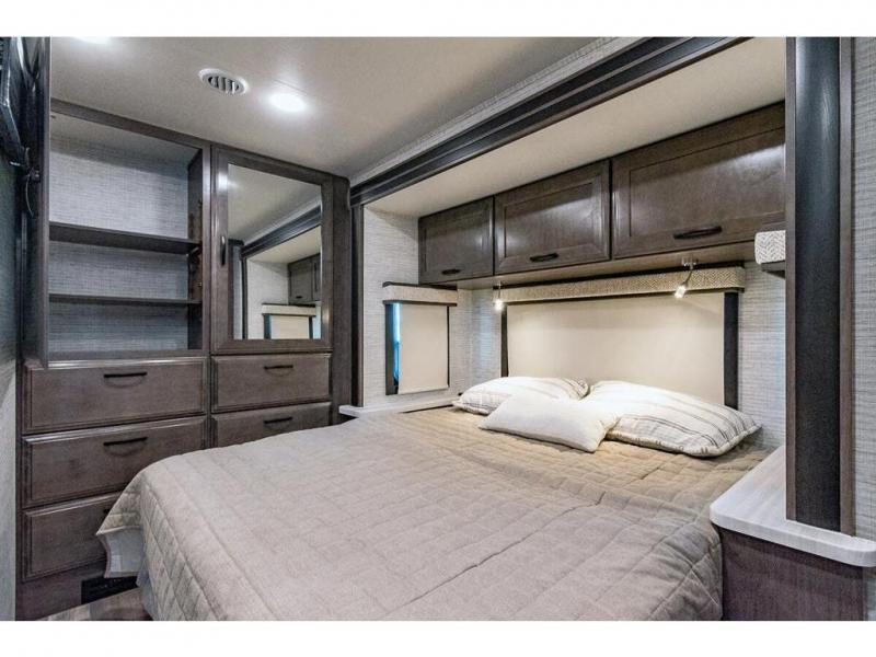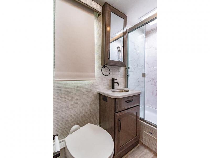 You'll love spending time with your favorite people in this Vision Class A gas motorhome! You can roam freely while inside thanks to the two slides, and the main living area has a booth dinette and 68" jack-knife sofa for relaxing. You can also turn these pieces of furniture into beds at night, and if you add the optional drop-down bunk above the cab, you'll have even more sleeping space. In between the two cab seats you'll find a removable cockpit table so that you can keep some snacks next to you as you travel. The rear private bedroom features an RV king bed within one of the slides so that you can get to the wardrobe, and a full bathroom is right there next to the bedroom for easy access to enjoy a refreshing shower.