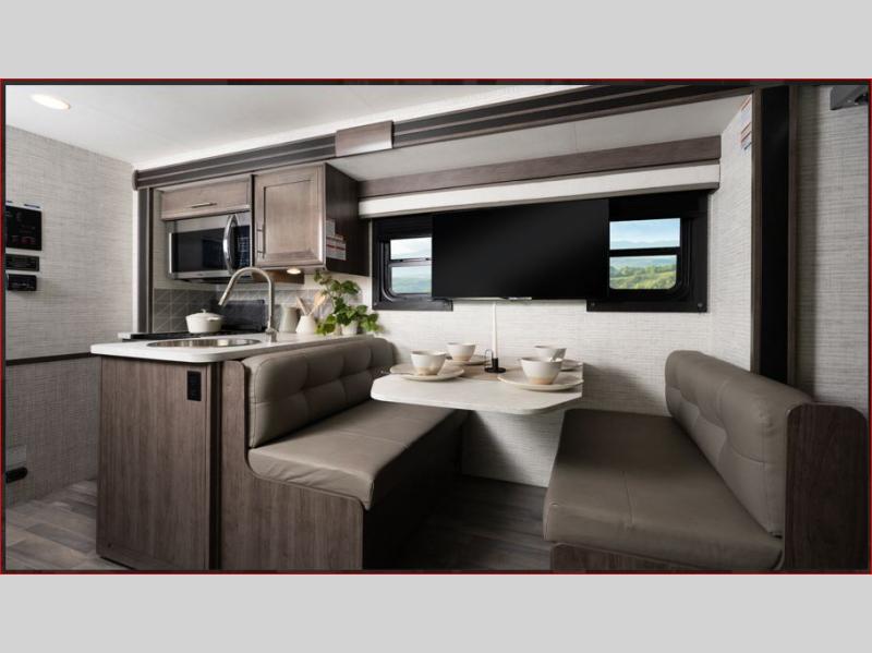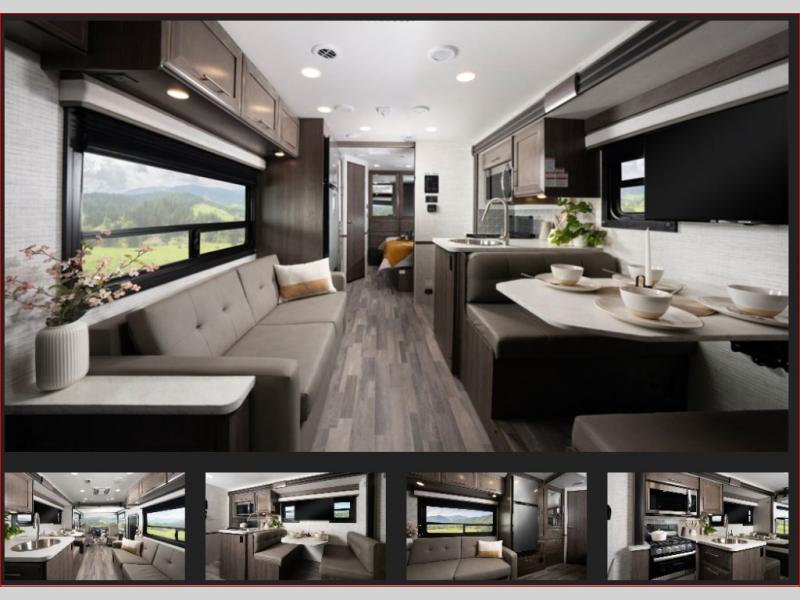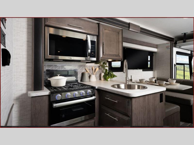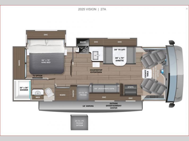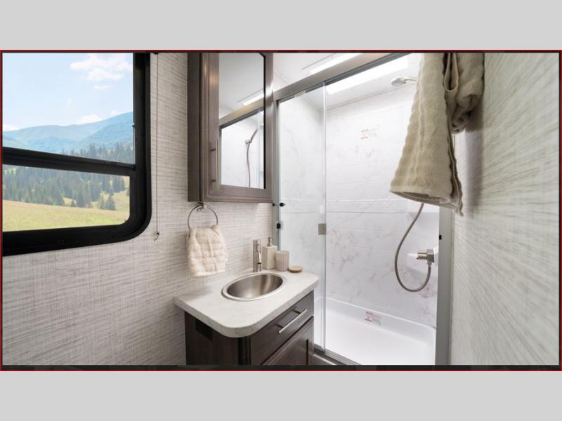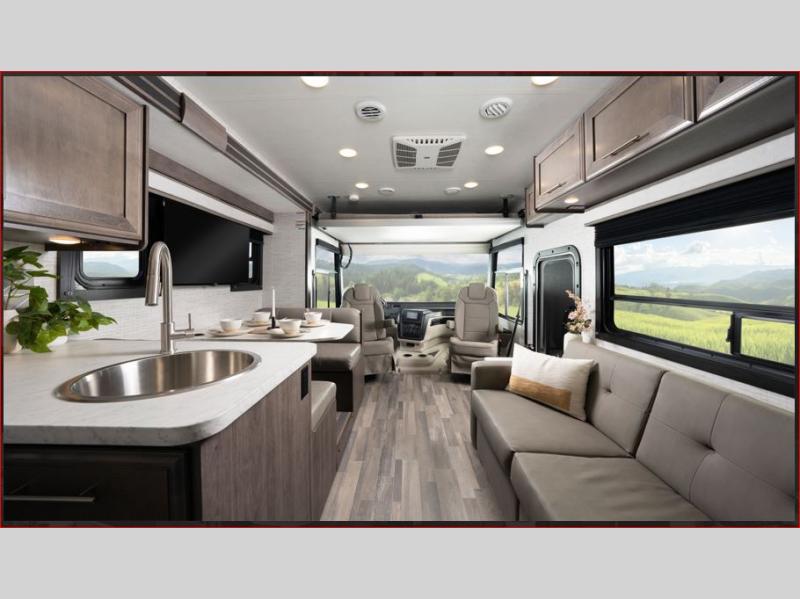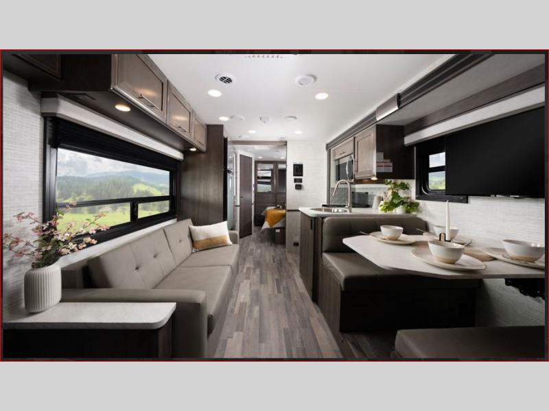 You'll love spending time with your favorite people in this Vision Class A gas motorhome! You can roam freely while inside thanks to the two slides, and the main living area has a booth dinette and 68" jack-knife sofa for relaxing. You can also turn these pieces of furniture into beds at night, and if you add the optional drop-down bunk above the cab, you'll have even more sleeping space. In between the two cab seats you'll find a removable cockpit table so that you can keep some snacks next to you as you travel. The rear private bedroom features an RV bed within one of the slides so that you can get to the wardrobe, and a full bathroom is right there next to the bedroom for easy access to enjoy a refreshing shower.