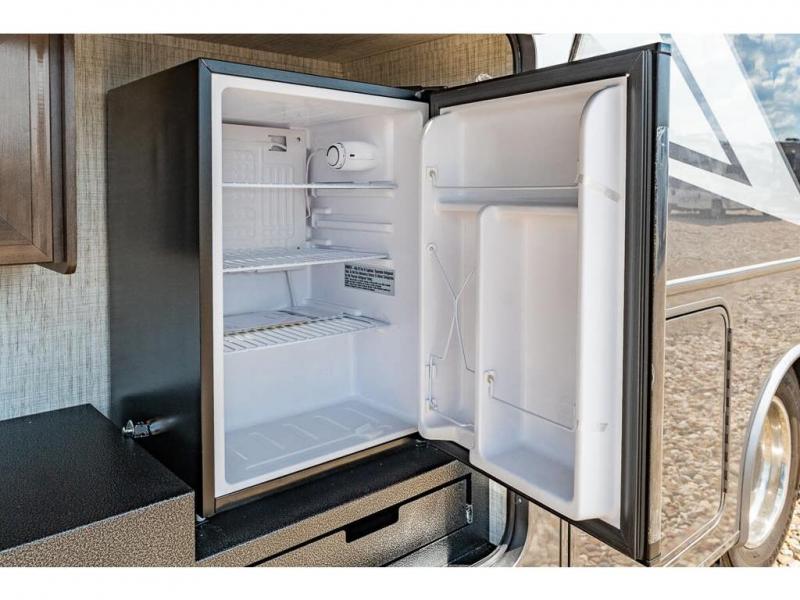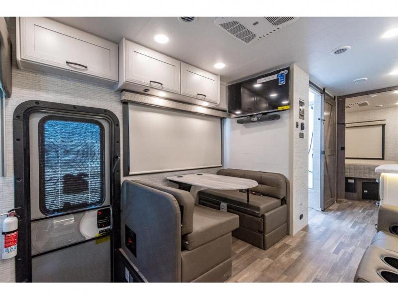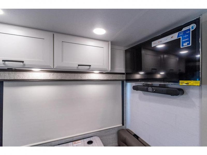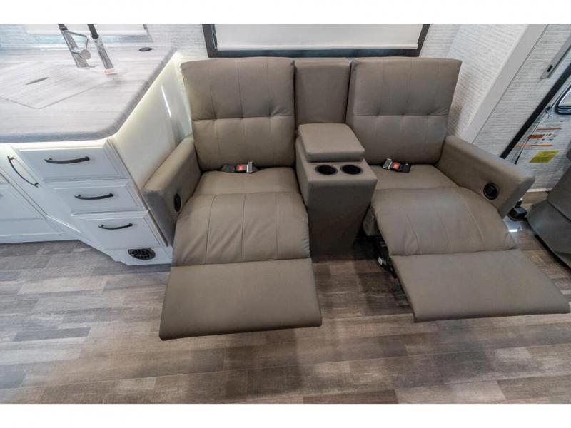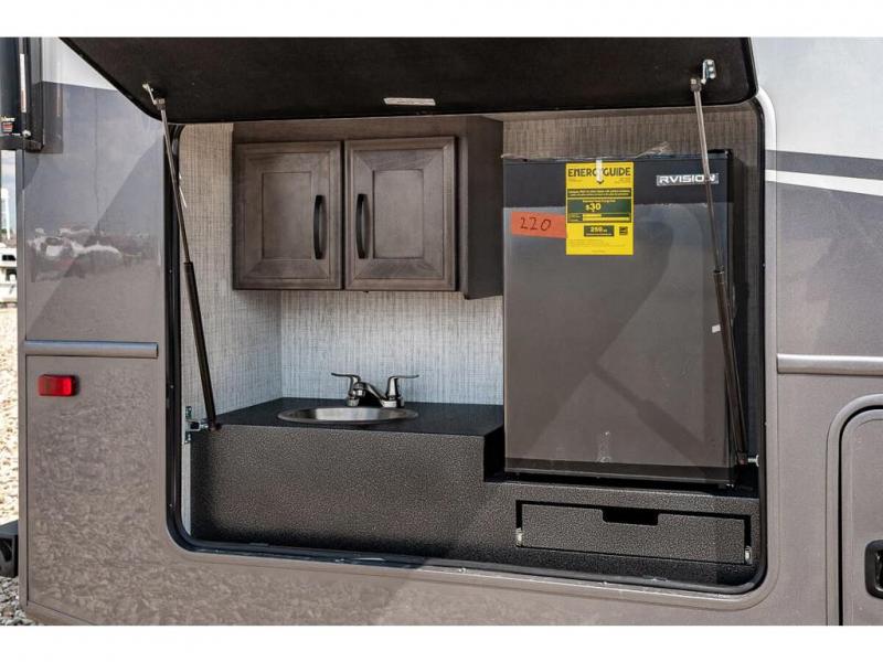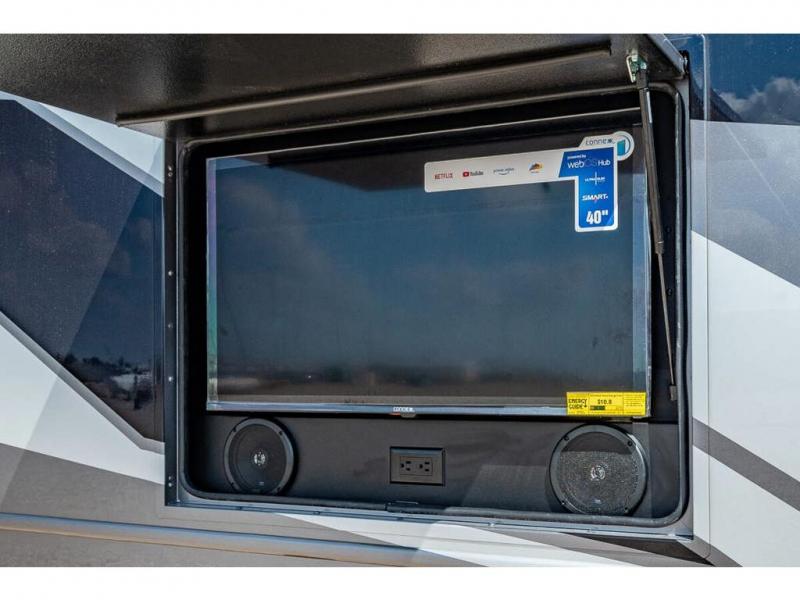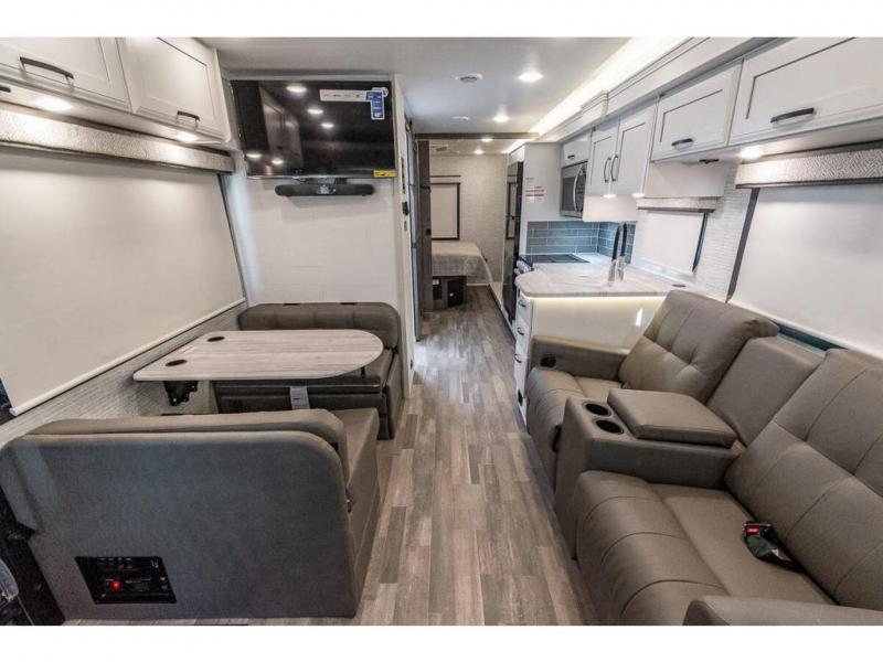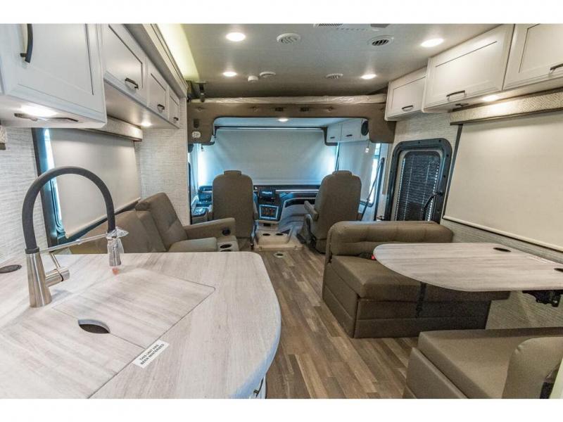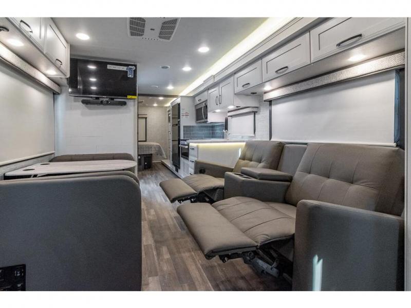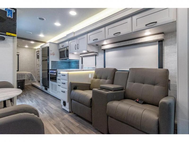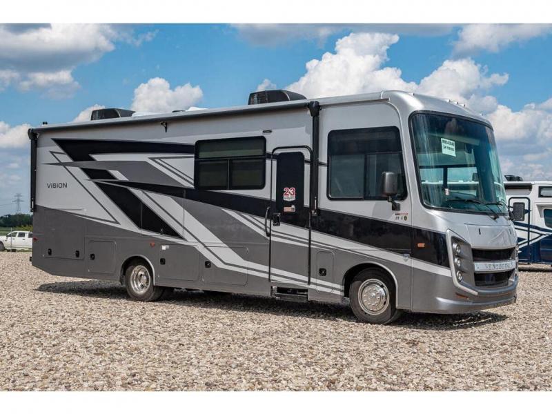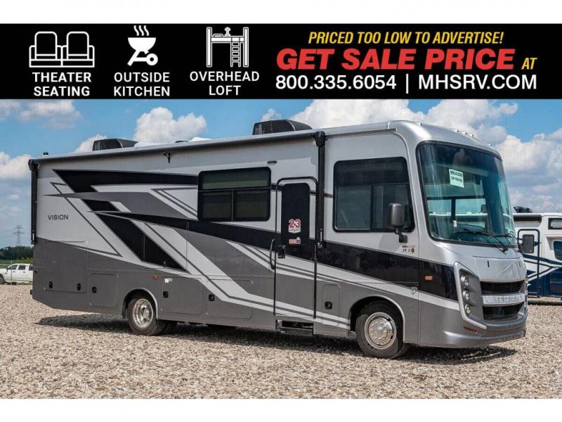 This Vision Class A gas motorhome has excellent interior living space with a full-wall slide! You'll fully enjoy the kitchen and the amenities it provides, like a residential-size microwave, a 10 cu. ft. 12V refrigerator, a Furrion all-in-one cooktop and oven, and a pantry. The 68" jack-knife sofa and booth dinette offer you lounging space after a full day of traveling, and the 39" LED HD Smart TV offers you some entertainment when you don't want to be active anymore. The exterior portion of this coach is also excellently appointed with an outdoor kitchen, exterior entertainment center with LED HD Smart TV, radio, and speakers, and a 23' electric awning with LED lights. You also have great choices of options for this coach with the optional theater seating, LED HDTV in the bedroom, or drop-down overhead cab bunk.