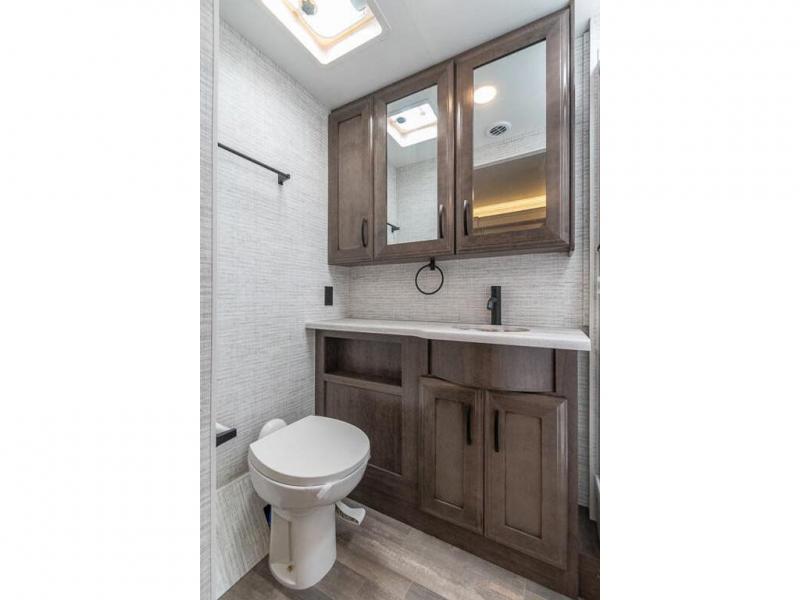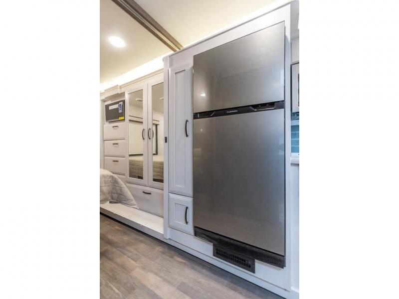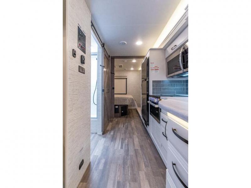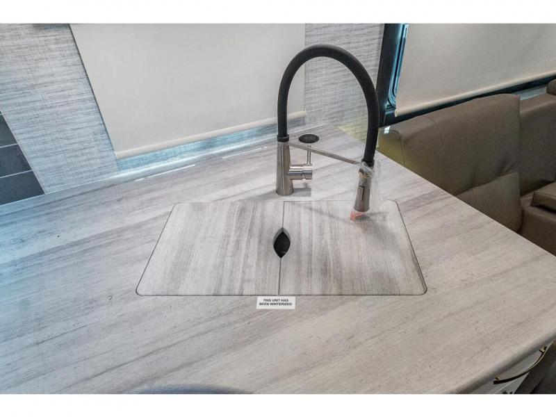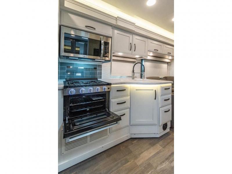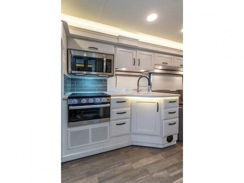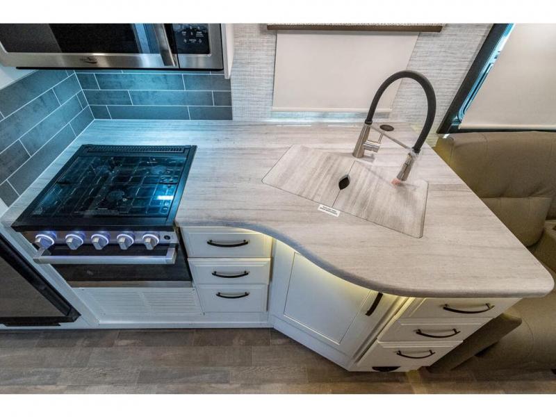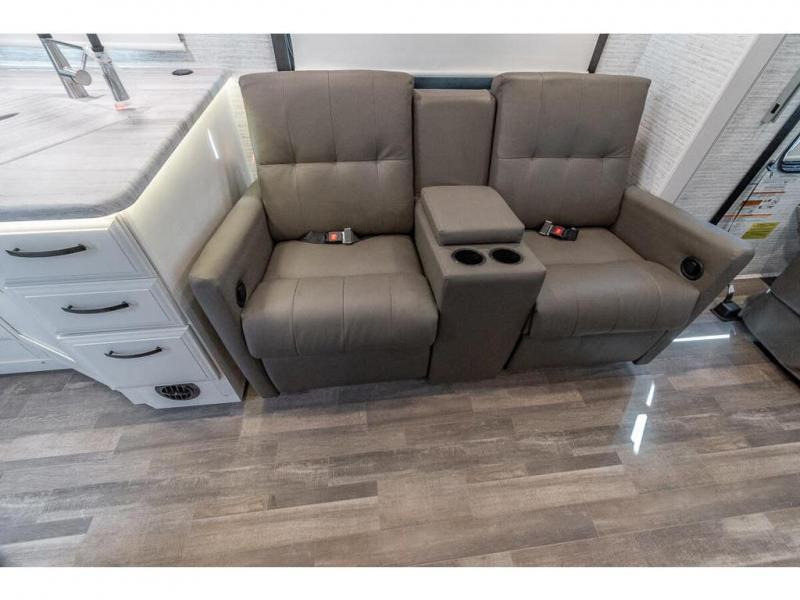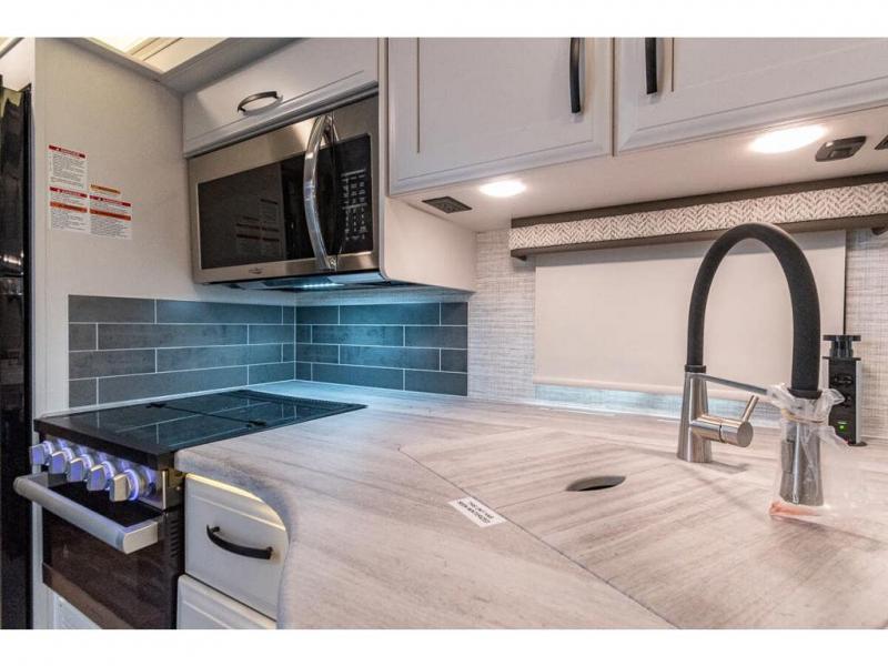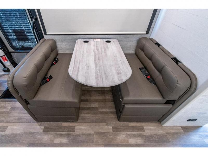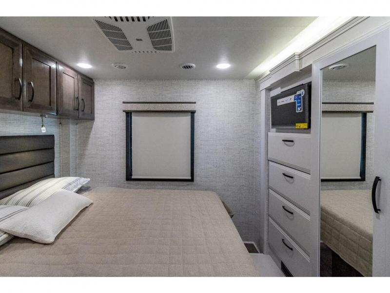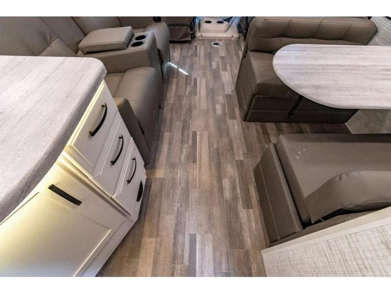 This Vision Class A gas motorhome has excellent interior living space with a full-wall slide! You'll fully enjoy the kitchen and the amenities it provides, like a residential-size microwave, a 10 cu. ft. 12V refrigerator, a Furrion all-in-one cooktop and oven, and a pantry. The 68" jack-knife sofa and booth dinette offer you lounging space after a full day of traveling, and the 39" LED HD Smart TV offers you some entertainment when you don't want to be active anymore. The exterior portion of this coach is also excellently appointed with an outdoor kitchen, exterior entertainment center with LED HD Smart TV, radio, and speakers, and a 23' electric awning with LED lights. You also have great choices of options for this coach with the optional theater seating, LED HDTV in the bedroom, or drop-down overhead cab bunk.