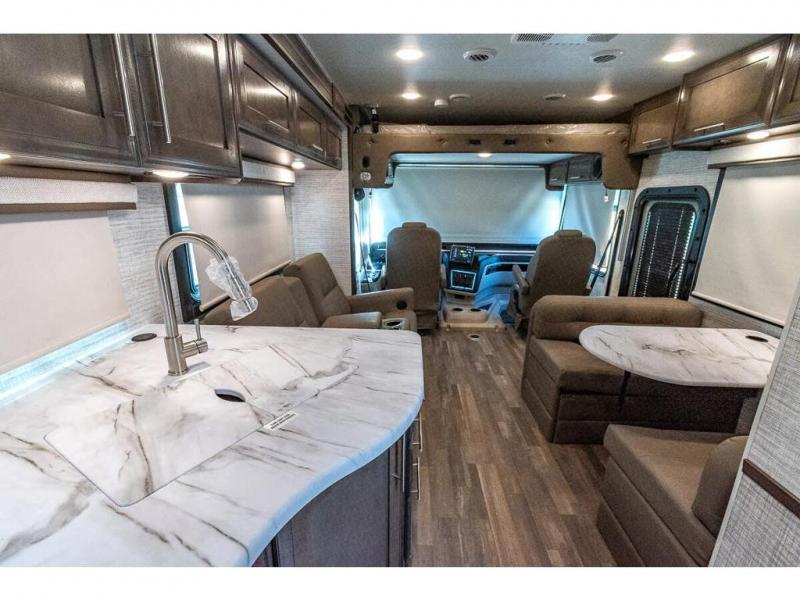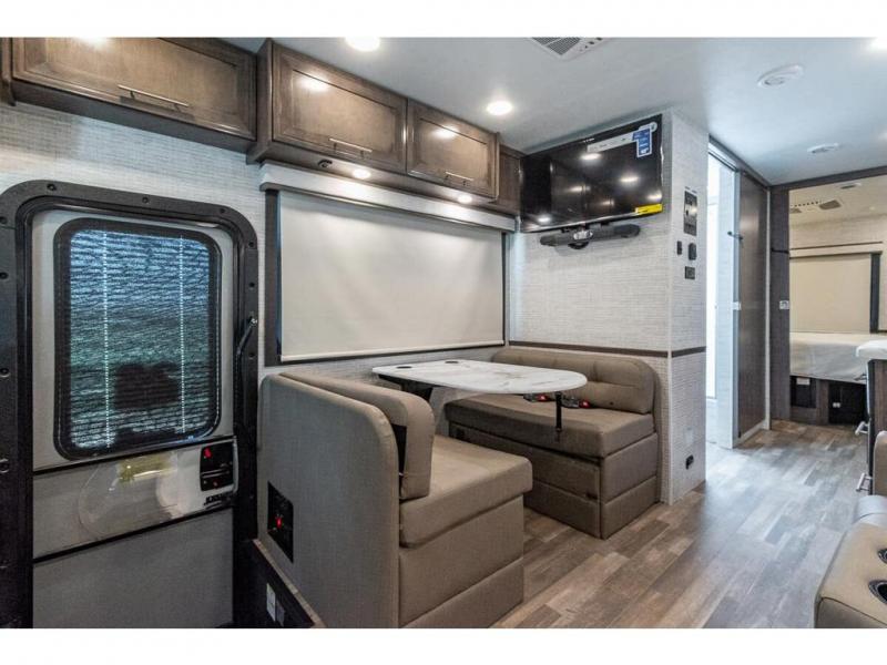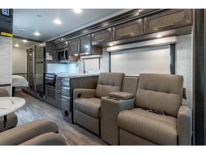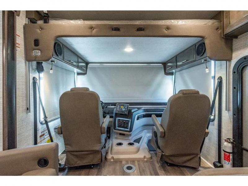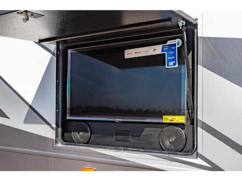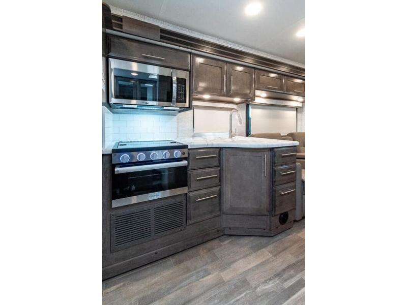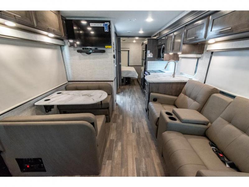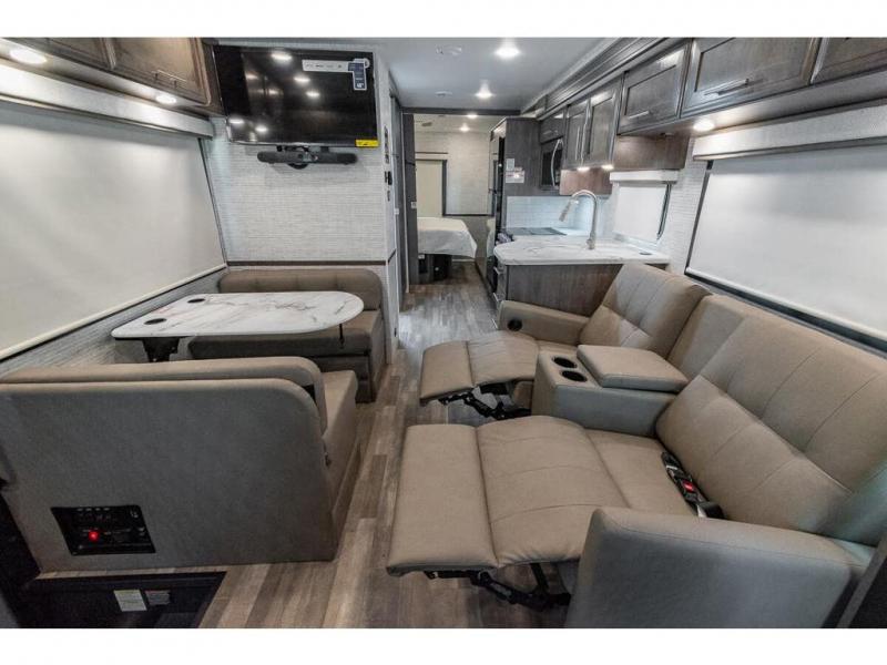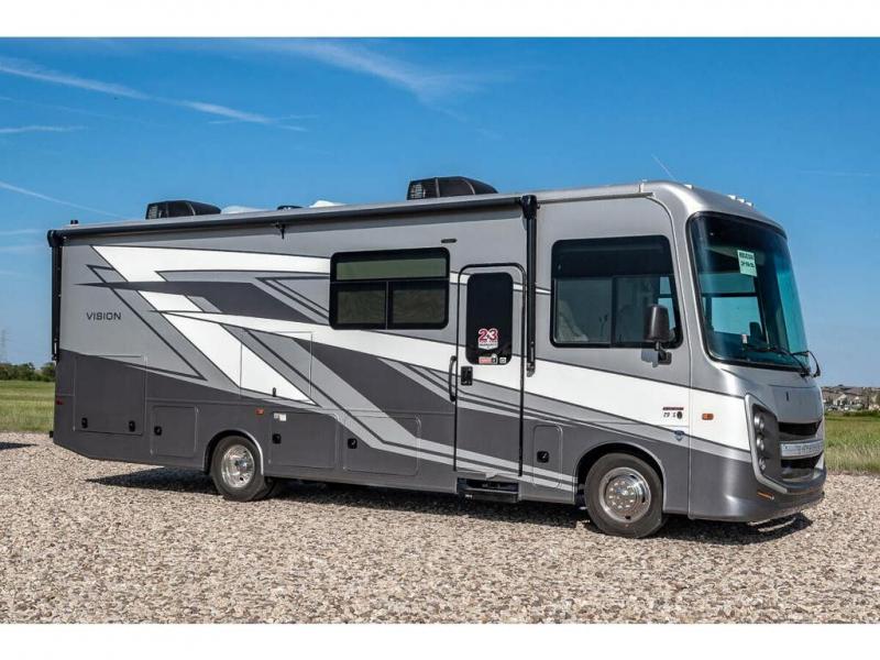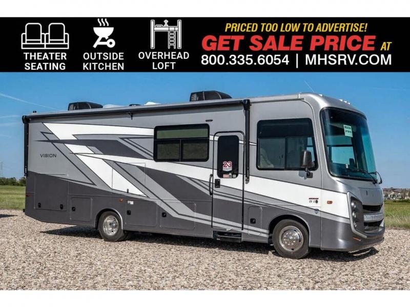 This Vision Class A gas motorhome has excellent interior living space with a full-wall slide! You'll fully enjoy the kitchen and the amenities it provides, like a residential-size microwave, a 10 cu. ft. 12V refrigerator, a Furrion all-in-one cooktop and oven, and a pantry. The 68" jack-knife sofa and booth dinette offer you lounging space after a full day of traveling, and the 39" LED HD Smart TV offers you some entertainment when you don't want to be active anymore. The exterior portion of this coach is also excellently appointed with an outdoor kitchen, exterior entertainment center with LED HD Smart TV, radio, and speakers, and a 23' electric awning with LED lights. You also have great choices of options for this coach with the optional theater seating, LED HDTV in the bedroom, or drop-down overhead cab bunk.
