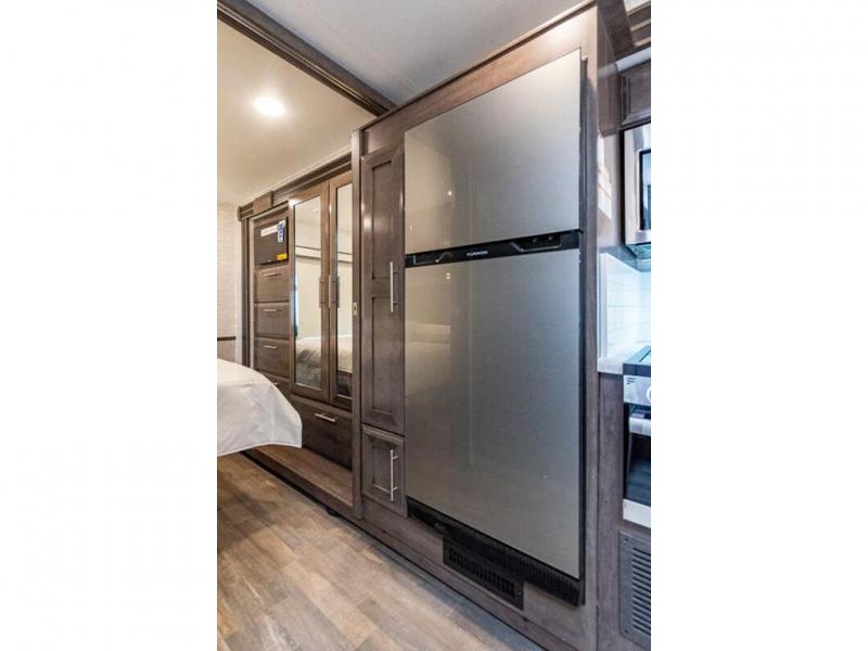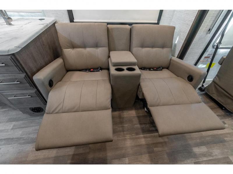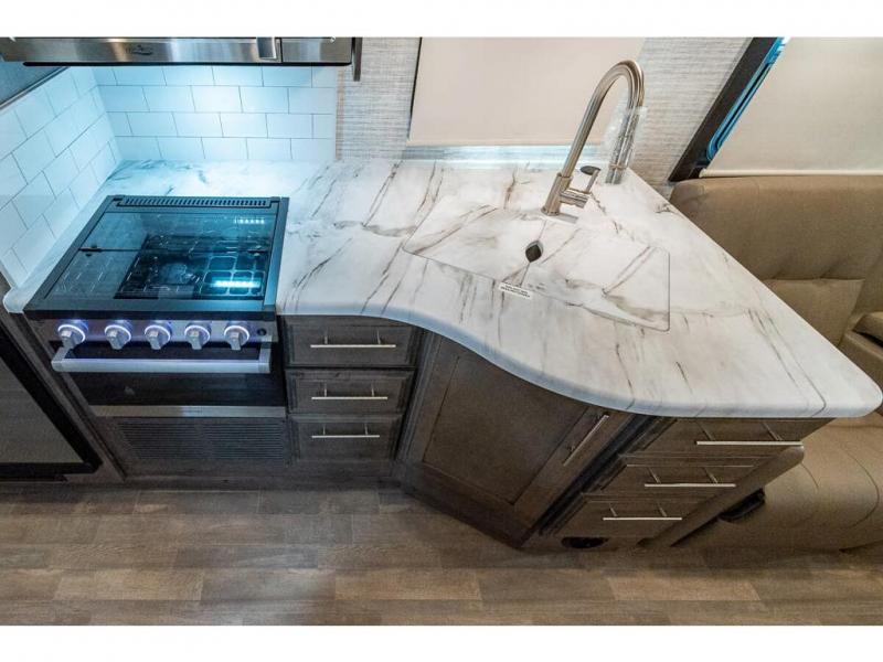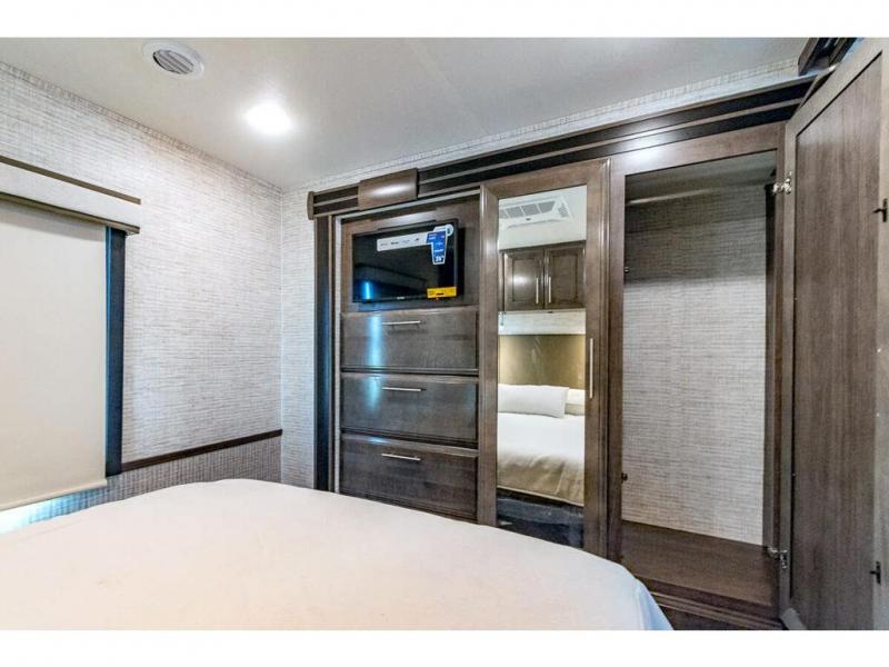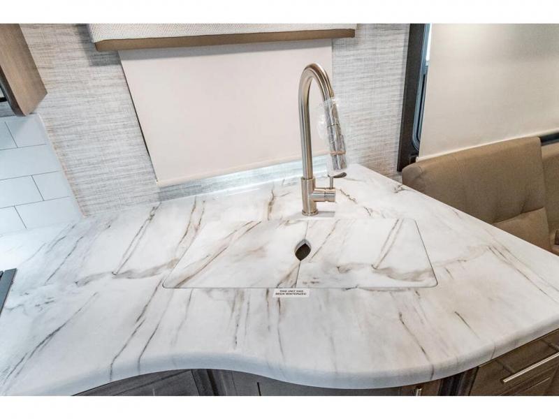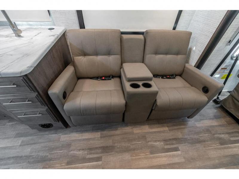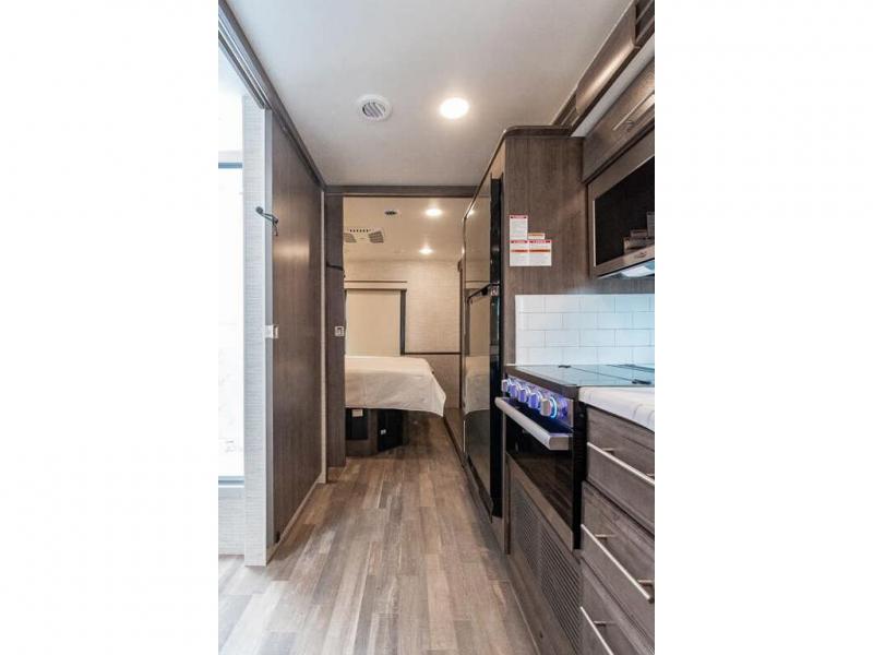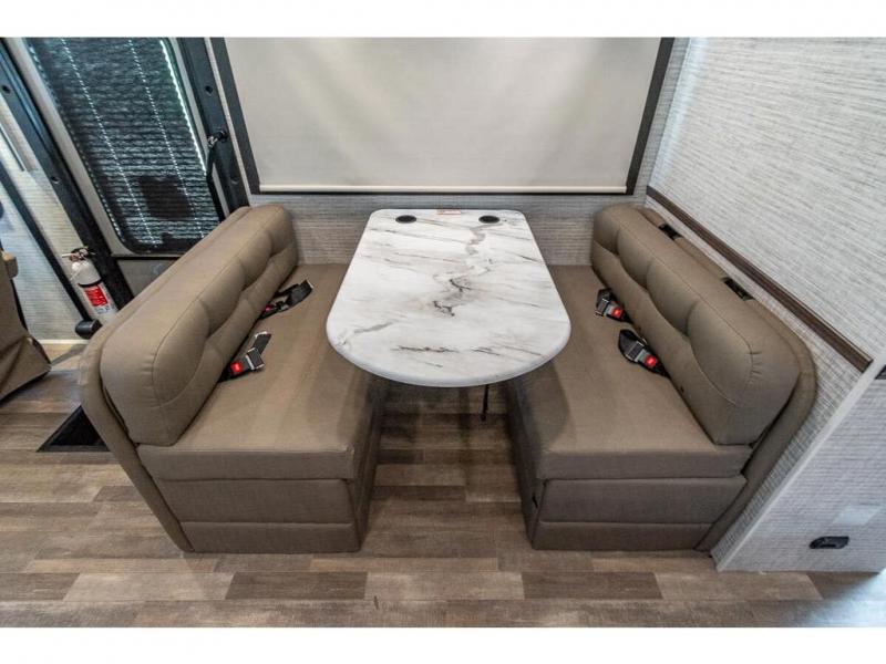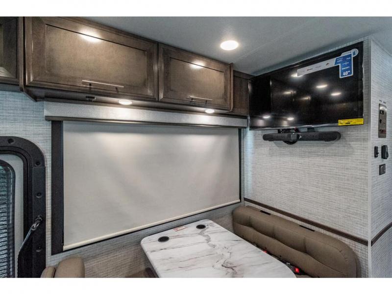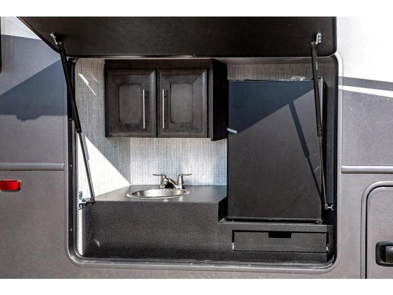 This Vision Class A gas motorhome has excellent interior living space with a full-wall slide! You'll fully enjoy the kitchen and the amenities it provides, like a residential-size microwave, a 10 cu. ft. 12V refrigerator, a Furrion all-in-one cooktop and oven, and a pantry. The 68" jack-knife sofa and booth dinette offer you lounging space after a full day of traveling, and the 39" LED HD Smart TV offers you some entertainment when you don't want to be active anymore. The exterior portion of this coach is also excellently appointed with an outdoor kitchen, exterior entertainment center with LED HD Smart TV, radio, and speakers, and a 23' electric awning with LED lights. You also have great choices of options for this coach with the optional theater seating, LED HDTV in the bedroom, or drop-down overhead cab bunk.