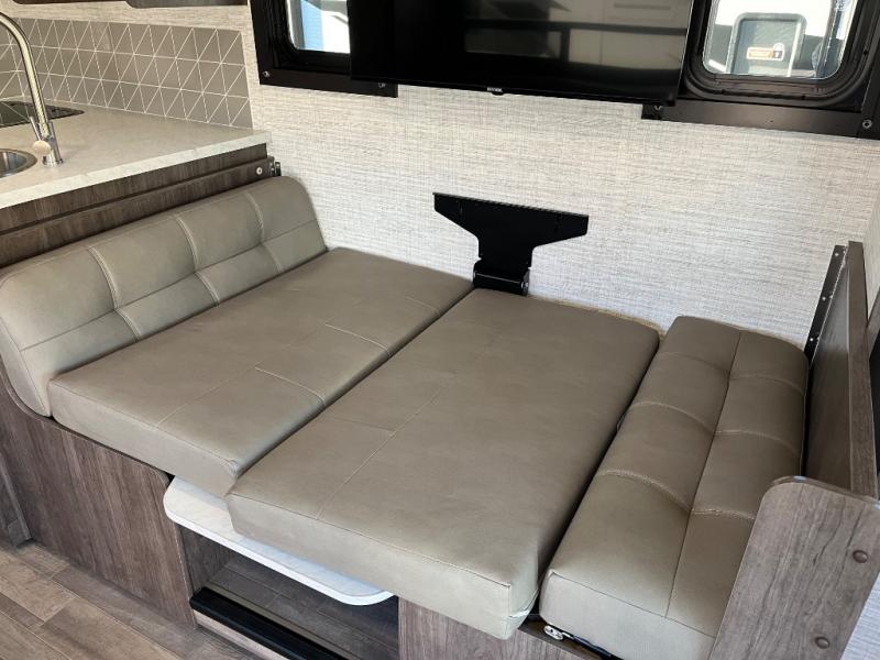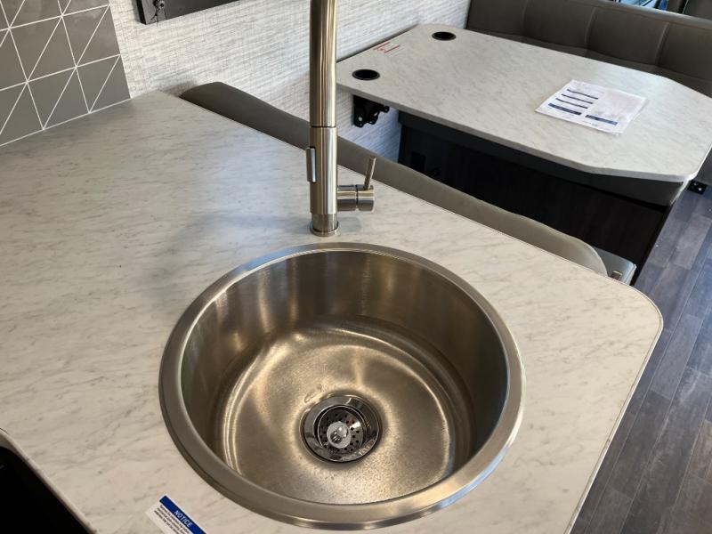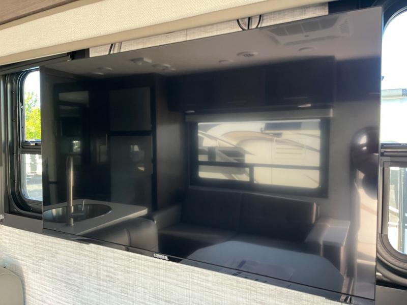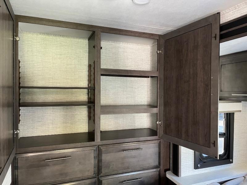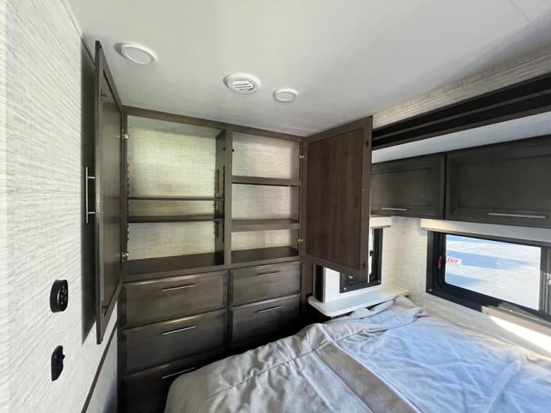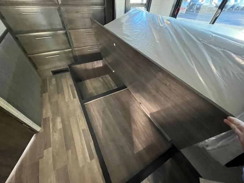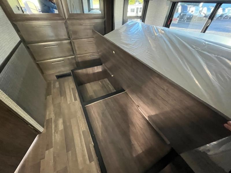 This coach is perfect for your crew of four to five, with the ability to sleep more if you choose the optional drop-down overhead bunk. Once you've arrived at your destination, the swivel captain's seats can be turned around to face the main living area so you can visit with those on the jack-knife sofa and booth dinette. A full kitchen, including a two burner cooktop and convection microwave oven will let you make meals each day, and the 10 cu. ft. 12V refrigerator will keep your food fresh. You'll love having your own space in the rear corner private bedroom that includes a king bed slide out and a spacious wardrobe. And you'll find the full bath in the other rear corner for quick and easy access at night!