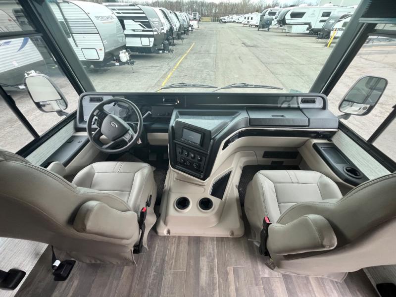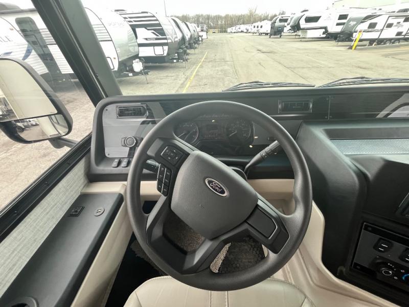 When you choose the Vision SE Class A gas motorhome by Entegra Coach, you're choosing an affordable coach packed with amenities! The Ford F53 chassis is ultra durable and the 7.3L V8 engine with 335HP will power your many adventures. There is an E-Z Drive system with a computer-balanced driveshaft, heavy-duty stabilizer bars, and more to provide you with a smooth drive, plus there is a 120 in. panoramic windshield for outstanding views as you travel. You can enjoy your coach for years to come thanks to the construction that features bead-foam insulation, a one-piece seamless crowned fiberglass roof, plus TuffShell vacuum-bond laminated sidewalls and floor. The interior will have you feeling right at home with hardwood cabinet doors and drawer fronts, a 7' ceiling height, decorative kitchen backsplash, plus a shower with decorative surround, glass door and skylight.