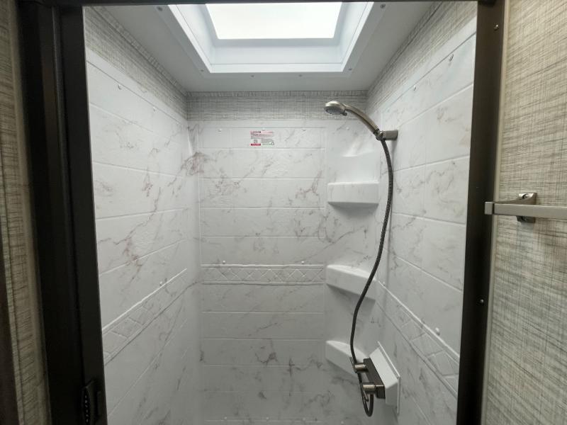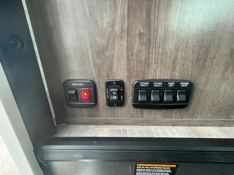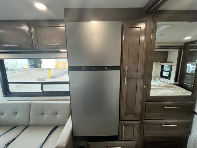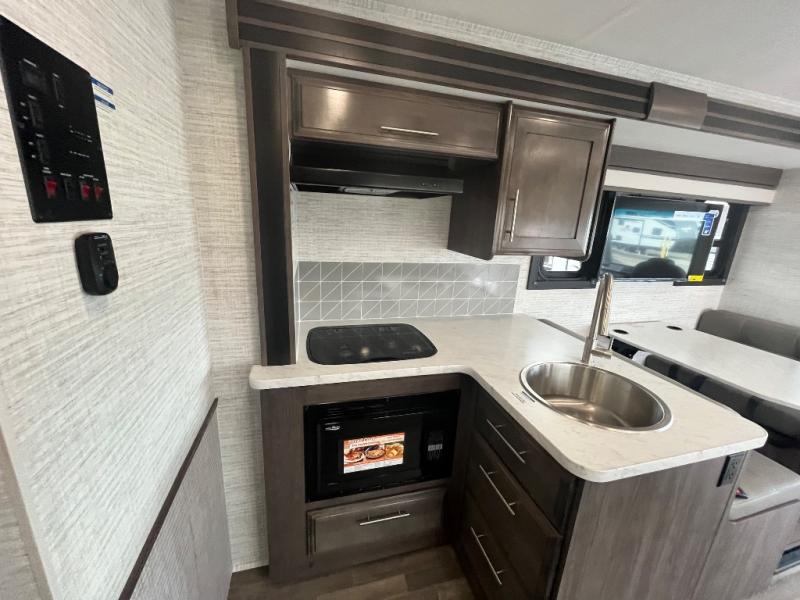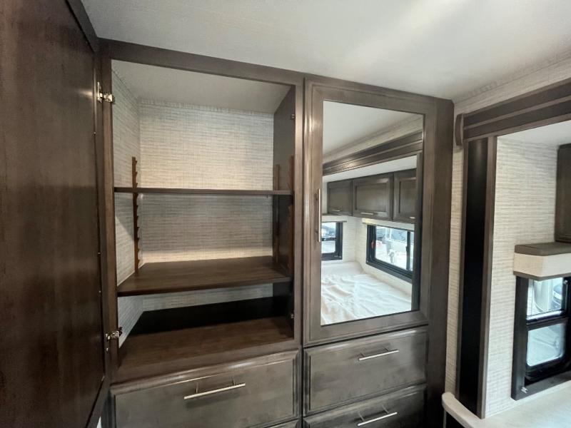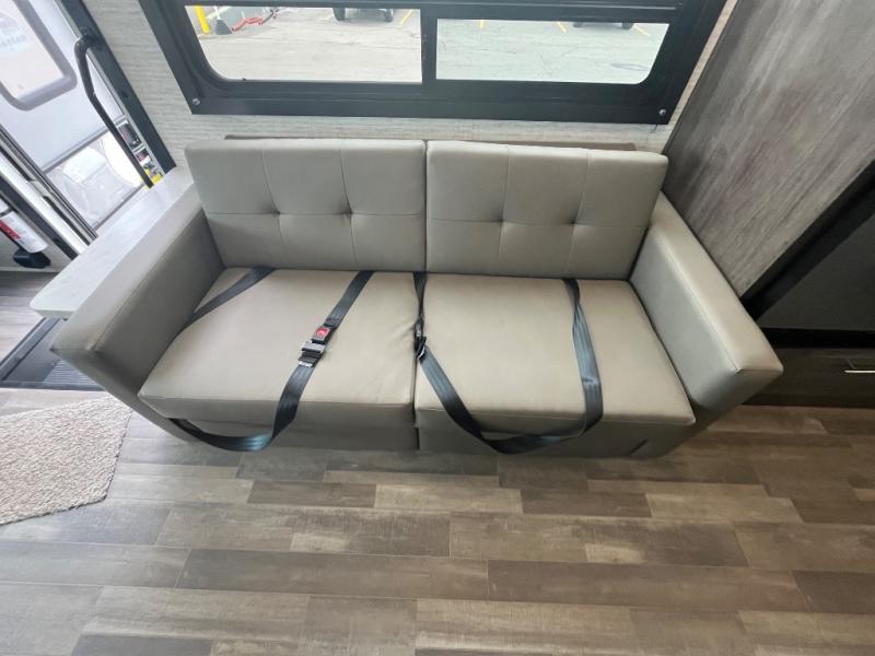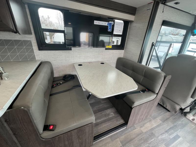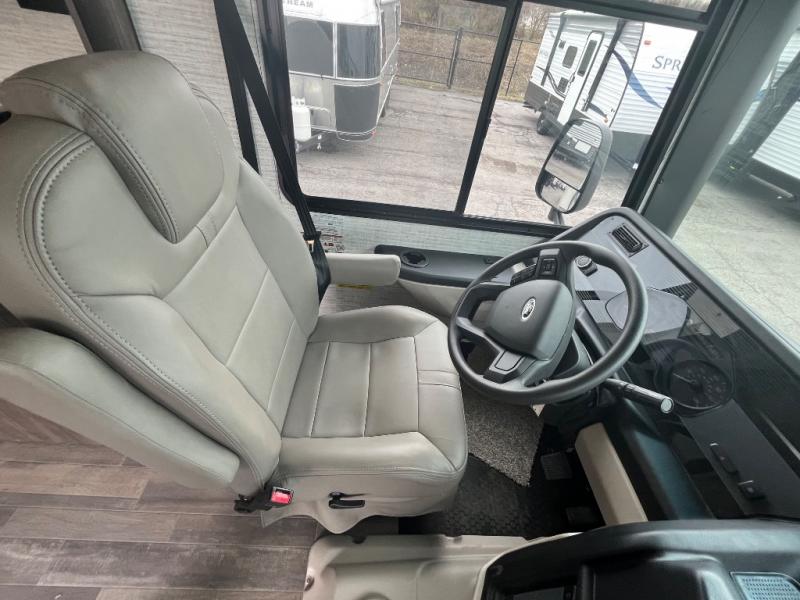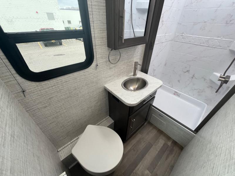 This coach is perfect for your crew of four to five, with the ability to sleep more if you choose the optional drop-down overhead bunk. Once you've arrived at your destination, the swivel captain's seats can be turned around to face the main living area so you can visit with those on the jack-knife sofa and booth dinette. A full kitchen, including a two burner cooktop and convection microwave oven will let you make meals each day, and the 10 cu. ft. 12V refrigerator will keep your food fresh. You'll love having your own space in the rear corner private bedroom that includes a king bed slide out and a spacious wardrobe. And you'll find the full bath in the other rear corner for quick and easy access at night!