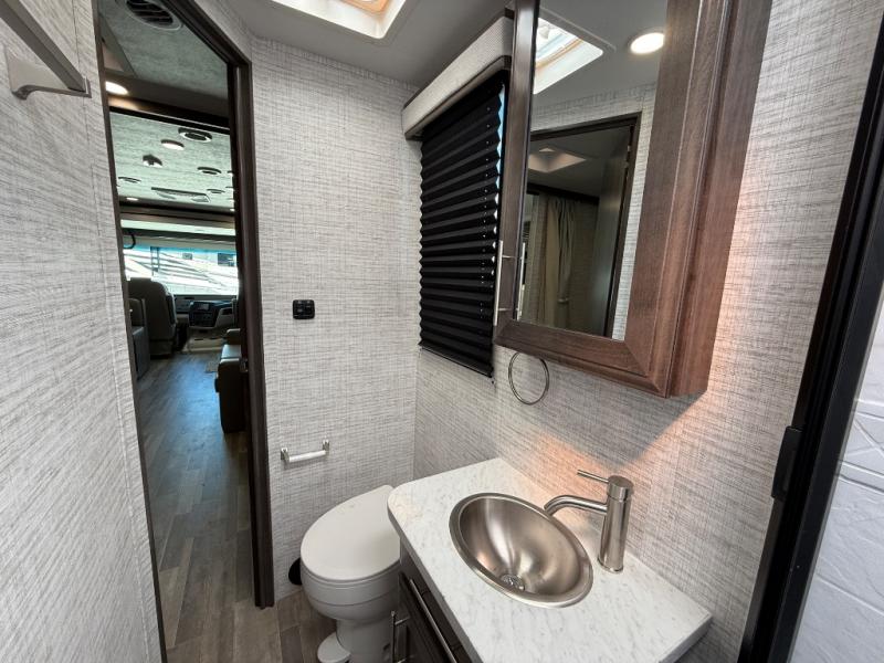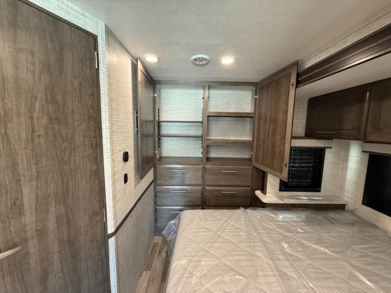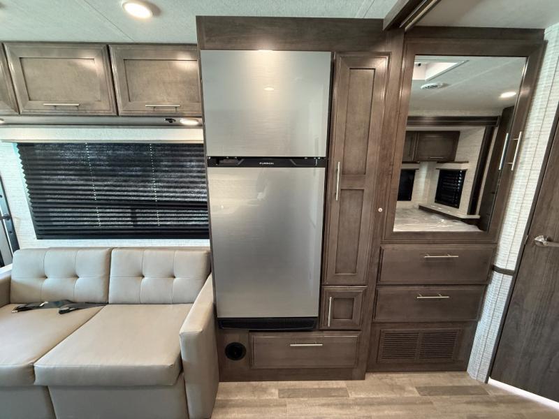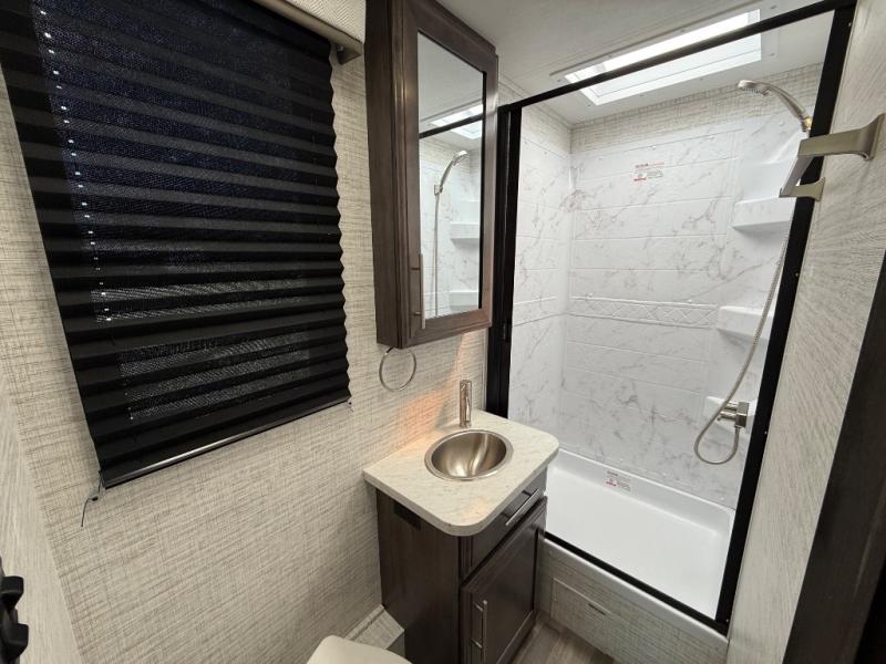 This coach is perfect for your crew of four to five, with the ability to sleep more if you choose the optional drop-down overhead bunk. Once you've arrived at your destination, the swivel captain's seats can be turned around to face the main living area so you can visit with those on the jack-knife sofa and booth dinette. A full kitchen, including a two burner cooktop and convection microwave oven will let you make meals each day, and the 10 cu. ft. 12V refrigerator will keep your food fresh. You'll love having your own space in the rear corner private bedroom that includes a king bed slide out and a spacious wardrobe. And you'll find the full bath in the other rear corner for quick and easy access at night!