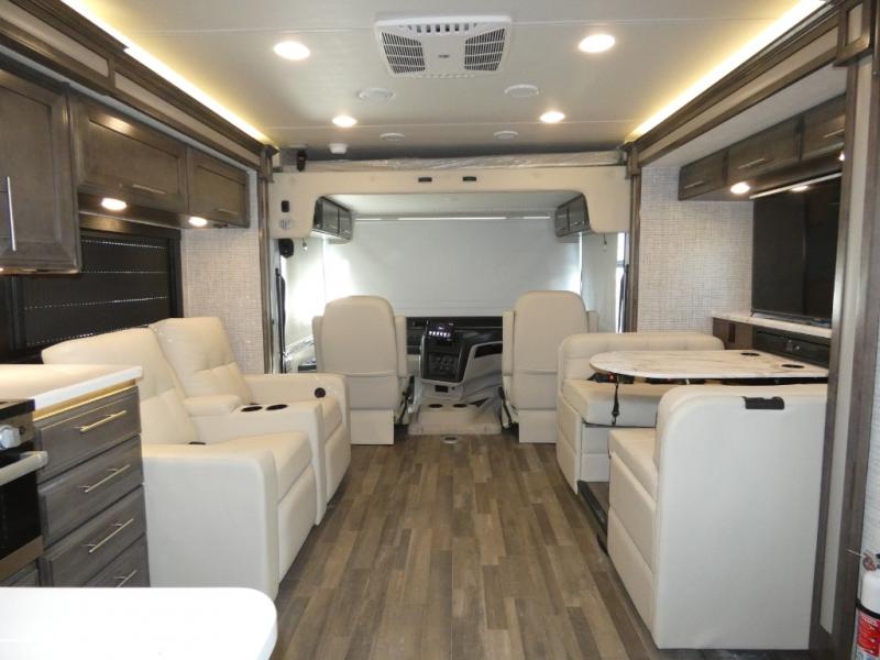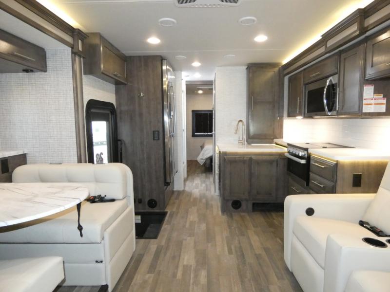 This motorhome has everything you need for a relaxing getaway! Go out alone, or invite a few extra travelers to join you and crash on the drop down bunk or the 38" x 70" booth dinette. It will be a piece of cake to enjoy a piece of cake thanks to the Furrion all-in-one cooktop and oven, the residential refrigerator, and the residential microwave will give you everything you need to prepare a batter and bake it. You'll also be able to stay entertained throughout each trip by using the 50" LED HD Smart TV in the living area, the LED HD Smart TV in the bedroom, and the exterior LED HD Smart TV at the outside entertainment center. Everyone can stay squeaky clean with the separated bathroom that has a 30" x 36" shower on one side and a private toilet and sink on the other side!