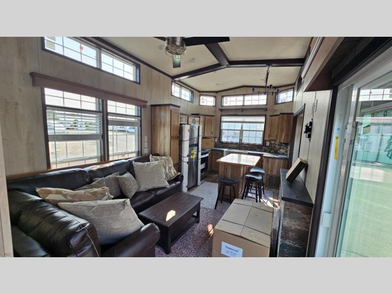 Head out on adventure in this spacious park model. You will love the front kitchen with tons of counter space and a four burner cooktop to prepare meals at. There is an entertainment center where you can add a TV, and the kitchen island will provide more counter space. This model includes a pantry to store dry goods and snacks, a chalkboard the little ones are sure to love, and a space to add an optional washer and dryer if you choose. Don't let this model pass you by!