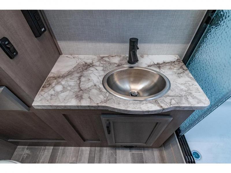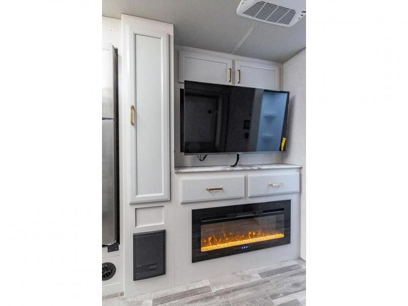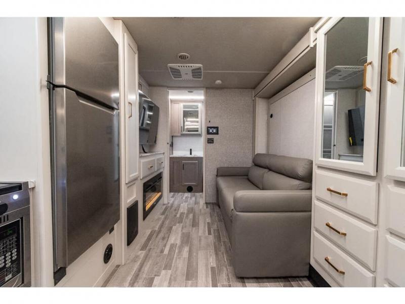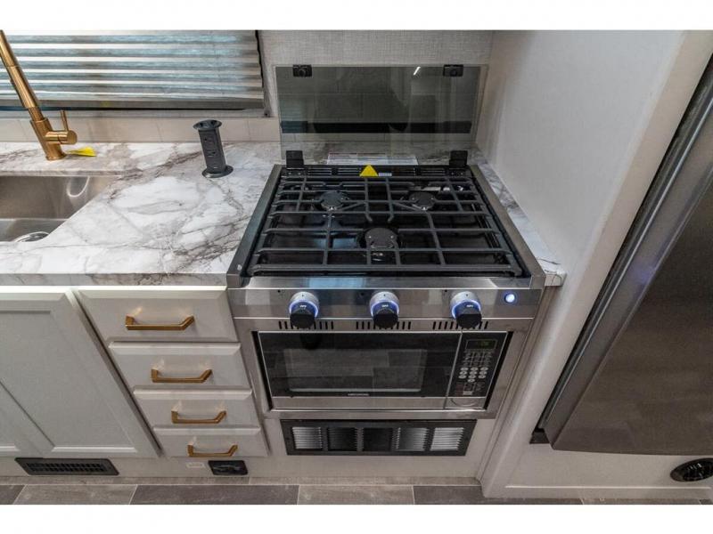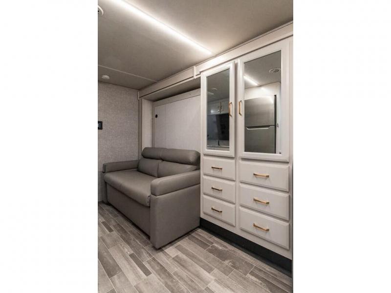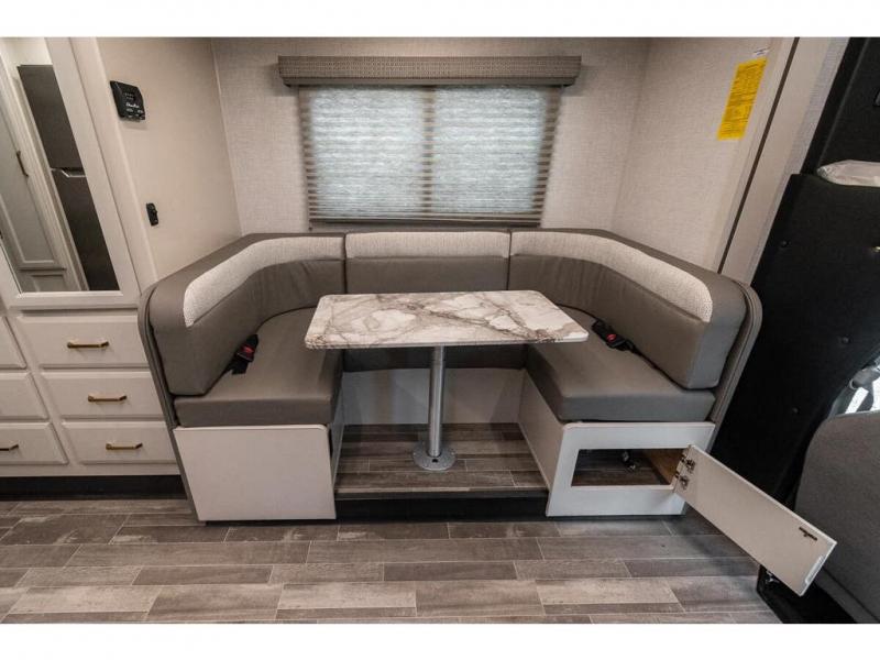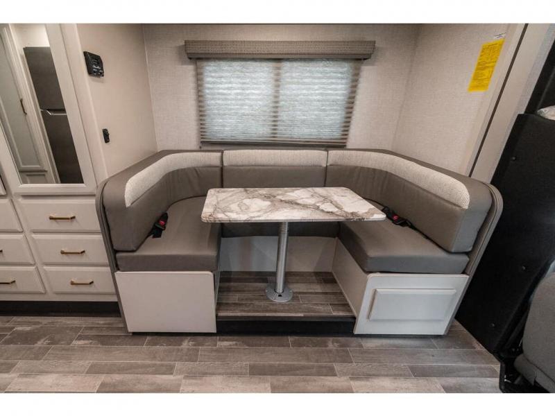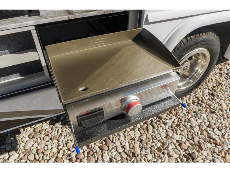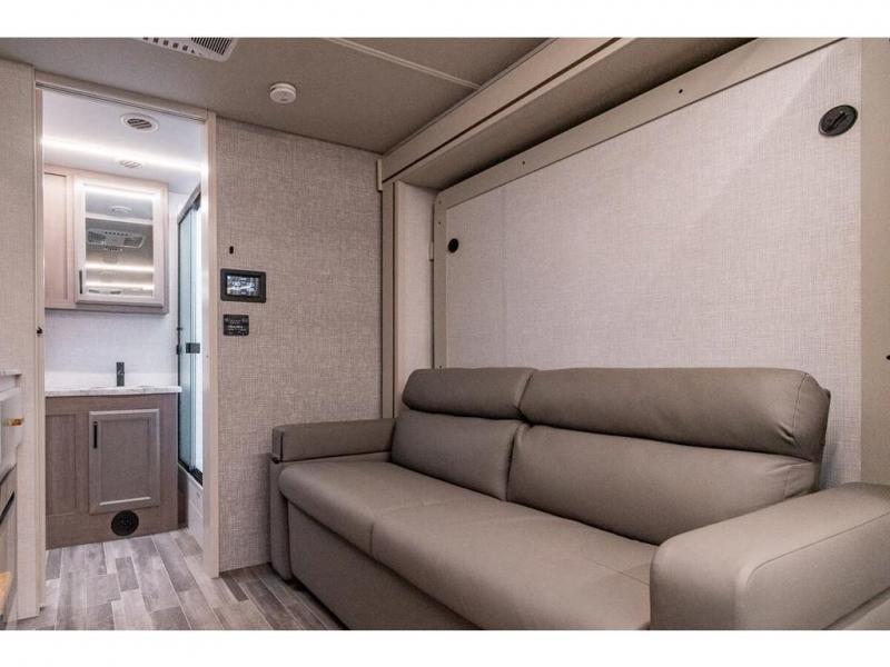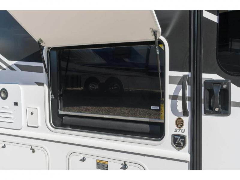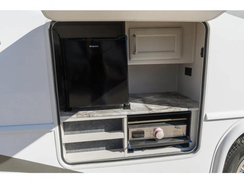 Pack your bags and head off on new adventures in this spacious coach! You will love gathering around the U-shaped dinette for a game or a meal, and the full-wall slide provides ample space to move around. An overhead bunk provides sleeping space for little ones or to be used as extra storage space. Since there is a queen Murphy bed, you will enjoy versatile seating and sleeping space, and the full rear bath will allow you to freshen up each day without having to use the camp's facilities. This model also includes a three burner range/convection microwave combo to cook meals on plus an exterior kitchen with a mini fridge, pull-out griddle, and storage when the weather is nice!
