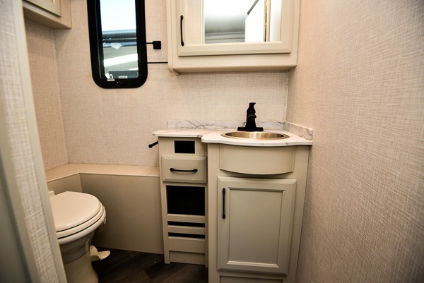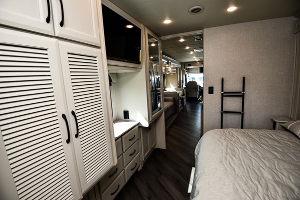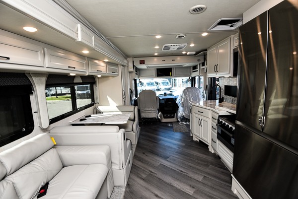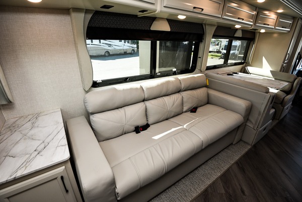 When you are ready to travel the countryside, this coach will get you there in comfort with luxury and residential features that you deserve. The driver and passenger will love the automotive style dash with color monitor and workstation, plus the pedestal table in between. Once you have setup for the evening, you might enjoy reclining back in the chairs or sitting on the jackknife sofa that offers guests a place to stay the night, along with the rest EZ dinette and the optional Hide-A-Loft power overhead bunk if you added that feature. Your guests can use the mid-coach half bath while you have your own master suite with a king bed slide and storage, plus a full rear bathroom all to yourself.