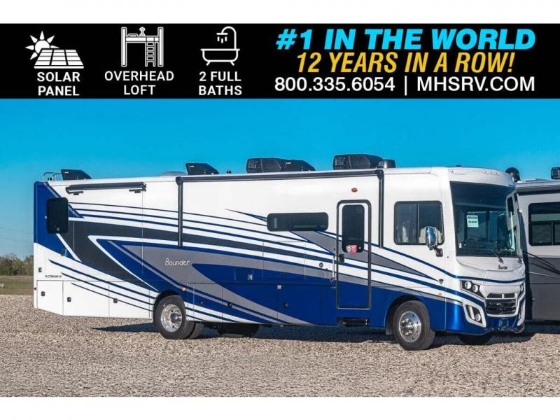 MSRP $307,624. New 2025 Fleetwood Bounder RV for sale at Motor Home Specialist, the #1 Volume Selling Motor Home Dealership in the World. This motorhome is 38 feet 9 inches in length and features 2 full bath, bunk beds, the Ford 7.3 Triton V8 engine, dual pane frameless windows, auto gen start, remote powered heated mirrors with turn signals with side view cameras, auto leveling jack controls, residential refrigerator, large living room LED TV, reinforced exterior storage, soft touch vinyl ceiling, automotive one-piece windshield and much more. Options include the steering wheel stereo control, 3 burner range with oven, combo washer dryer, motion power lounge, drop down queen loft, wireless dash stereo, electric power cord reel, sumo springs in the front and rear, steering stabilizer system, as well as the Ford Driver Assist Tech Package which includes automatic emergency braking, distance alert, adaptive cruise, lane departure warning, alert & message system, and auto high beam control. For additional details on this unit and our entire inventory including brochures, window sticker, videos, photos, reviews & testimonials as well as additional information about Motor Home Specialist and our manufacturers please visit us at MHSRV.com or call 800-335-6054. At Motor Home Specialist, we DO NOT charge any prep or orientation fees like you will find at other dealerships. All sale prices include a 200-point inspection, interior & exterior wash, detail service and a fully automated high-pressure rain booth test and coach wash that is a standout service unlike that of any other in the industry. You will also receive a thorough coach orientation with an MHSRV technician, a night stay in our delivery park featuring landscaped and covered pads with full hook-ups and much more! Read Thousands upon Thousands of 5-Star Reviews at MHSRV.com and See What They Had to Say About Their Experience at Motor Home Specialist. WHY PAY MORE? WHY SETTLE FOR LESS?