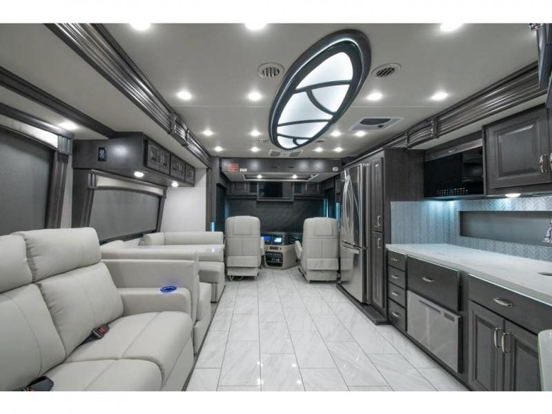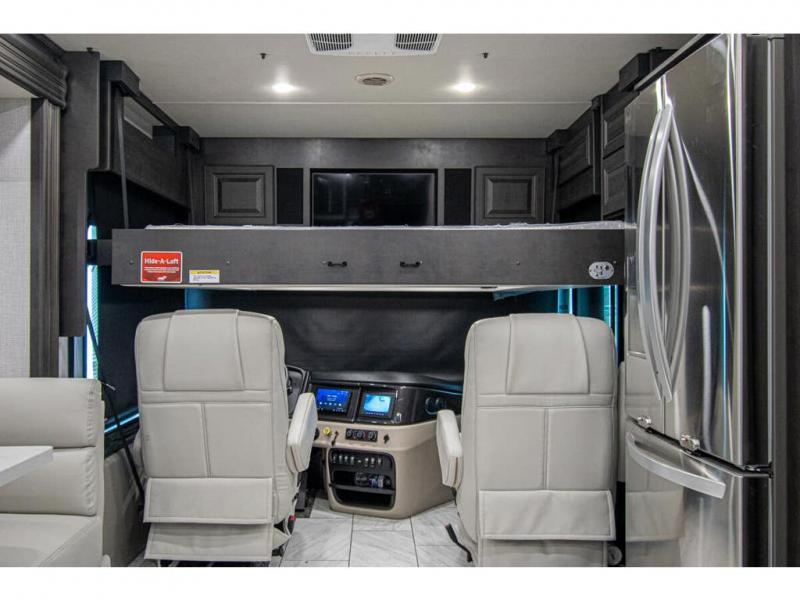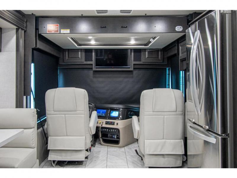 With any Fleetwood Discovery Class A diesel motorhome, the Freedom Bridge custom chassis, the V-Ride rear suspension, and the Cummins B6.7 engine offer a smooth and enjoyable ride to all your destinations. The construction also includes the Powerlock System with interlocking floor, walls and roof, heated fresh water and holding tank compartments, and a full coverage heavy duty undercoating. The interior cabin includes an LED OptiView instrument panel, an air suspension deflation system, and a 10.2" stereo touch screen with lots of functions making traveling easier. And you will love the style of the interior decor and cabinetry, energy efficient LED flush mount ceiling lighting, polished solid surface galley countertop with lighting, residential features throughout, and all the entertainment. Choose to travel and live better in a Discovery!
