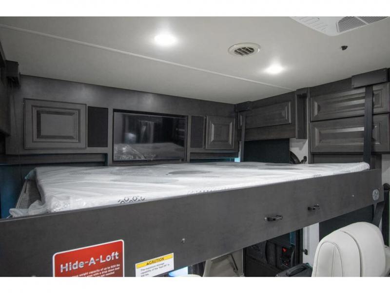 This coach offers a family or a couple that enjoys entertaining overnight guests plenty of sleeping space with the convertible bunk beds with barn doors. You can sleep even more guests when the optional Hide-A-Bed power drop-down overhead bunk is added, plus the sofa sleeper with pull-out twin bed and the booth dinette. The main living area also has an LED TV with a fireplace below and an LED TV over the cab to watch. The two full bathrooms shorten the waiting lines, and are convenient for all. The rear bathroom that is attached to the master bedroom even has a bedroom wardrobe. The bedroom provides a king bed slide for more floor space, and a side-by-side washer/dryer to keep everything clean while on the road, an LED TV to watch before bedtime, and more clothing storage. The kitchen offers stainless steel appliances, a convection microwave, an induction cooktop and so much more!
