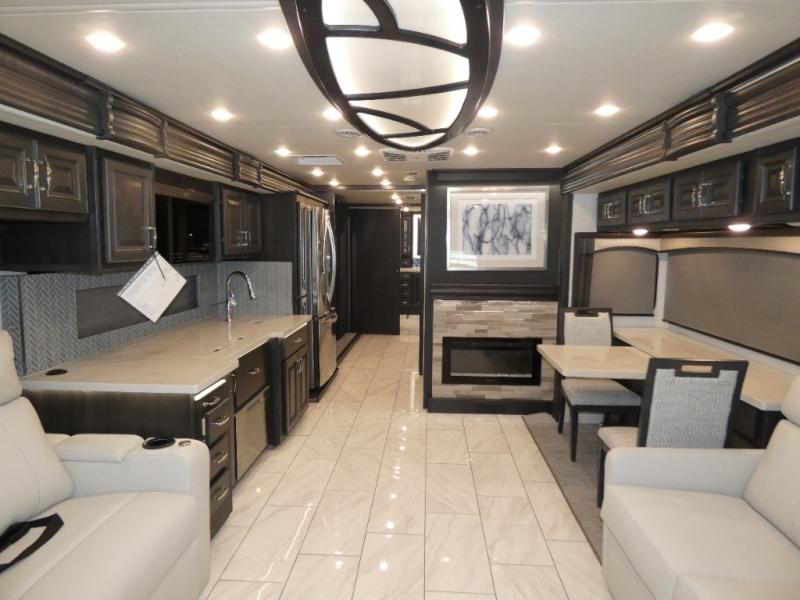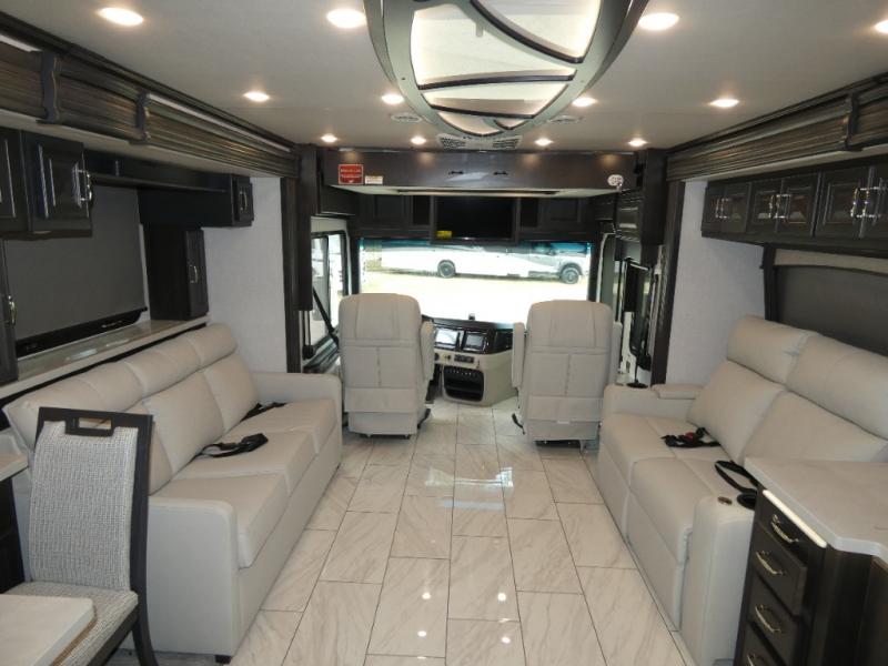 With any Fleetwood Discovery Class A diesel motorhome, the Freedom Bridge custom chassis, the V-Ride rear suspension, and the Cummins B6.7 engine offer a smooth and enjoyable ride to all your destinations. The construction also includes the Powerlock System with interlocking floor, walls and roof, heated fresh water and holding tank compartments, and a full coverage heavy duty undercoating. The interior cabin includes an LED OptiView instrument panel, an air suspension deflation system, and a 10.2" stereo touch screen with lots of functions making traveling easier. And you will love the style of the interior decor and cabinetry, energy efficient LED flush mount ceiling lighting, polished solid surface galley countertop with lighting, residential features throughout, and all the entertainment. Choose to travel and live better in a Discovery!