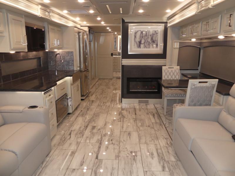 You will love traveling with friends and family in this spacious and luxurious coach. The full rear bath features dual bath sinks, a tile shower with a seat, plus a stackable washer and dryer. You will have plenty of space for your clothes in the dual bedroom wardrobes, and the Encore Series king bed is sure to bring comfort. The chef of your group will love cooking in the kitchen on the two burner induction cooktop, and there is a pull-out galley top here for more counter space. Your guests can relax on the sofa sleeper with full mattress, the sofa, or dine at the free-standing dinette with Credenza. There are four TV's found throughout this model, including an exterior entertainment center with an added Bluetooth speaker!