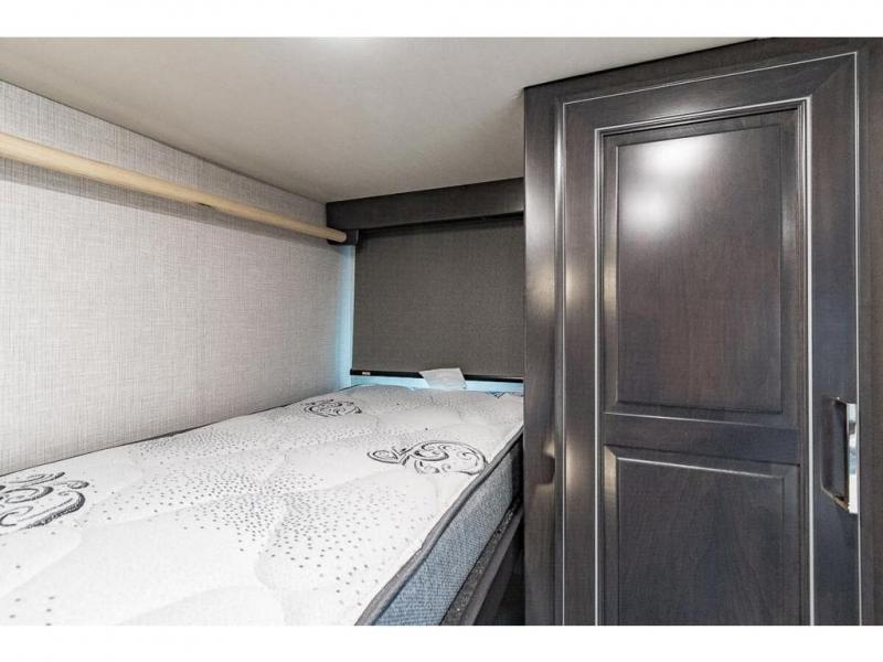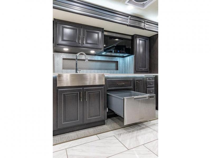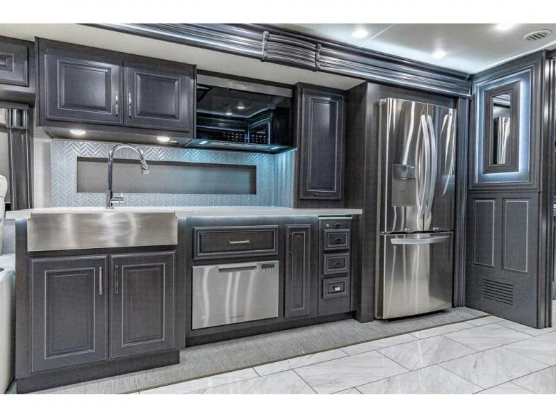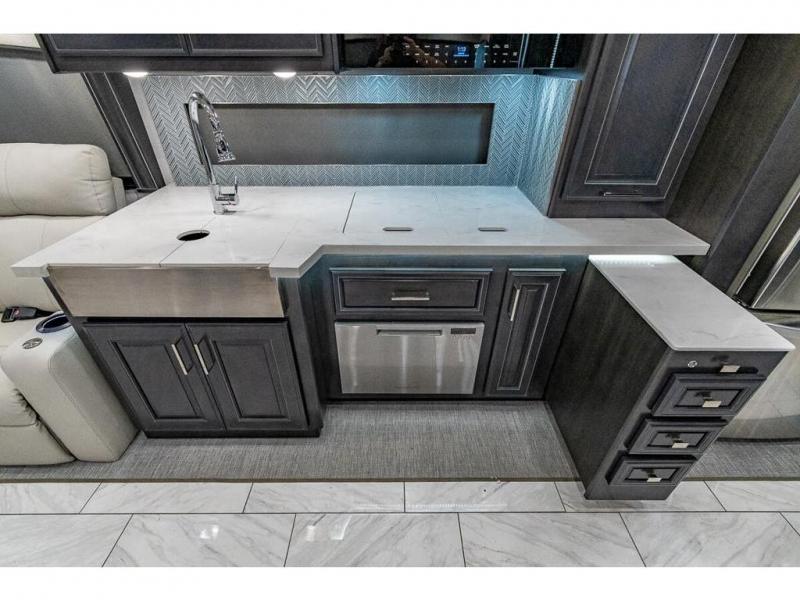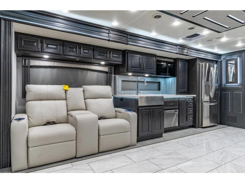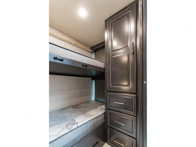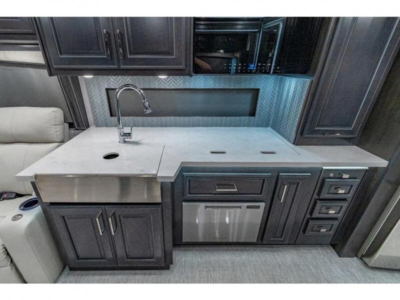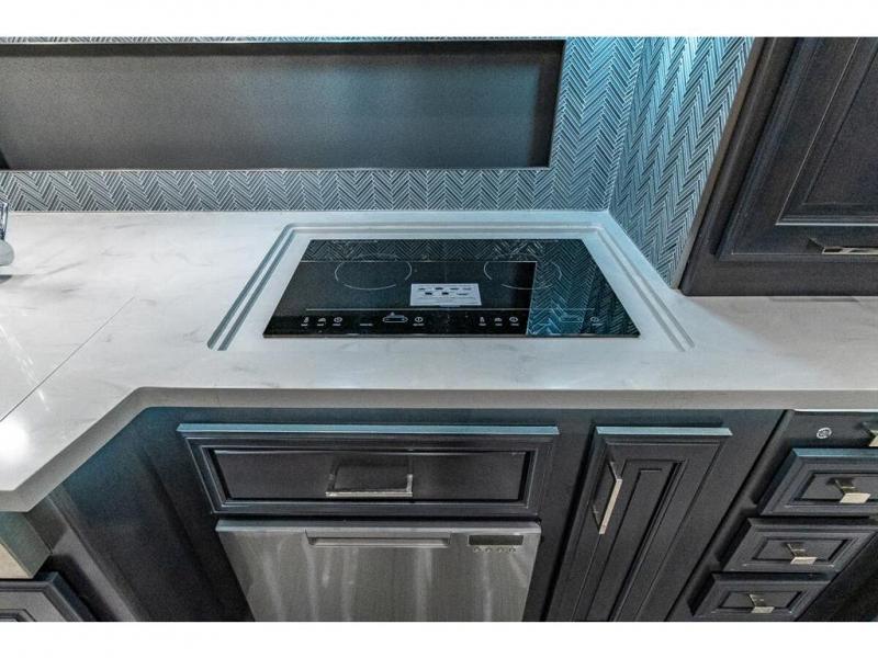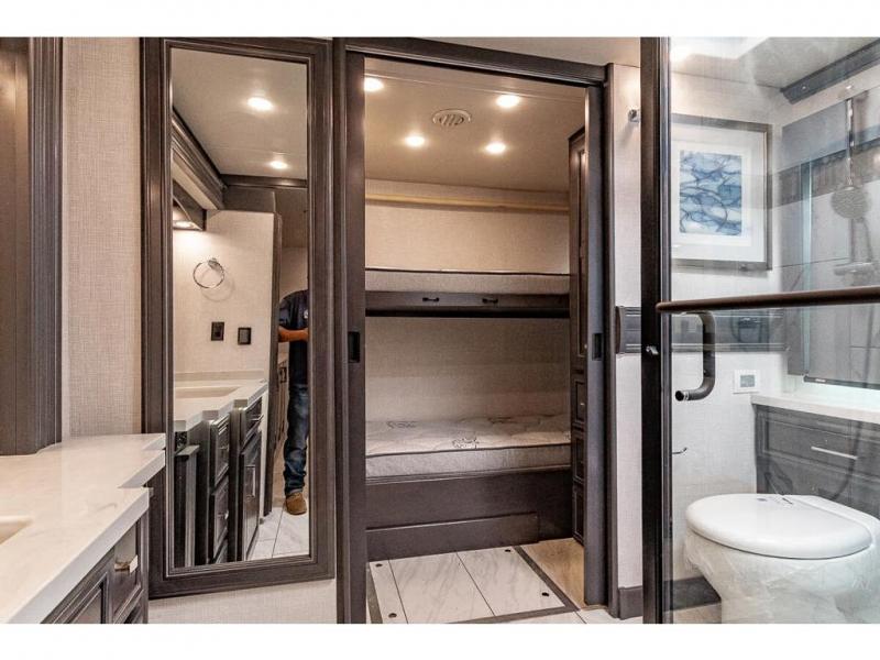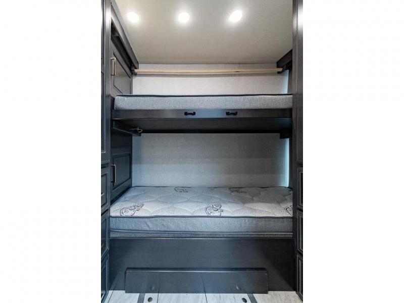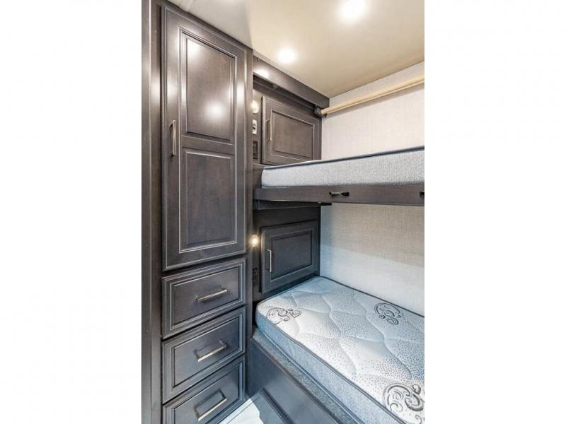 Trips across the country just got sweeter in this four slide out coach that can sleep nine people each night. The rear bunk beds can convert to a wardrobe, and there additional storage here for clothes and belongings. The master bedroom features a LED TV, a side-by-side washer and dryer, and a luxurious Encore Series king bed. This Discovery LXE includes everything you need each day to prepare meals for your crew, including a two burner induction cooktop, a convection microwave, plus a residential refrigerator with ice and water in the door. There are plenty of seating spaces to enjoy, including a U-shaped dinette, a sofa sleeper with a pull-out queen bed, and a sofa with ottomans!