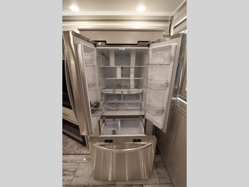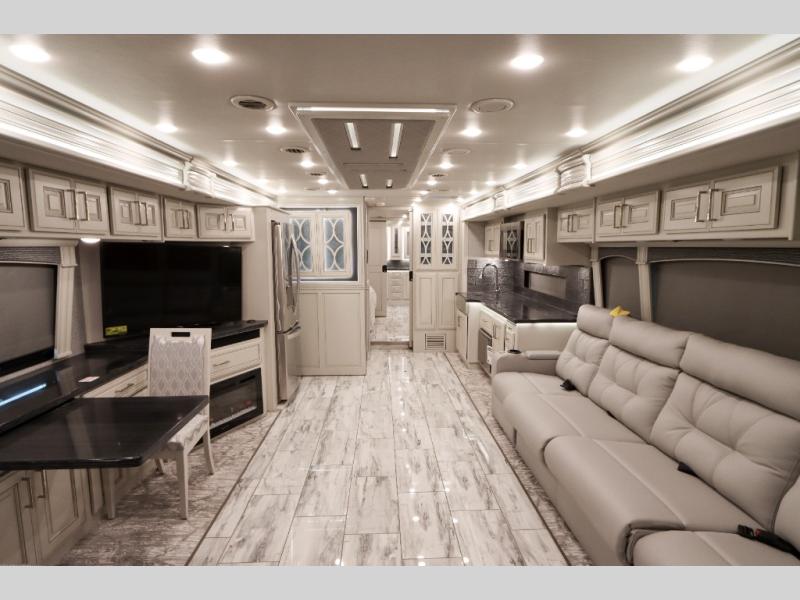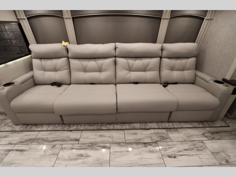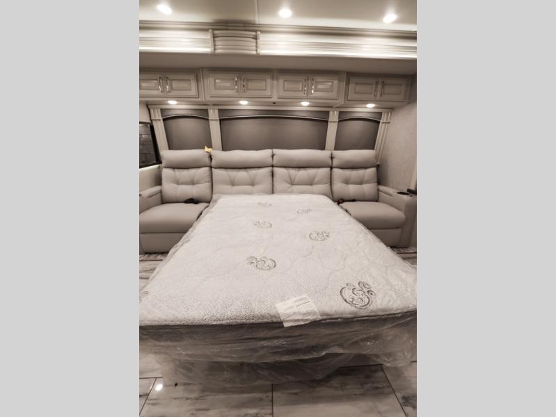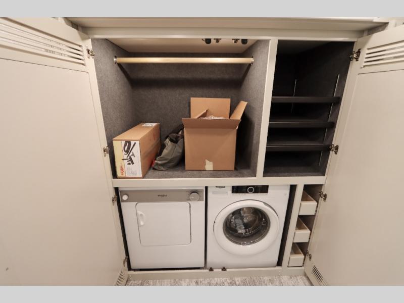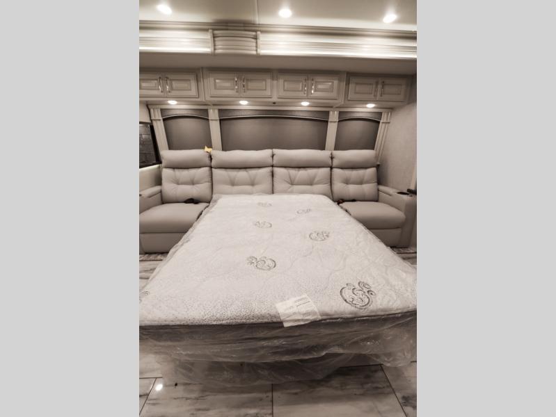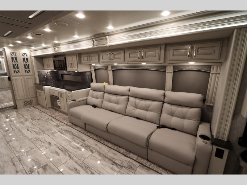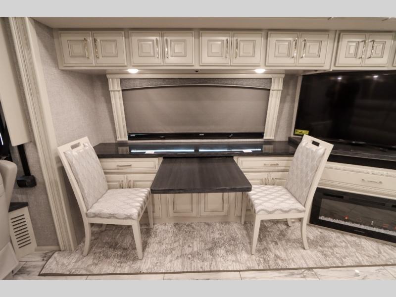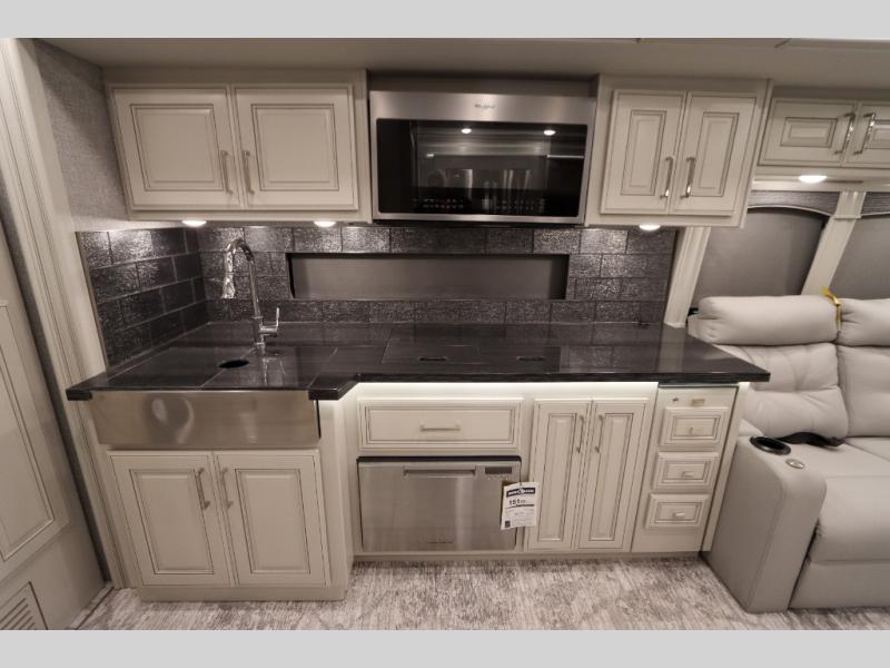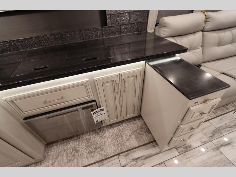 Going full-time has never been easier than in this coach with four slides, a bath and a half, and a huge master suite! You can wake up each morning in your king bed slide out, and catch up on the news with your pop-up LED TV. The rear bath includes a dual sink vanity so you both can get ready at the same time, and there is even a private lavy for convenience. The master suite also includes a hanging wardrobe storage with a washer and dryer to make wash day a breeze. Head to the main living area to make breakfast on the two burner induction cooktop, or use the convection microwave. There is a residential refrigerator with ice and water in the door, plus a dishwasher drawer for added convenience. Your crew will love to relax on the power motion lounges that sit on either side of the sofa sleeper with a full mattress, and there is a free-standing dinette with Credenza for your morning cup of joe!
