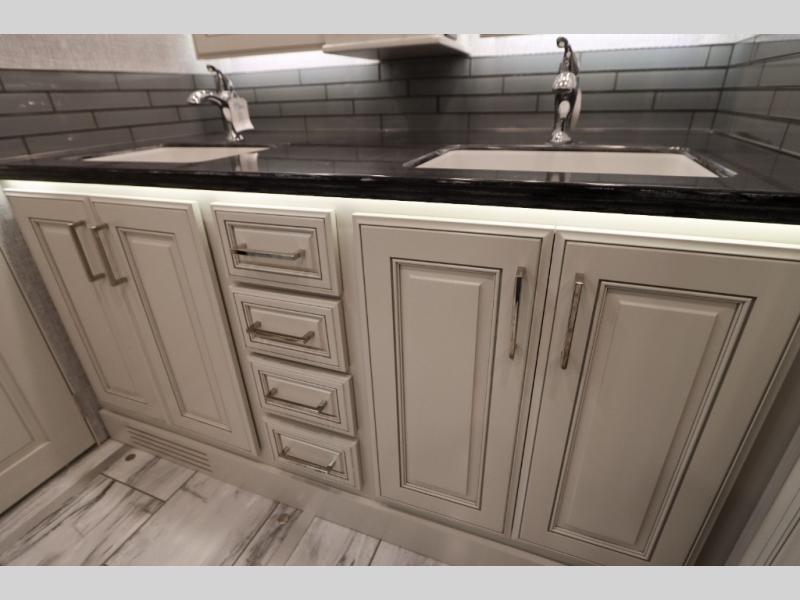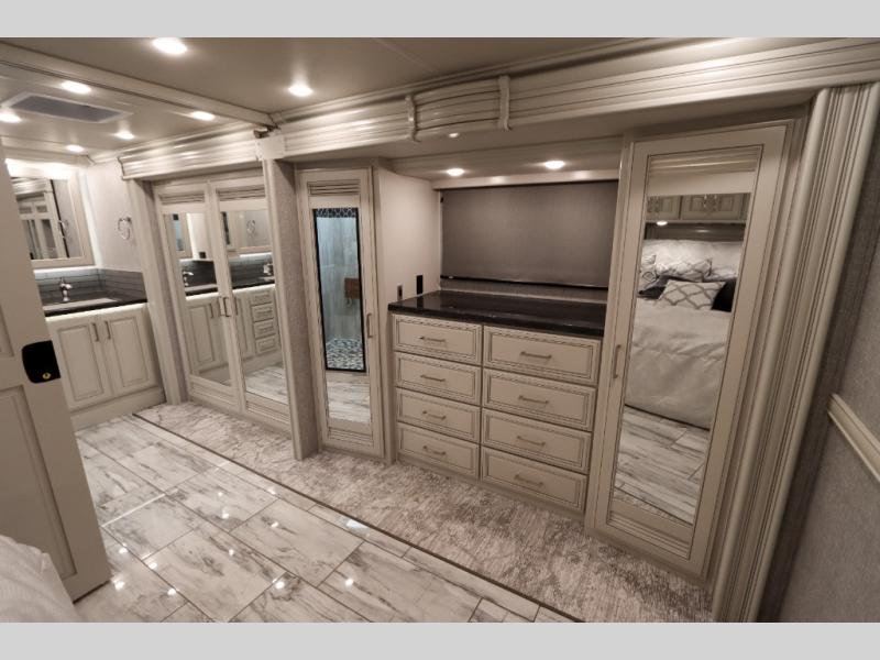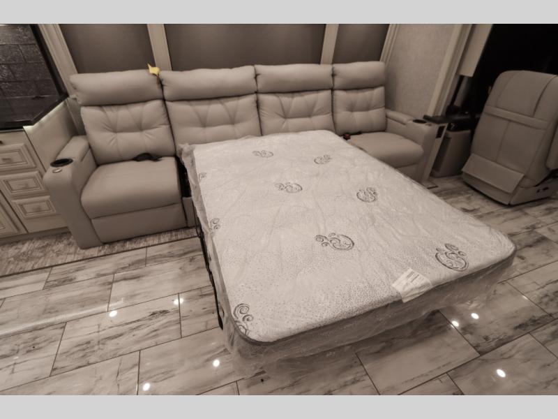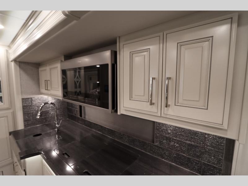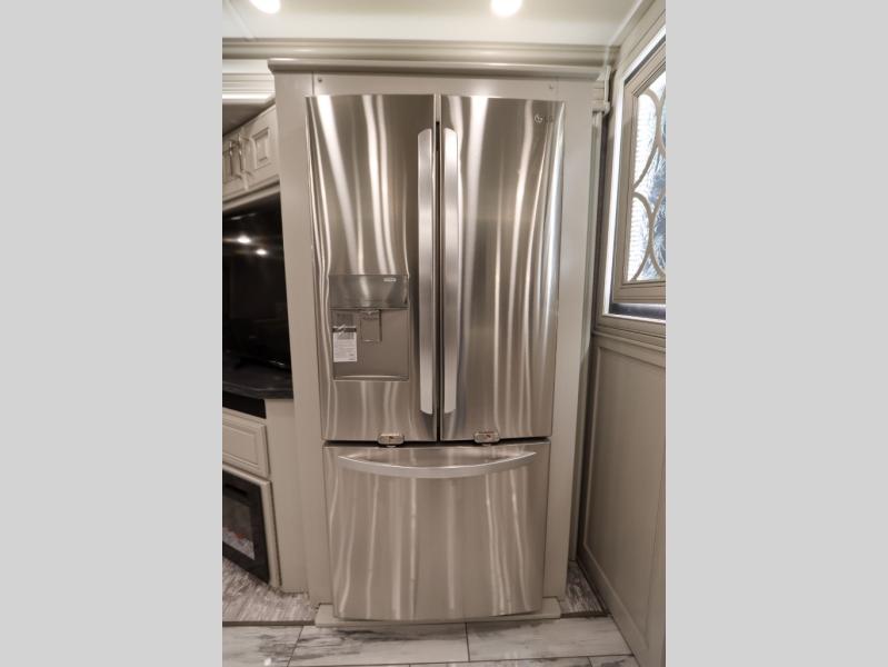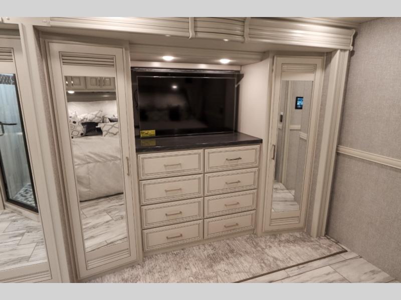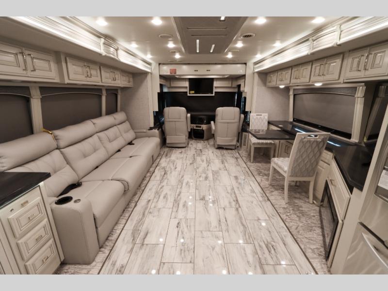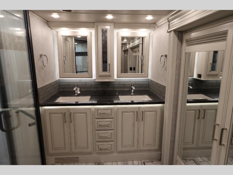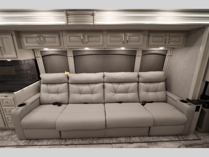 Going full-time has never been easier than in this coach with four slides, a bath and a half, and a huge master suite! You can wake up each morning in your king bed slide out, and catch up on the news with your pop-up LED TV. The rear bath includes a dual sink vanity so you both can get ready at the same time, and there is even a private lavy for convenience. The master suite also includes a hanging wardrobe storage with a washer and dryer to make wash day a breeze. Head to the main living area to make breakfast on the two burner induction cooktop, or use the convection microwave. There is a residential refrigerator with ice and water in the door, plus a dishwasher drawer for added convenience. Your crew will love to relax on the power motion lounges that sit on either side of the sofa sleeper with a full mattress, and there is a free-standing dinette with Credenza for your morning cup of joe!
