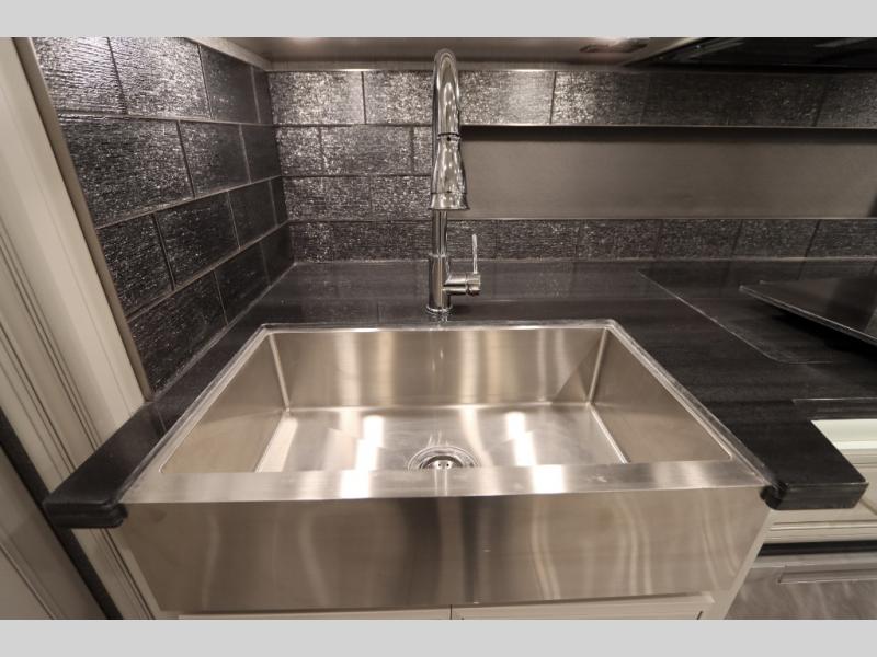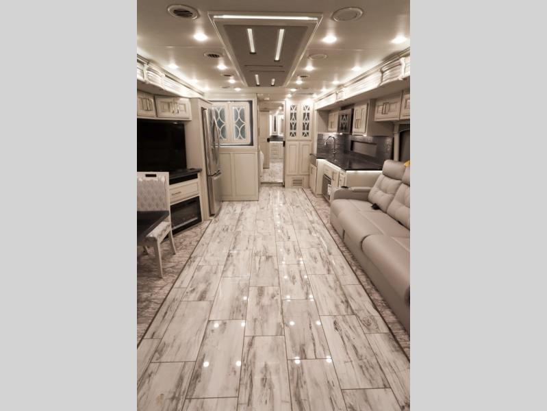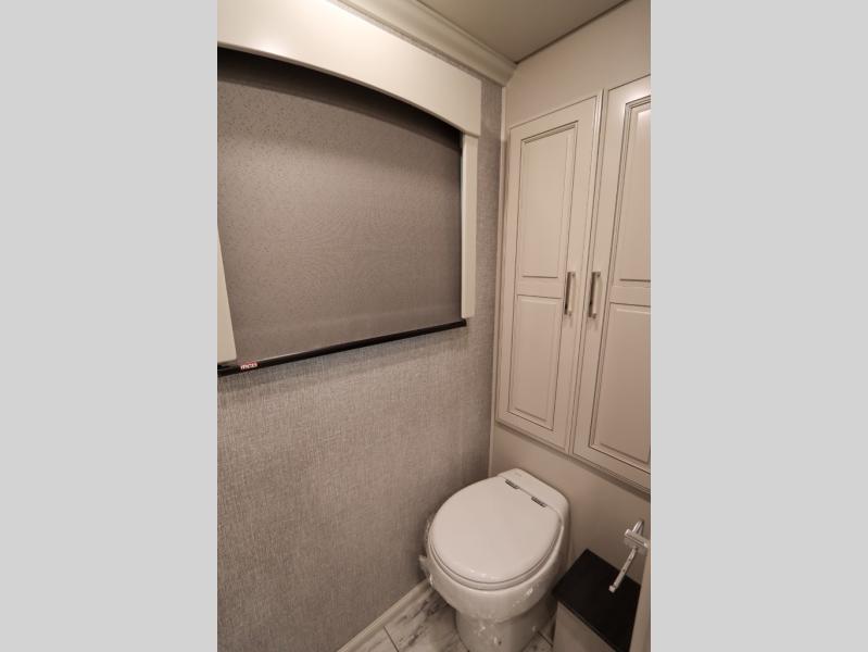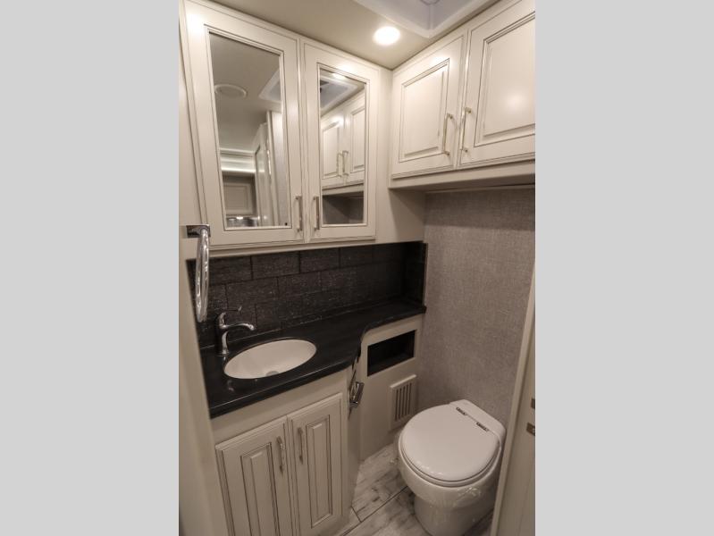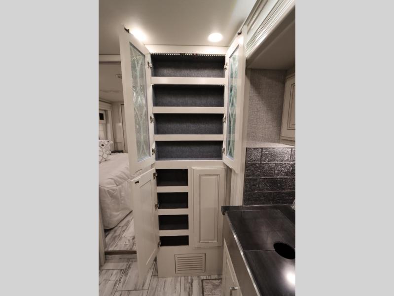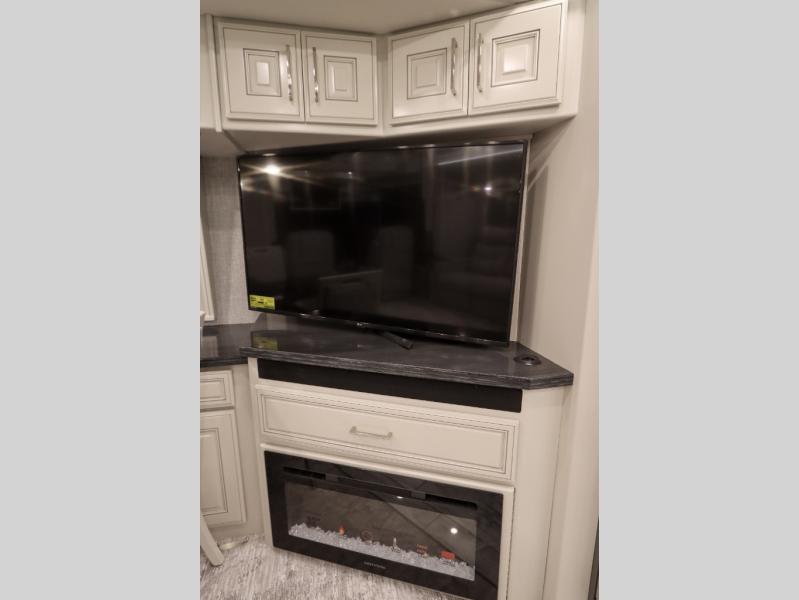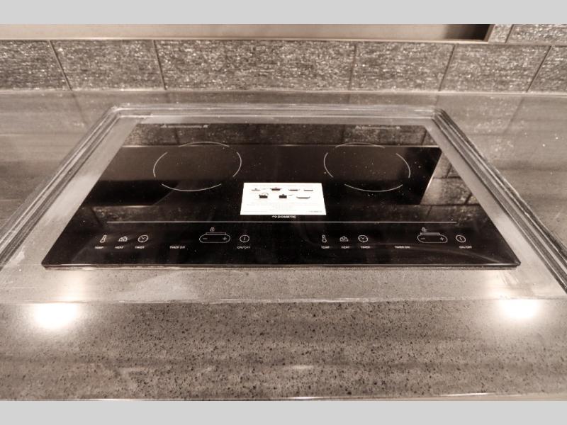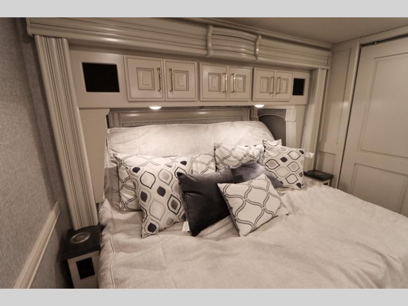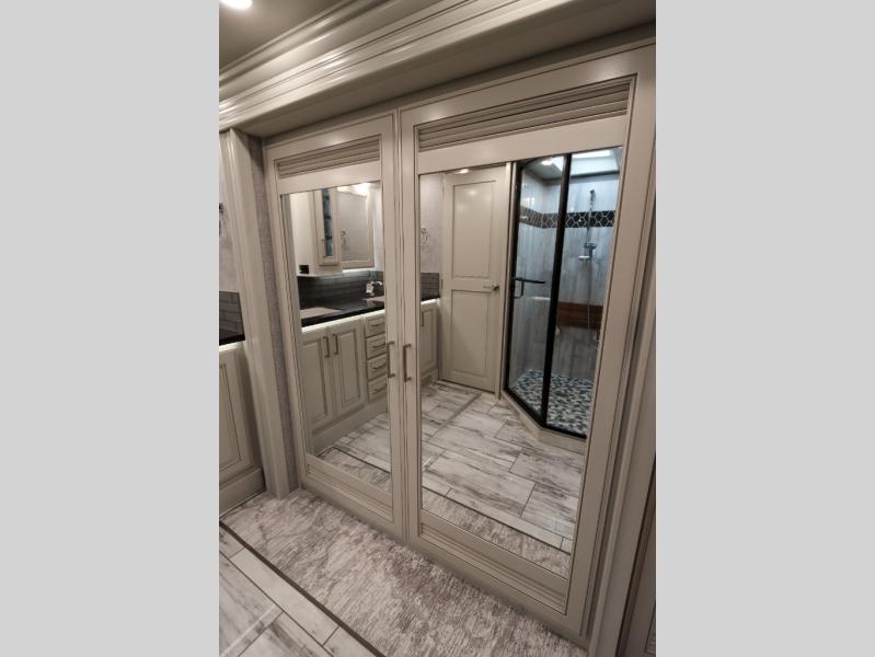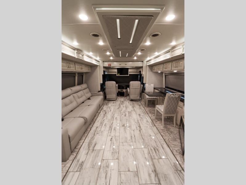 Going full-time has never been easier than in this coach with four slides, a bath and a half, and a huge master suite! You can wake up each morning in your king bed slide out, and catch up on the news with your pop-up LED TV. The rear bath includes a dual sink vanity so you both can get ready at the same time, and there is even a private lavy for convenience. The master suite also includes a hanging wardrobe storage with a washer and dryer to make wash day a breeze. Head to the main living area to make breakfast on the two burner induction cooktop, or use the convection microwave. There is a residential refrigerator with ice and water in the door, plus a dishwasher drawer for added convenience. Your crew will love to relax on the power motion lounges that sit on either side of the sofa sleeper with a full mattress, and there is a free-standing dinette with Credenza for your morning cup of joe!