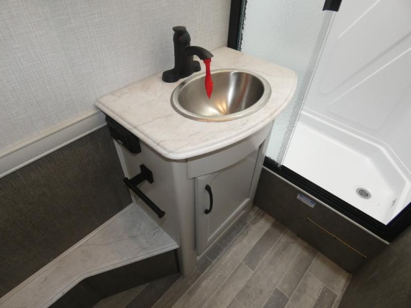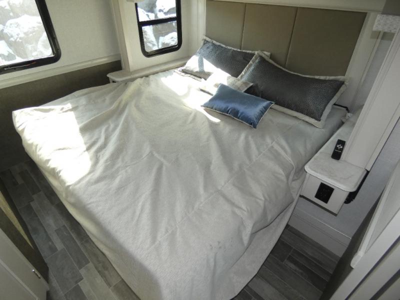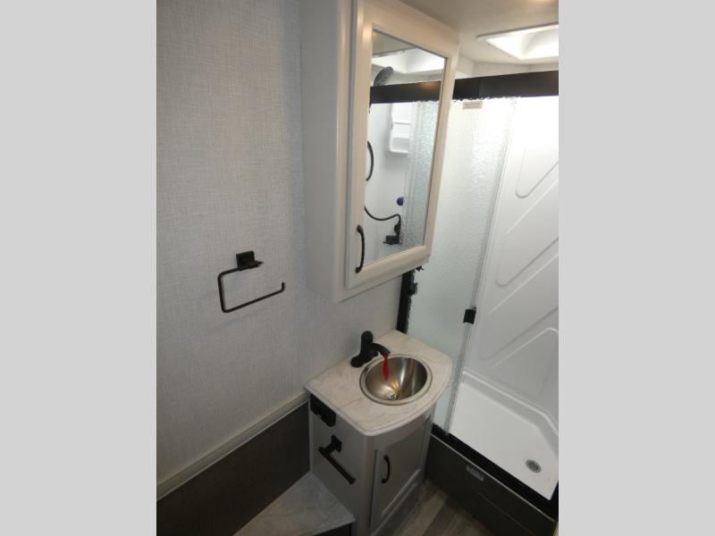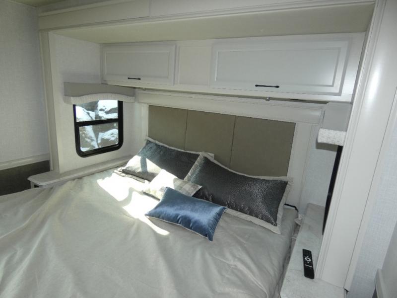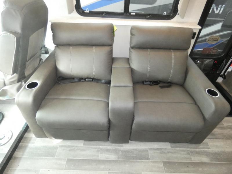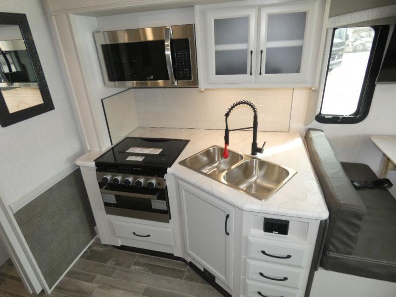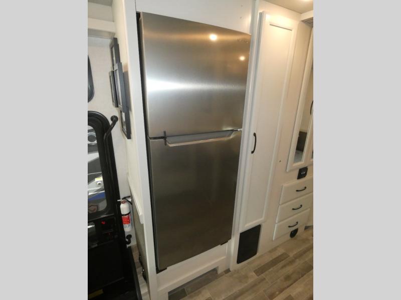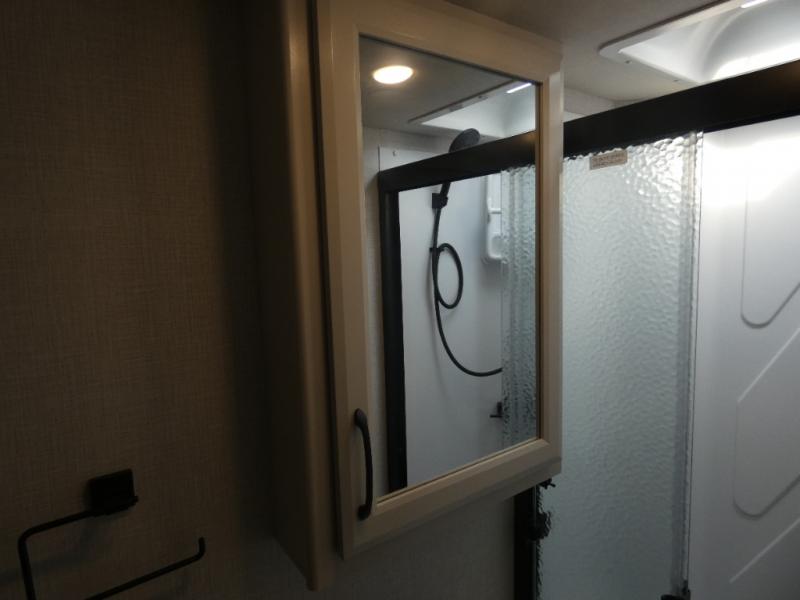 If you're hoping for a luxurious getaway, look no further than this Flair Class A gas motorhome! You can sleep in peace in your own private bedroom, and the full bathroom with shower skylight is directly connected to the bedroom for easy morning routines. Next to the residential refrigerator is a pantry, so you have great kitchen storage, and you also have a three-burner range to cook those foods on. A jackknife sofa gives you lounging and sleeping space, and you have a Wi-Fi Ranger Sky4 to keep connected to the modern world.