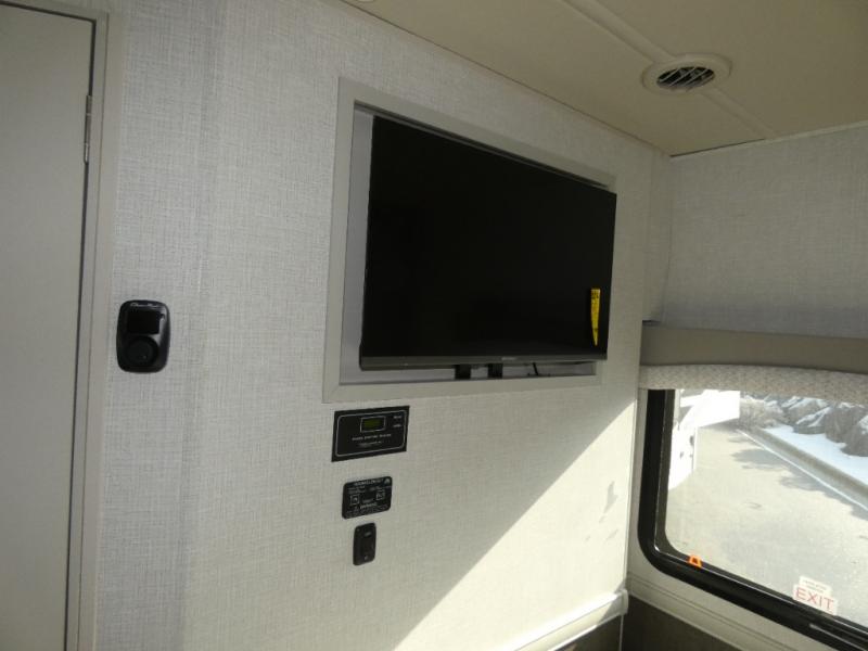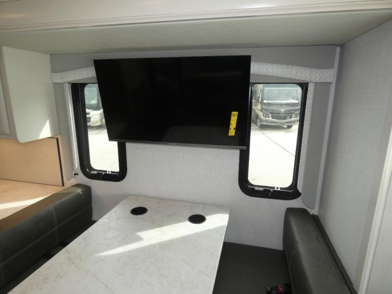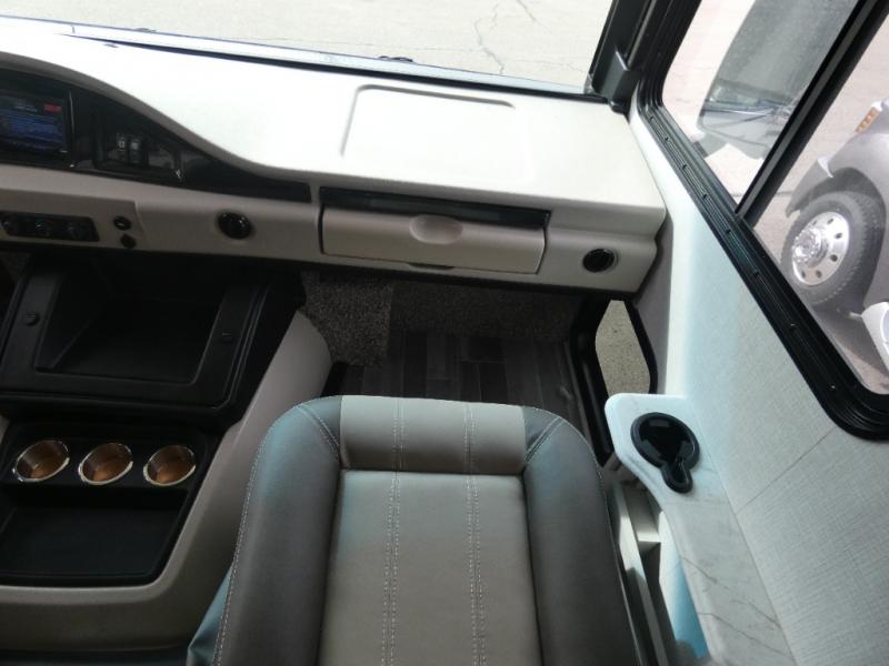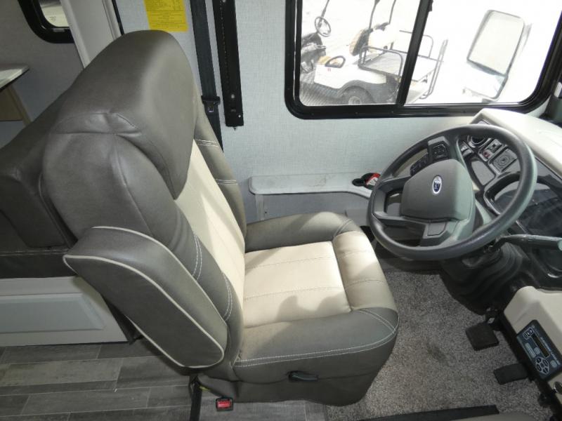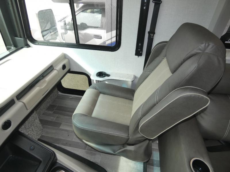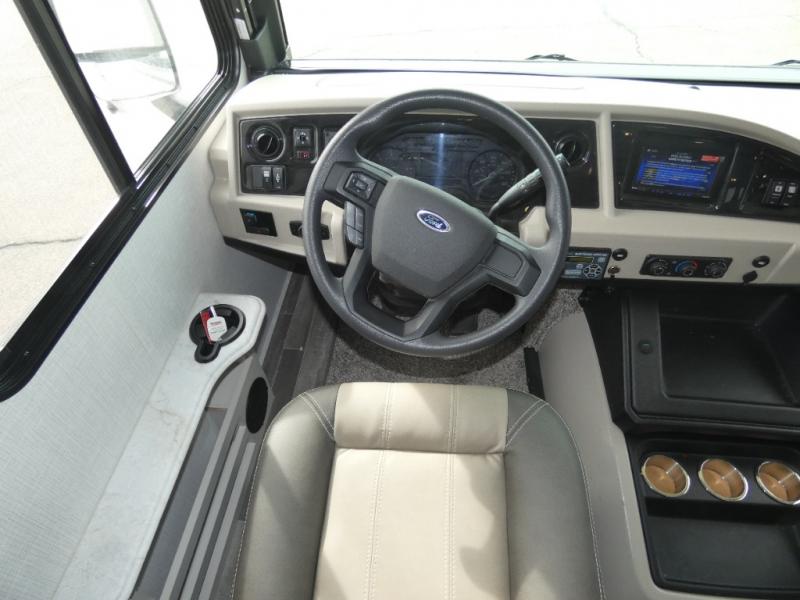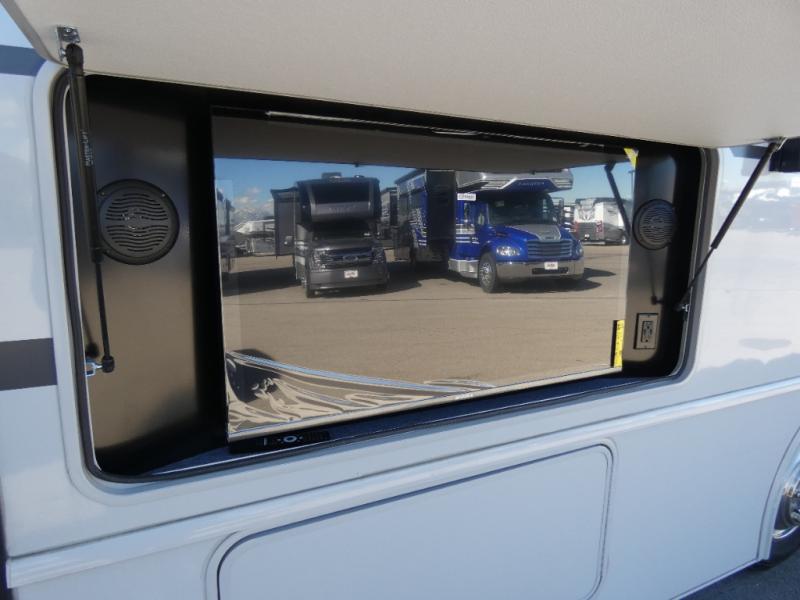 Step up your camping game by adding the Fleetwood Flair Class A gas motorhome to the line-up! The 7.3L 335HP engine with 468 LB/FT of torque forms the base, and the 8,000-LB towing capacity gives you the chance to bring a car with your coach. On the exterior you'll find an automotive, bonded one-piece windshield, exterior-mounted sideview cameras, and an exterior LED TV. The interior is decked out with a dash radio, an electronic instrument panel, and reclining/swivel cab chairs. There is also a workstation at the automotive-style dash, and the Bluetooth coach system in the bedroom has exterior speakers for fun party nights.