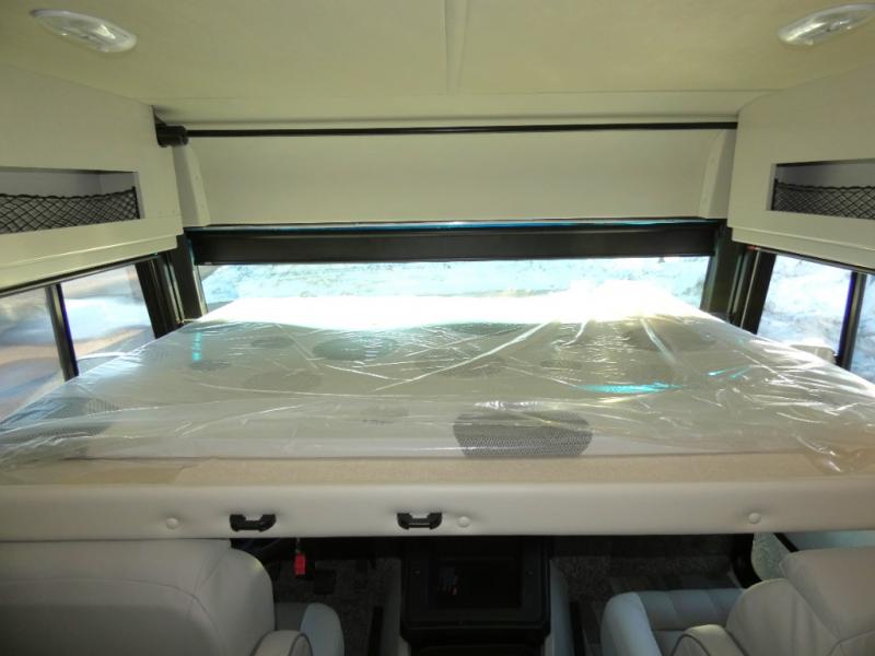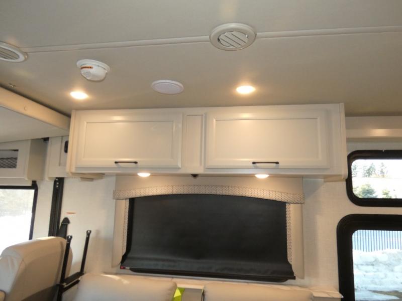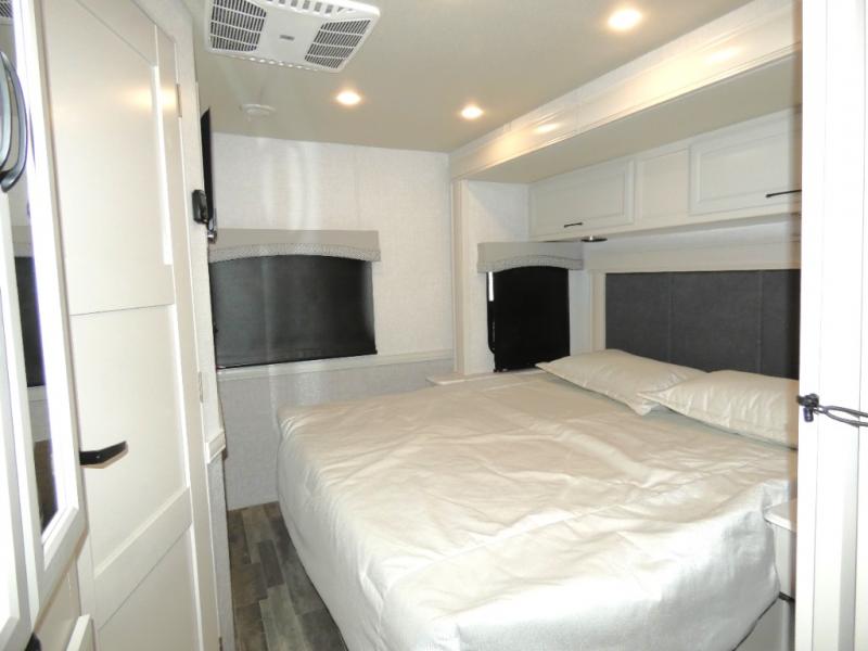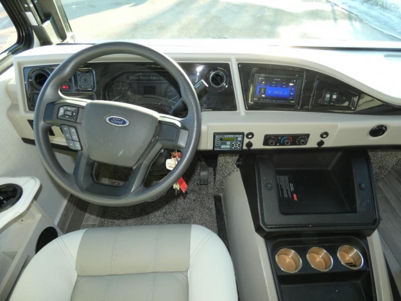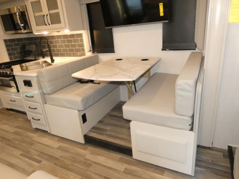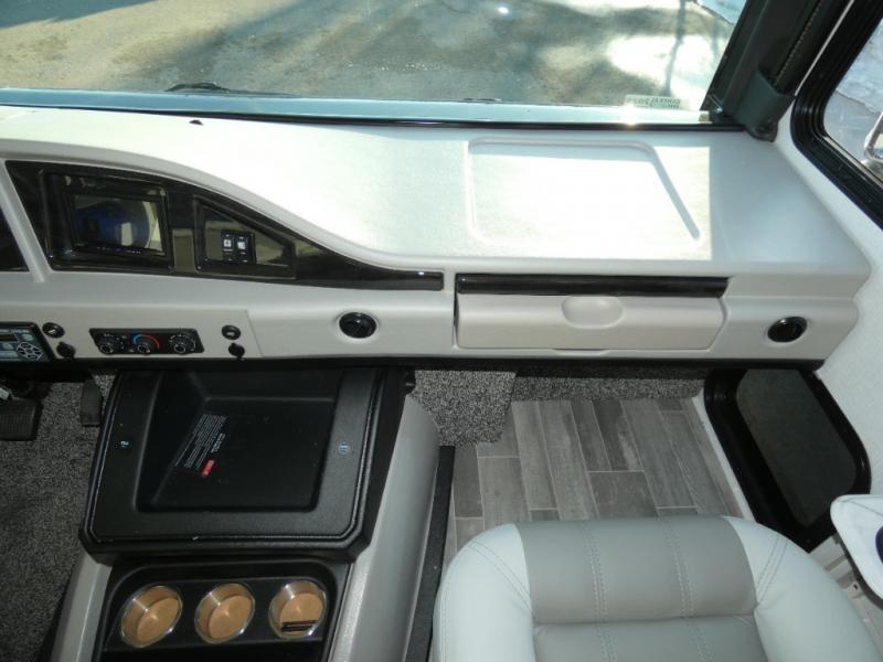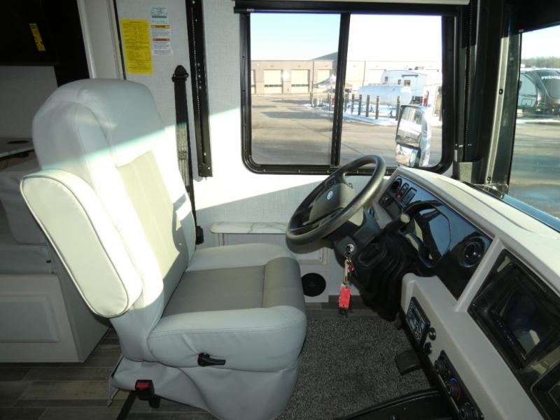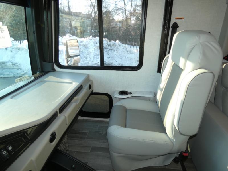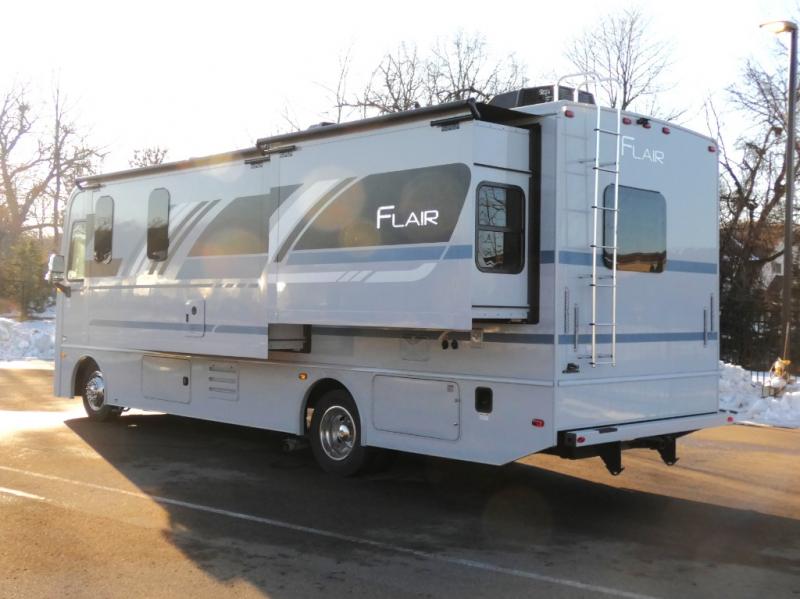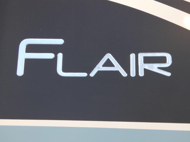 Step up your camping game by adding the Fleetwood Flair Class A gas motorhome to the line-up! The 7.3L 335HP engine with 468 LB/FT of torque forms the base, and the 8,000-LB towing capacity gives you the chance to bring a car with your coach. On the exterior you'll find an automotive, bonded one-piece windshield, exterior-mounted sideview cameras, and an exterior LED TV. The interior is decked out with a dash radio, an electronic instrument panel, and reclining/swivel cab chairs. There is also a workstation at the automotive-style dash, and the Bluetooth coach system in the bedroom has exterior speakers for fun party nights.