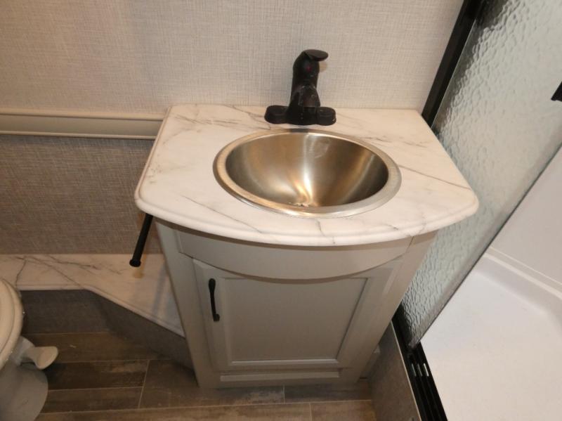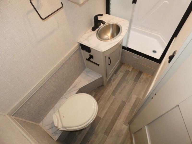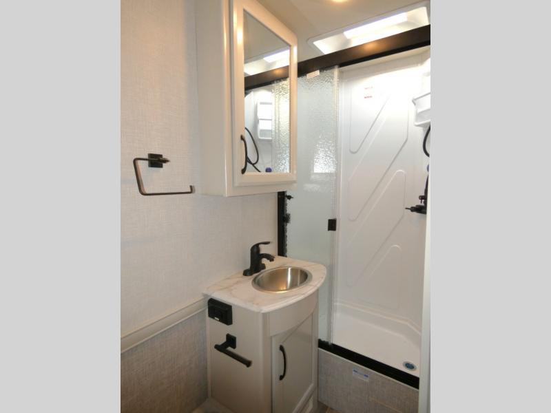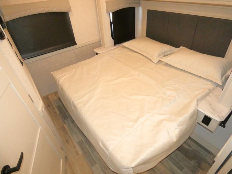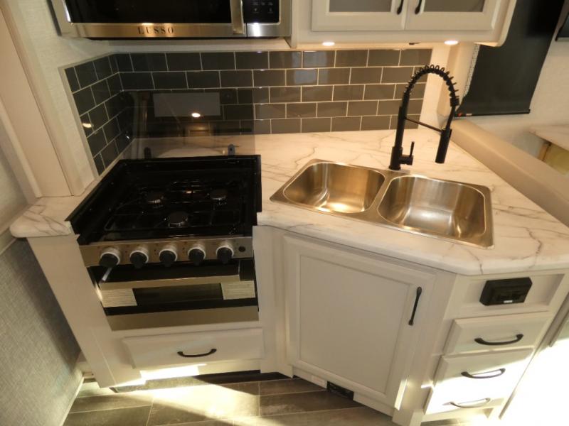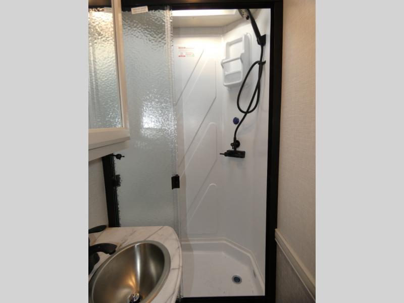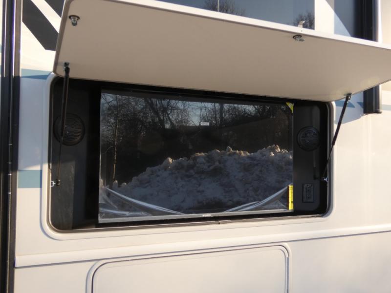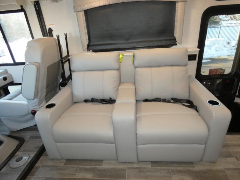 If you're hoping for a luxurious getaway, look no further than this Flair Class A gas motorhome! You can sleep in peace in your own private bedroom, and the full bathroom with shower skylight is directly connected to the bedroom for easy morning routines. Next to the residential refrigerator is a pantry, so you have great kitchen storage, and you also have a three-burner range to cook those foods on. A jackknife sofa gives you lounging and sleeping space, and you have a Wi-Fi Ranger Sky4 to keep connected to the modern world.