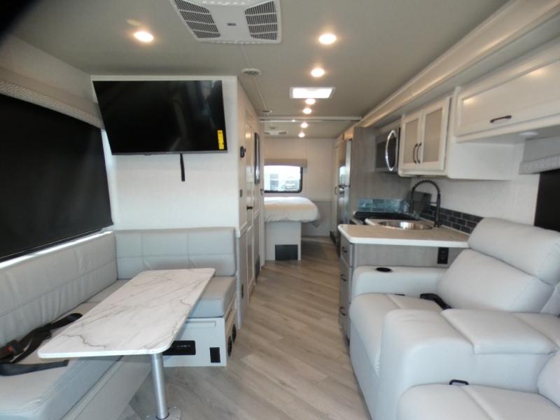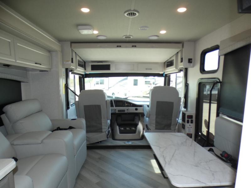 This Flair Class A gas motorhome is worth the investment! There is so much luxury and convenience included on this coach, like the Serenity Series RV king bed in the private bedroom, the residential refrigerator in the fully stocked kitchen, the Hide-A-Loft drop-down bunk above the cab, and the three LED TVs. You'll have a full bathroom with shower skylight so that you can keep clean while you're out adventuring, and the L-shaped dinette and theater seats. You can even turn the cab seats around to use the driver/passenger pedestal table as another lounge spot.