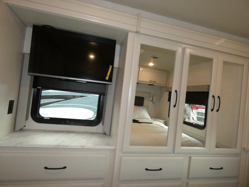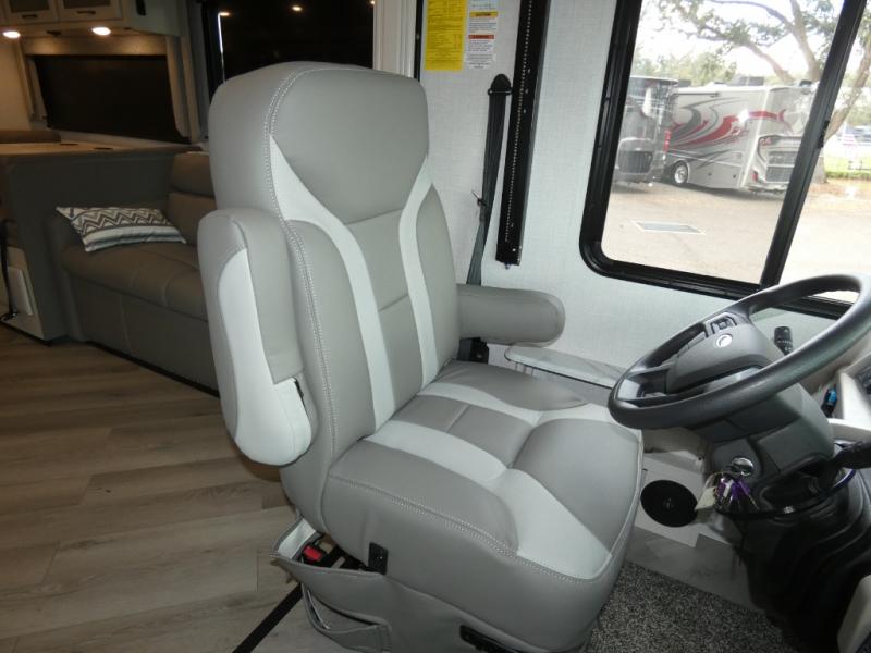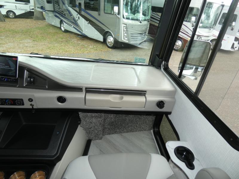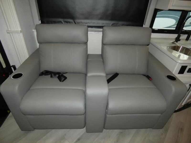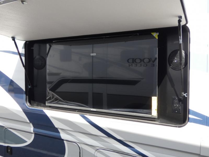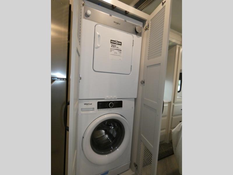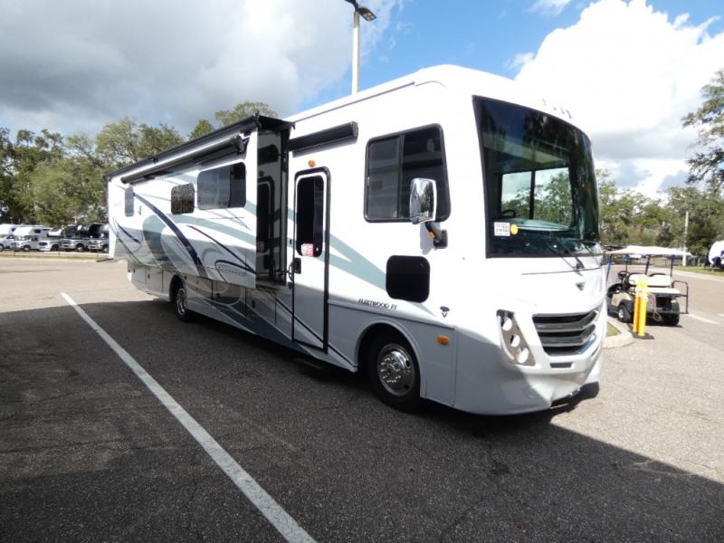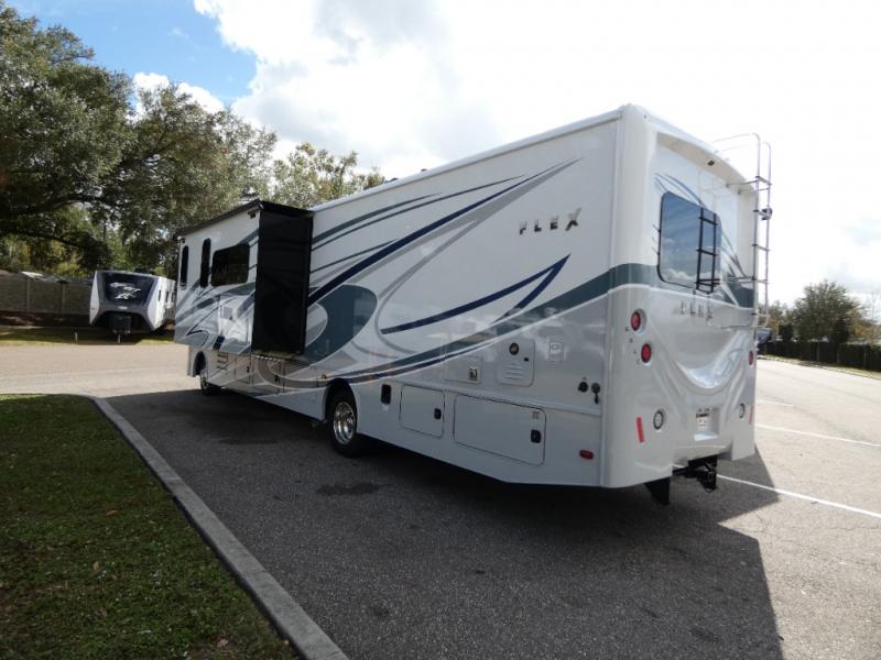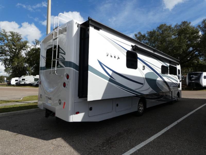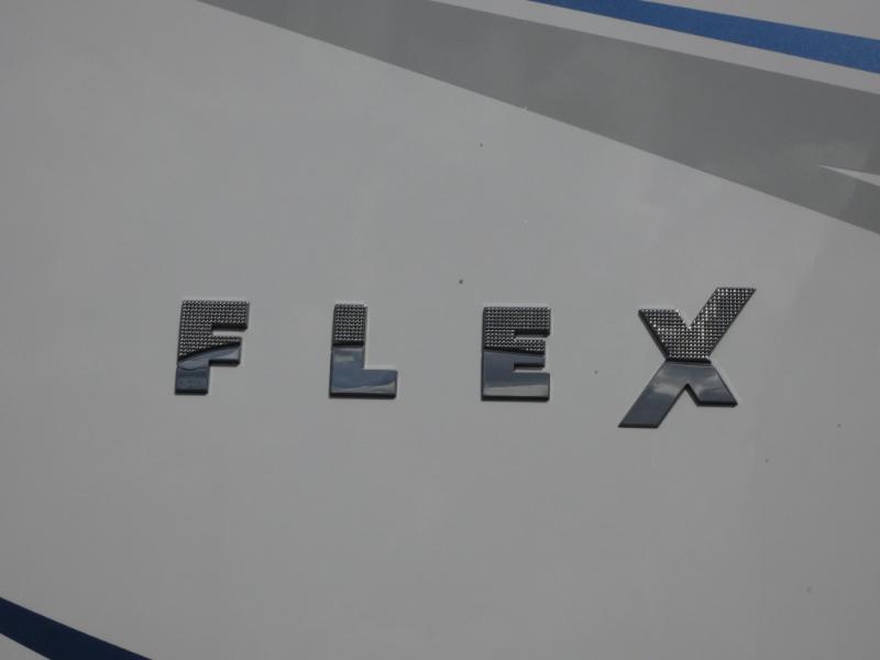 This comfortable Fleetwood Flex Class A motorhome offers room to relax! The rear bedroom has a king-size bed, while up front the living room features theater seats and an LED TV. Outside is an exterior TV, plus a legless electric patio awning with LED lighting. You will also enjoy a jackknife sofa and dream dinette within the large slide out, plus there is a full-wall slide for even more space! A full bath on board will let you freshen up each day, and the three TV's included ensure you'll never go bored. You'll also enjoy an entry awning on this model and washer and dryer prep to make wash day easier than ever.