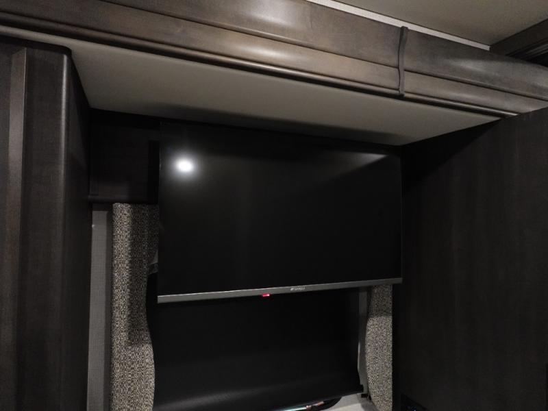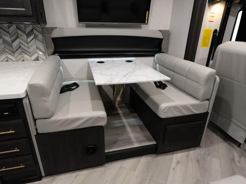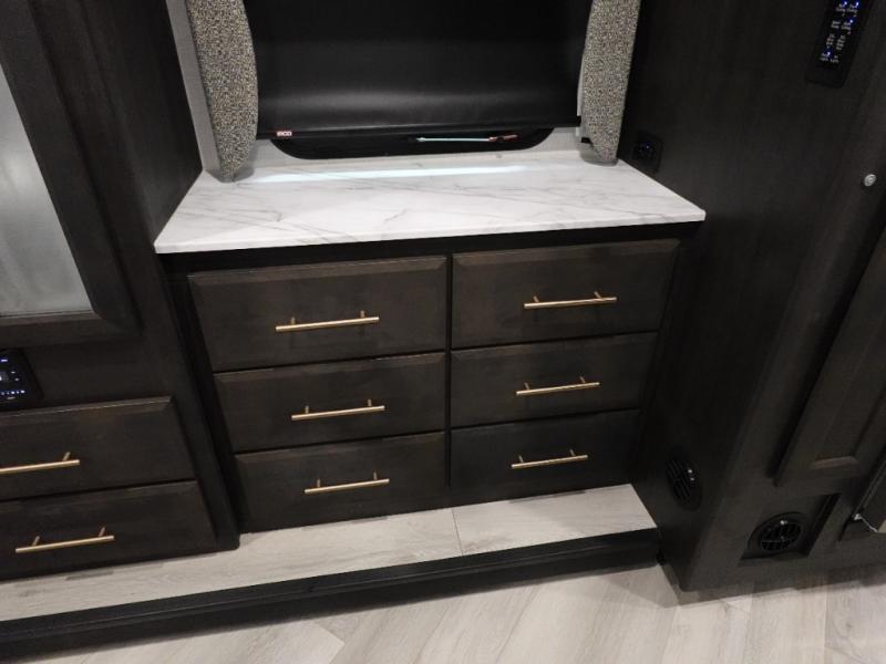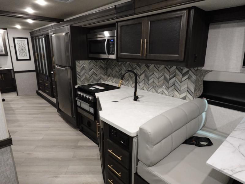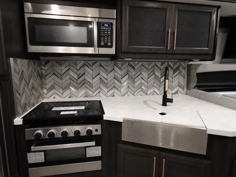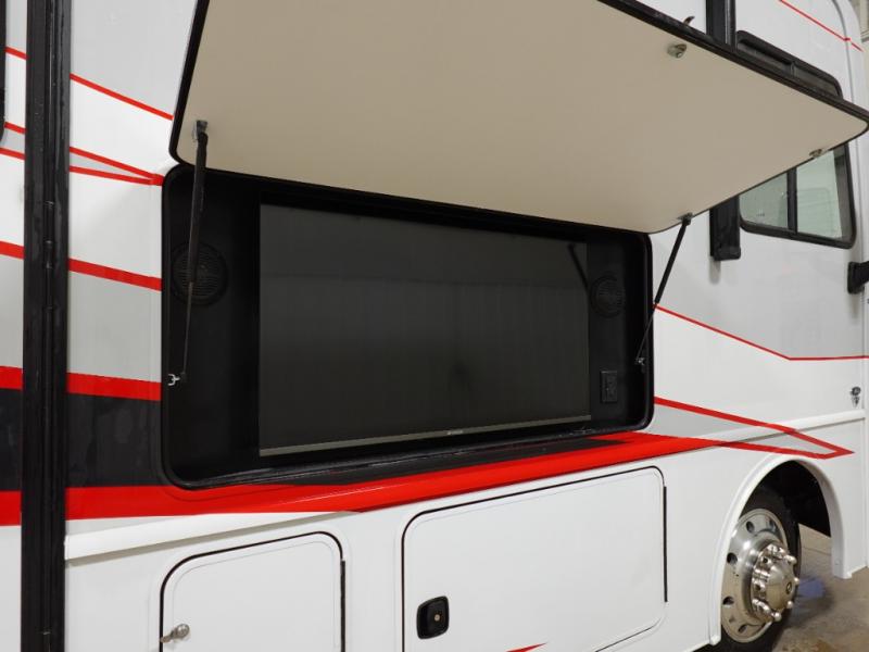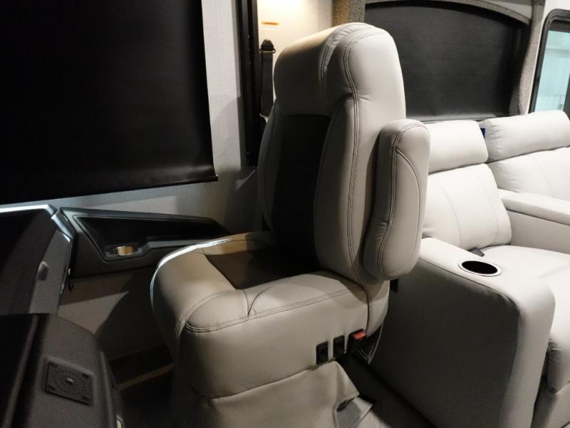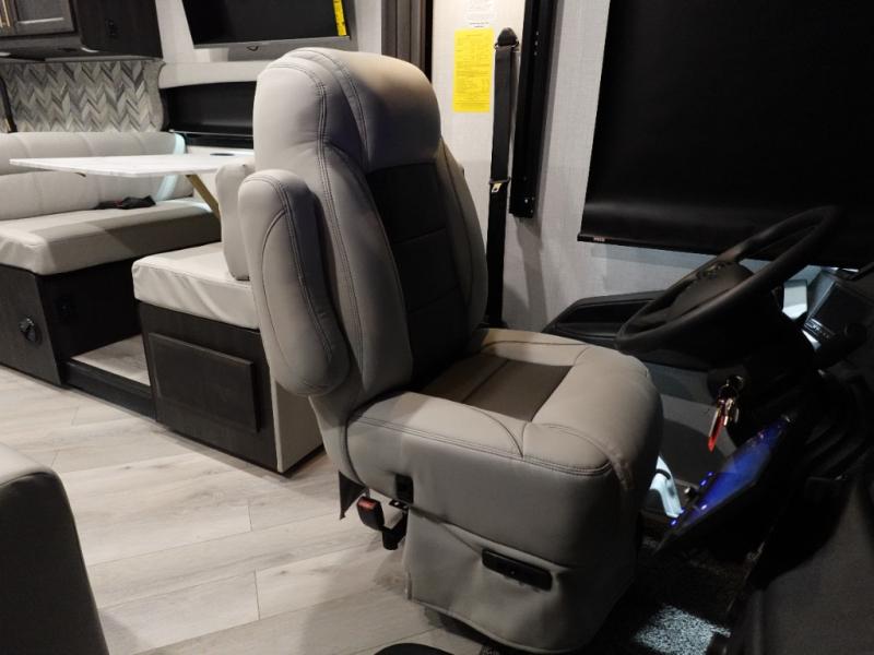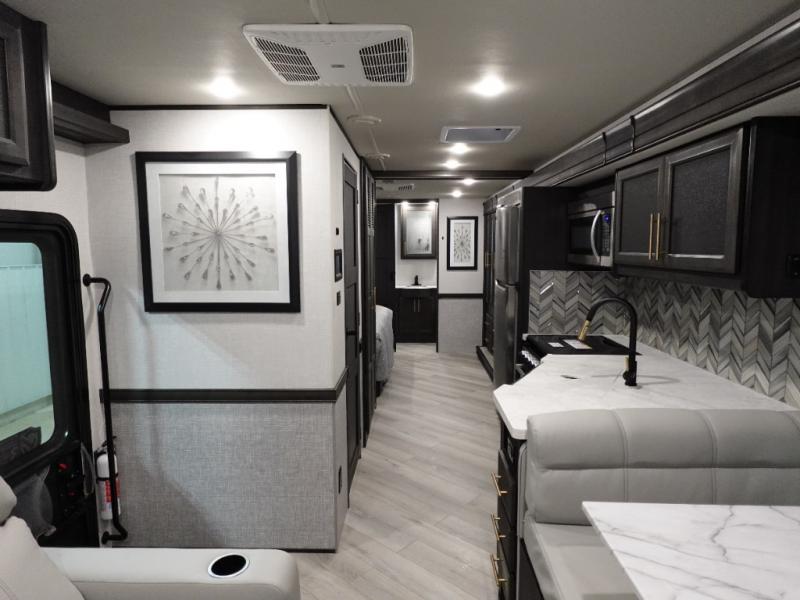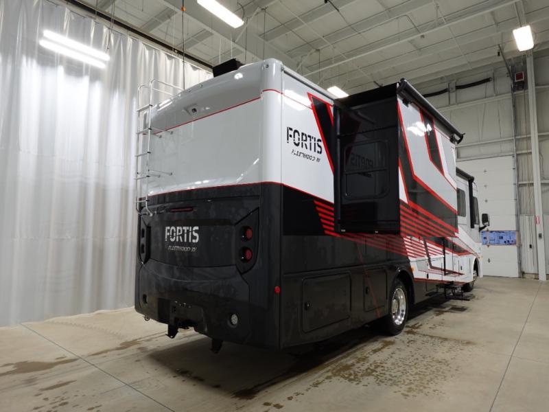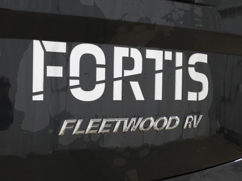 The Fleetwood Fortis Class A gas motorhome is a powerhouse of luxury and convenience, and it also is quite literally a powerhouse with its Ford 7.3L V8 335HP engine with 468 LB/FT of torque. The construction includes a Dryseal edge coating for all ceilings, walls, and floor, and the Powerlock System 2 has interlocking walls to the roof for stability. Automatic hydraulic leveling jacks make the set-up process easier, and the cab has excellent features, like a 9" stereo with AM/FM/Bluetooth, backup camera, reclining/swivel cab seats, driver/passenger center table, and an automotive-style dash with dual monitors and workstation. You will find vinyl tile flooring all throughout the interior, as well as full-extension drawer guides with latches, coordinating window treatments, and energy-efficient LED flush-mount ceiling lighting.