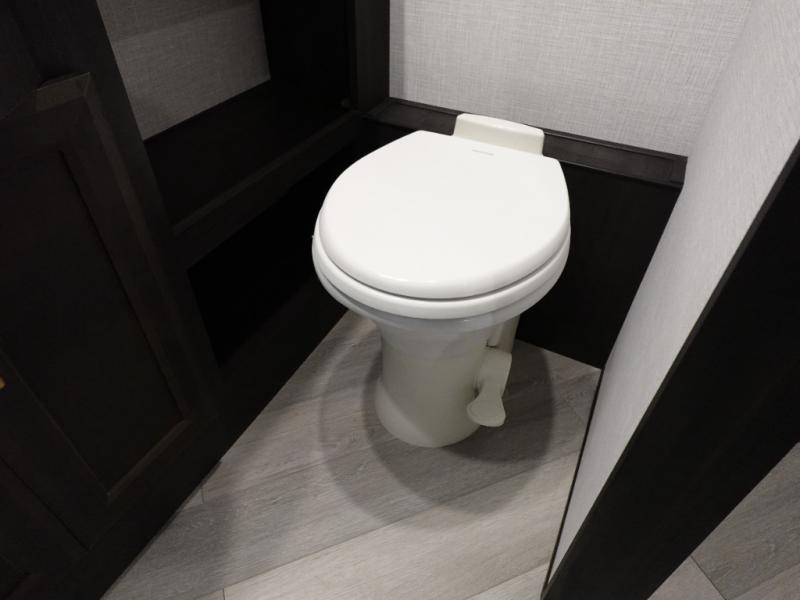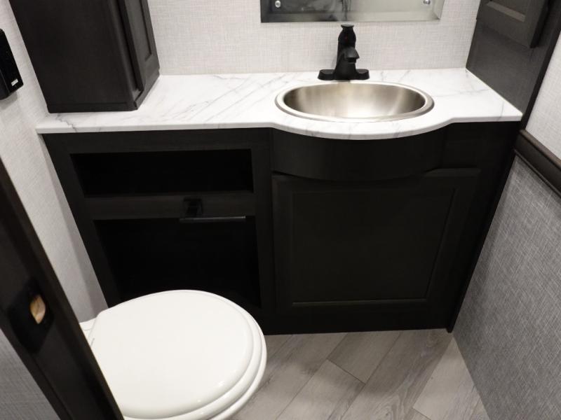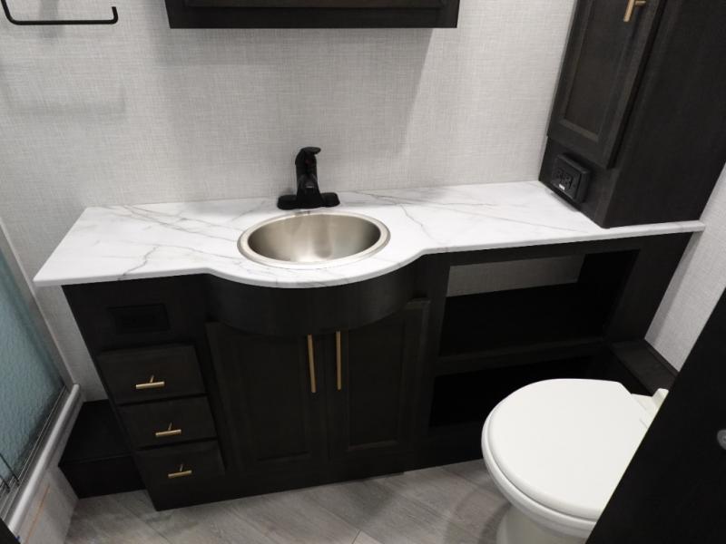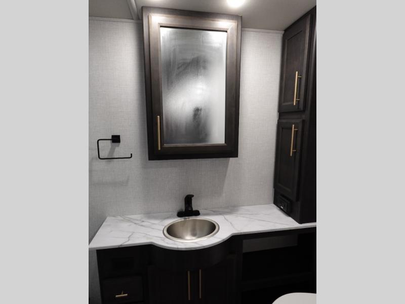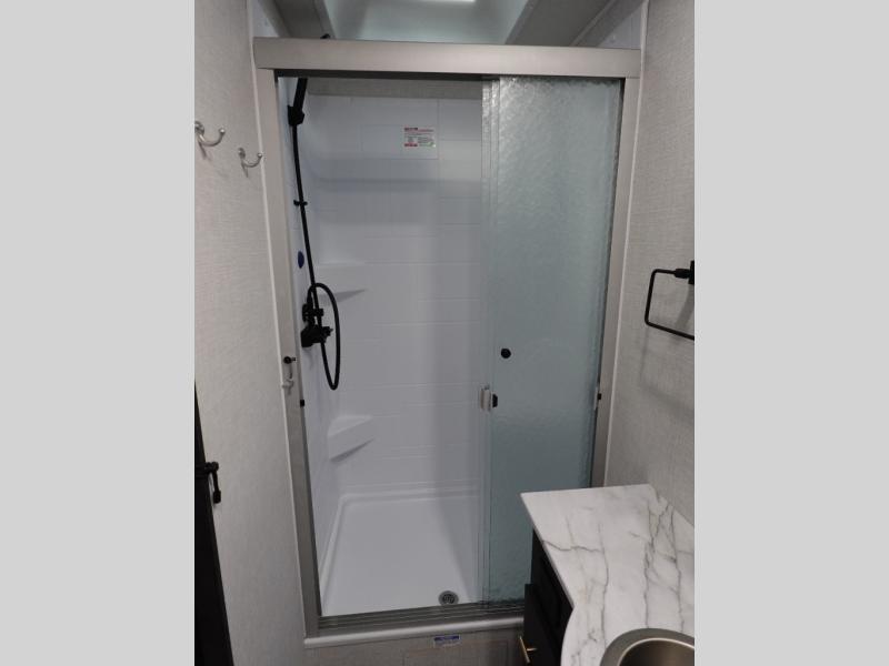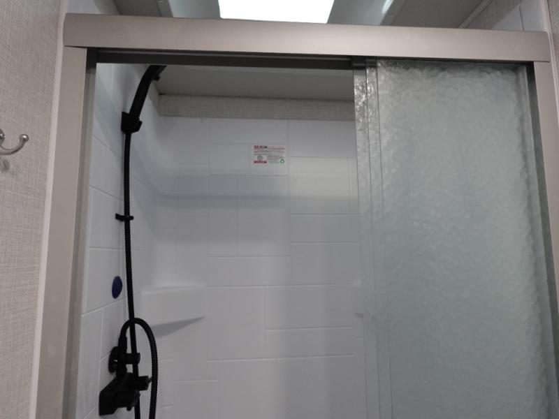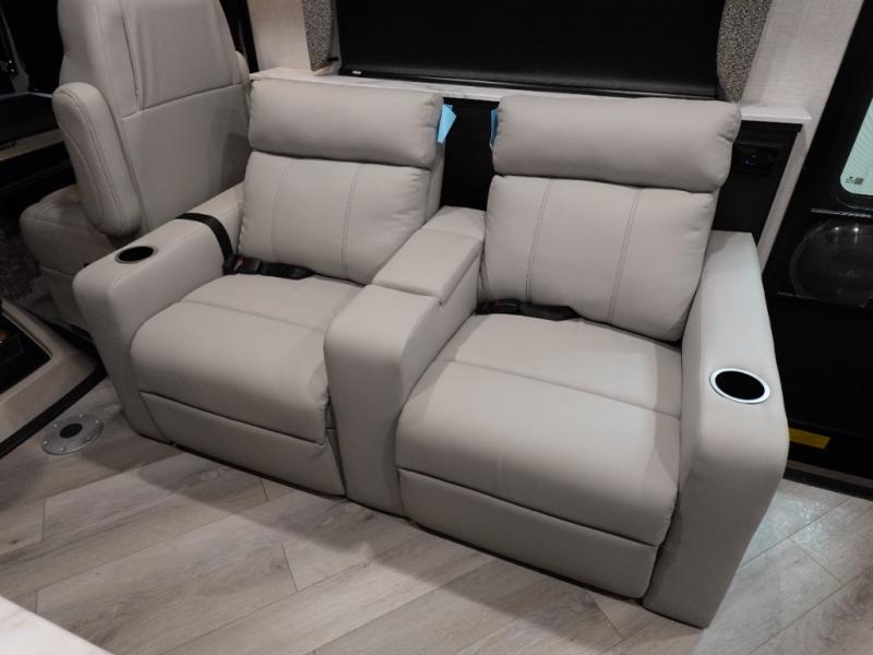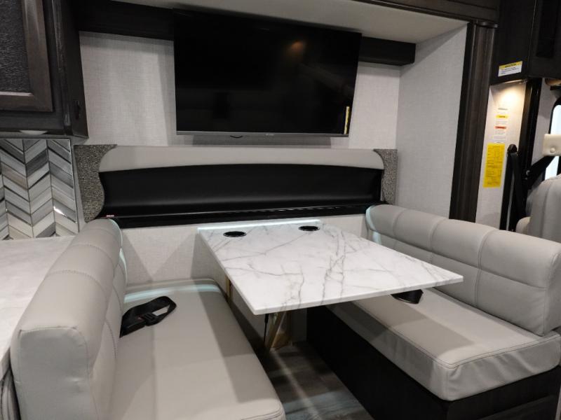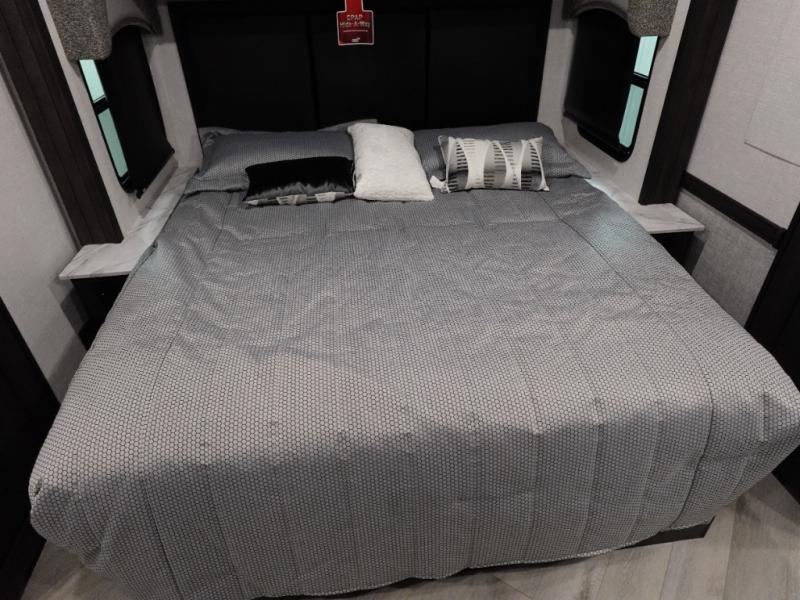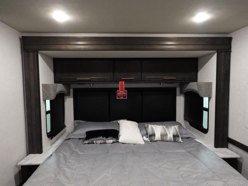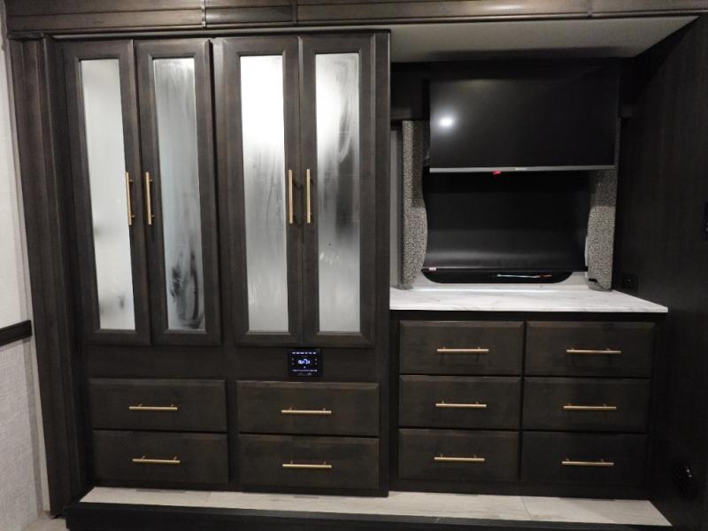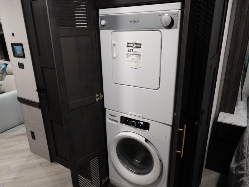 The Fleetwood Fortis Class A gas motorhome is a powerhouse of luxury and convenience, and it also is quite literally a powerhouse with its Ford 7.3L V8 335HP engine with 468 LB/FT of torque. The construction includes a Dryseal edge coating for all ceilings, walls, and floor, and the Powerlock System 2 has interlocking walls to the roof for stability. Automatic hydraulic leveling jacks make the set-up process easier, and the cab has excellent features, like a 9" stereo with AM/FM/Bluetooth, backup camera, reclining/swivel cab seats, driver/passenger center table, and an automotive-style dash with dual monitors and workstation. You will find vinyl tile flooring all throughout the interior, as well as full-extension drawer guides with latches, coordinating window treatments, and energy-efficient LED flush-mount ceiling lighting.
