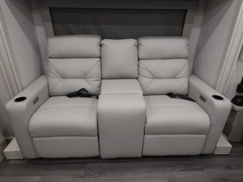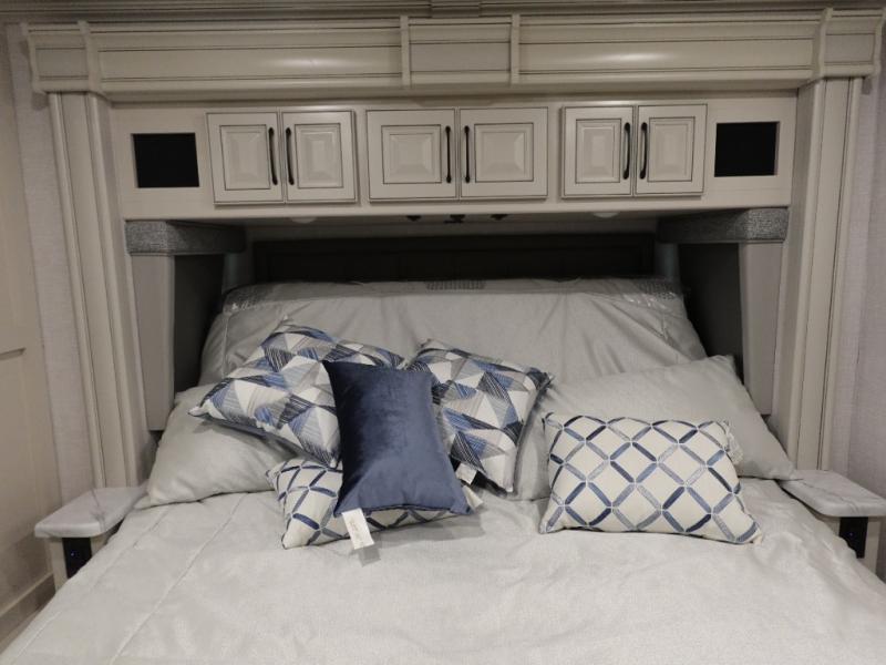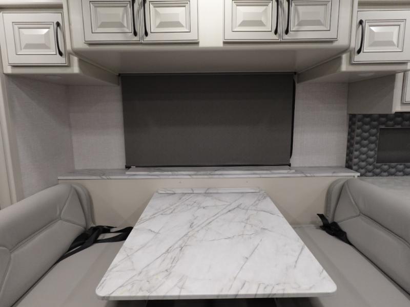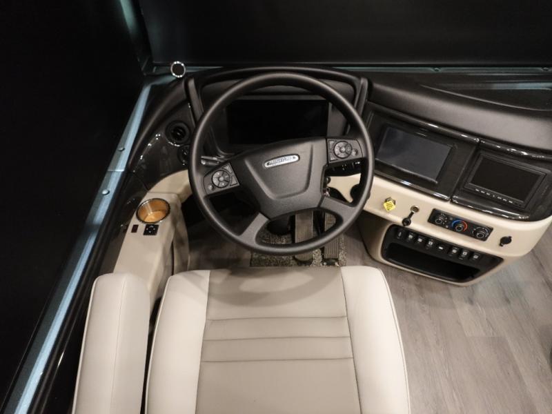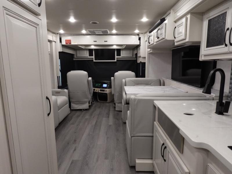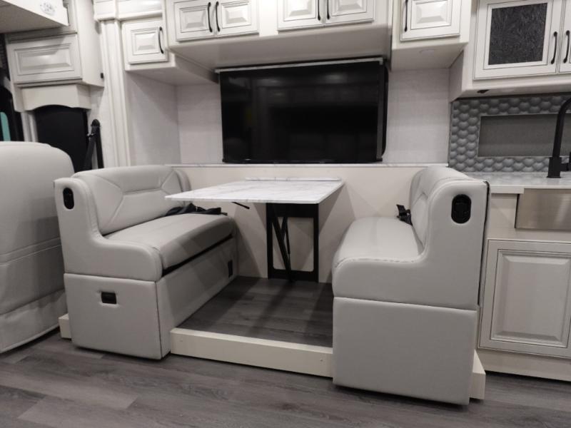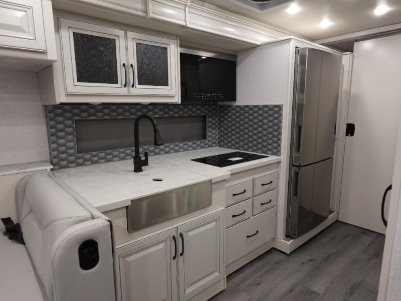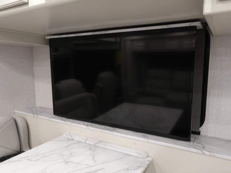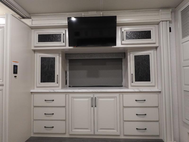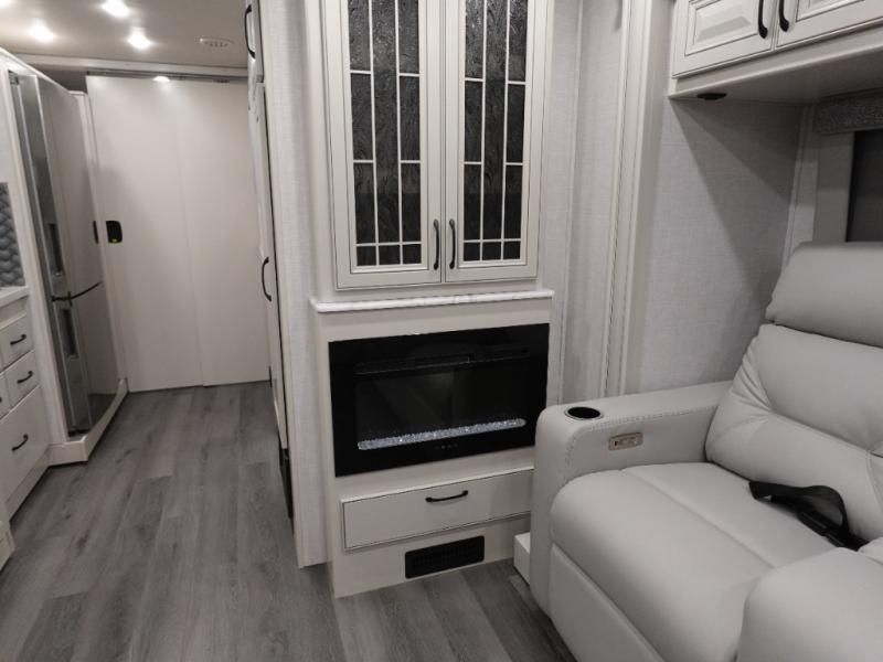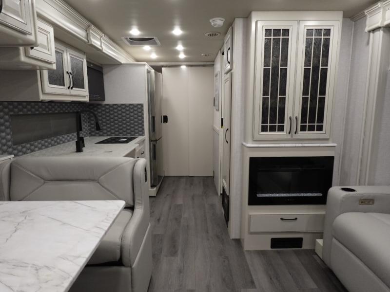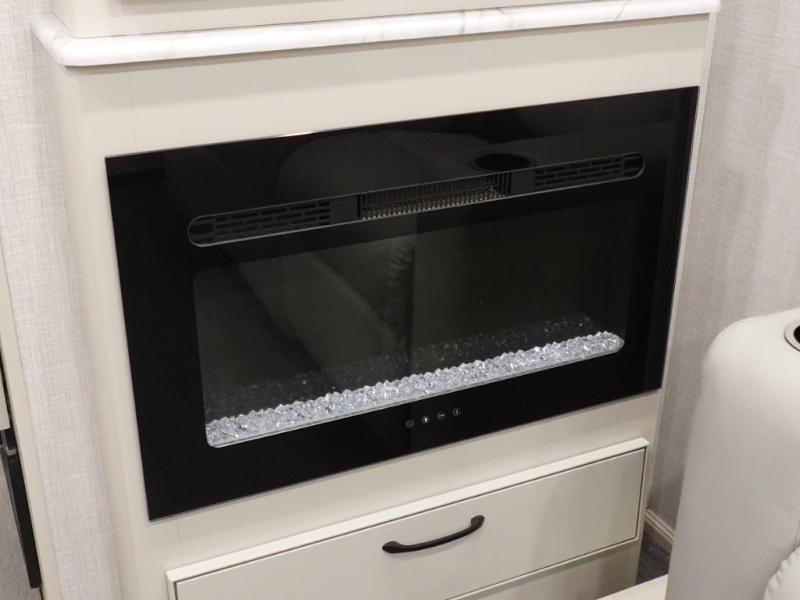 Looking for a couples coach or a family RV that offers everything you want plus more? Look no further! You can travel in style with the beautiful interior and exterior, and relax in comfort on the sofa sleeper with pull-out queen bed and the dinette as well as captain's chairs. Everyone can visit and watch the pop-up LED TV and stay cozy from the fireplace while the cook makes a meal in the kitchen using the induction cooktop and convection microwave. No problem with beverage and leftover storage with a residential refrigerator, and your snacks will fit nicely in the pantry. The full bathroom offers a seated shower and pocket door. The kids or your guests can sleep on the furniture once setup for bedtime, and you will have your own privacy in the rear bedroom with a Encore Series king bed, as well as plenty of storage in the full-length wardrobe, and dresser.