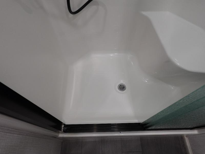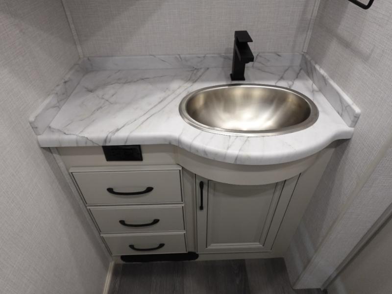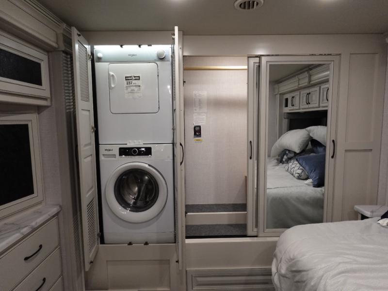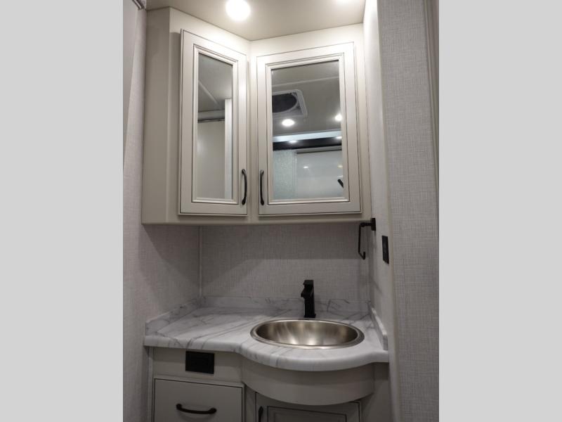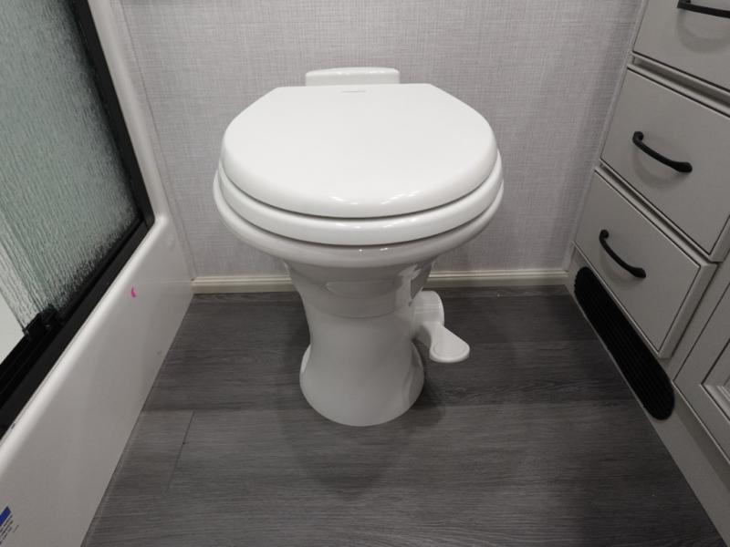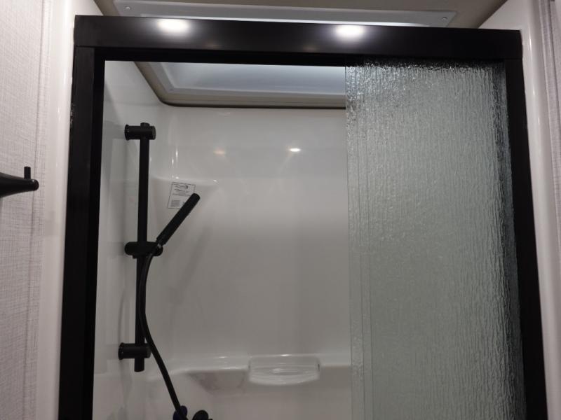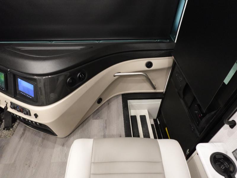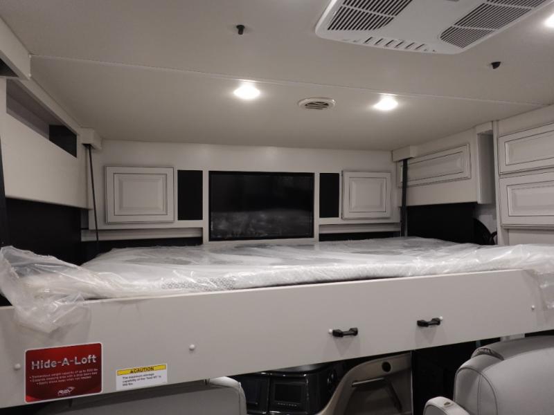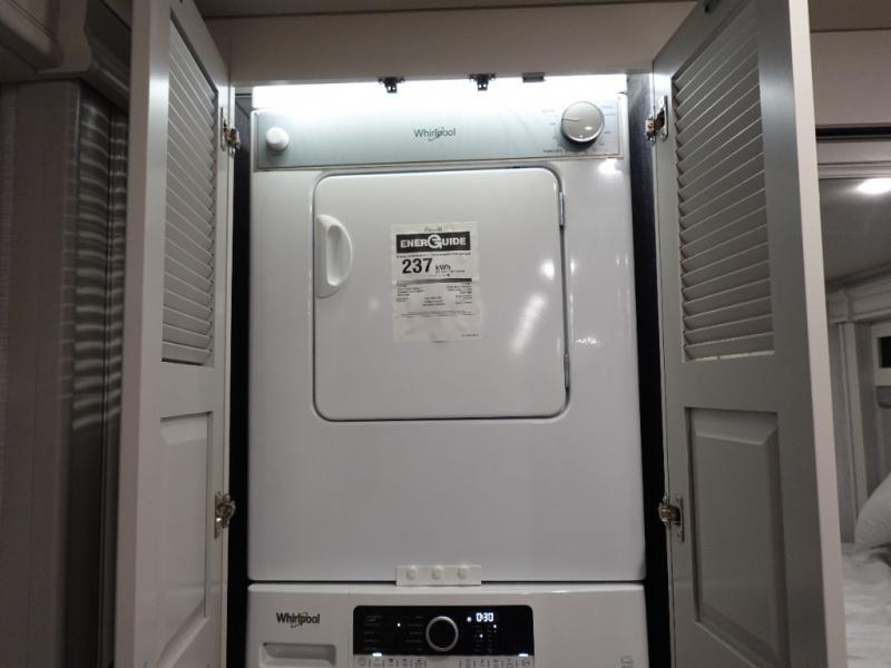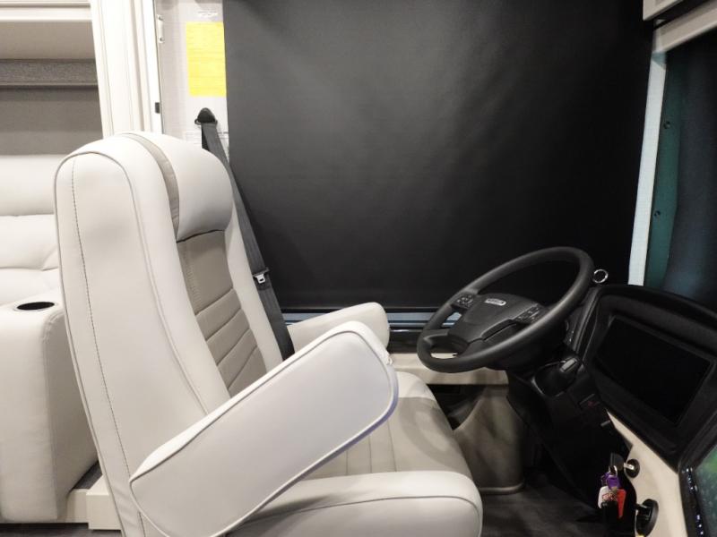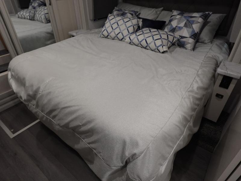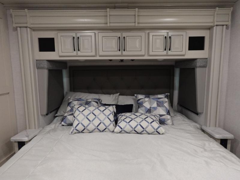 Looking for a couples coach or a family RV that offers everything you want plus more? Look no further! You can travel in style with the beautiful interior and exterior, and relax in comfort on the sofa sleeper with pull-out queen bed and the dinette as well as captain's chairs. Everyone can visit and watch the pop-up LED TV and stay cozy from the fireplace while the cook makes a meal in the kitchen using the induction cooktop and convection microwave. No problem with beverage and leftover storage with a residential refrigerator, and your snacks will fit nicely in the pantry. The full bathroom offers a seated shower and pocket door. The kids or your guests can sleep on the furniture once setup for bedtime, and you will have your own privacy in the rear bedroom with a Encore Series king bed, as well as plenty of storage in the full-length wardrobe, and dresser.