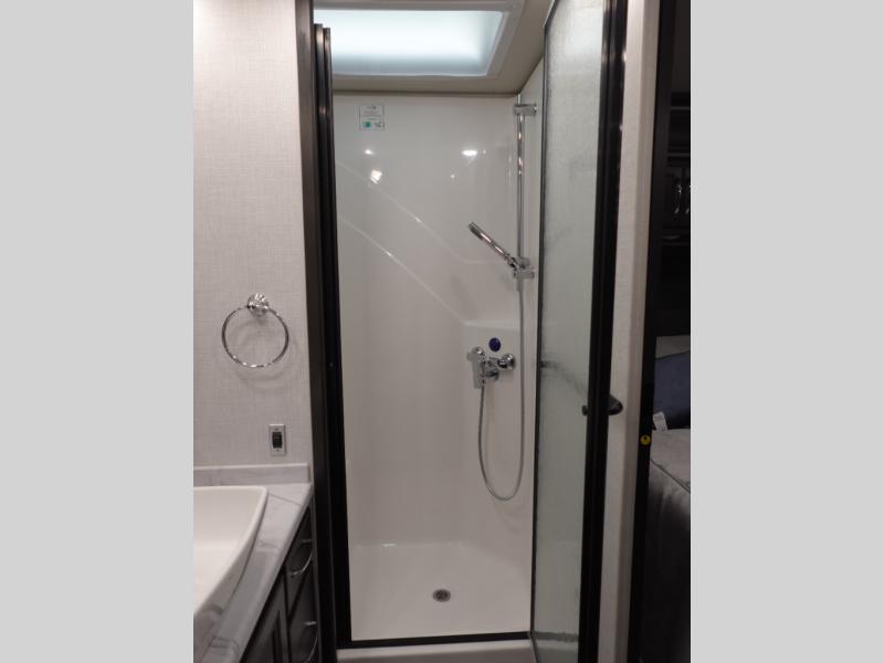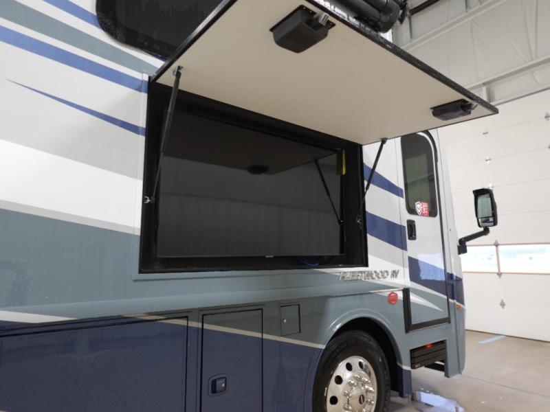 With any Frontier Class A diesel by Fleetwood RV, the Cummins 6.7L, 340HP engine with 700 lb./ft. torque gives you the power you want, the 100-gallon fuel tank allows you to stop less unless you want to take in the scenery, and the DriveTech/Optiview display and control system makes for a safer driving experience making each and every trip enjoyable. The legless electric patio awning with LED lighting and motion sensor retract provides protection while relaxing outside, and the extra exterior storage allows you to bring everything you need, plus some! Inside you will have (almost) endless hot water thanks to the Aqua-hot 250D compact heating unit, a solid surface galley countertop, a single-bowl, stainless steel farmhouse sink, many residential features throughout, and composite tile flooring.
