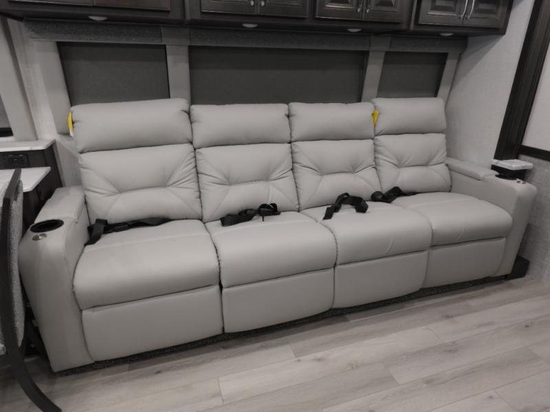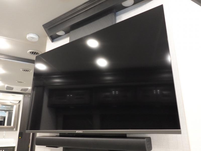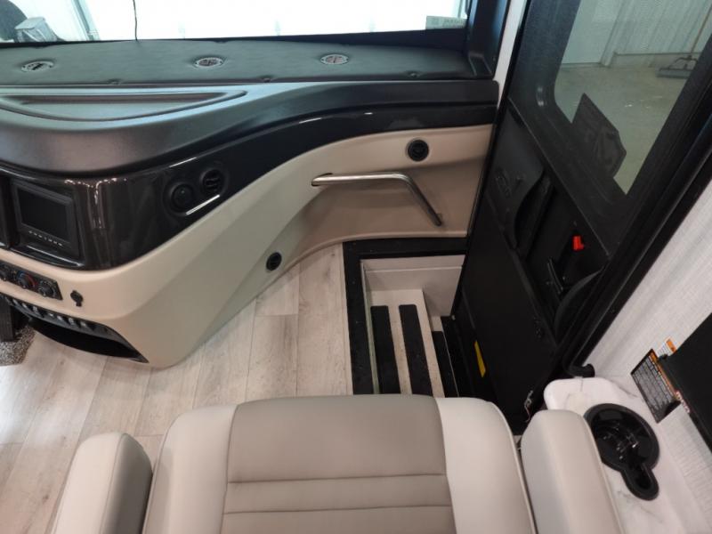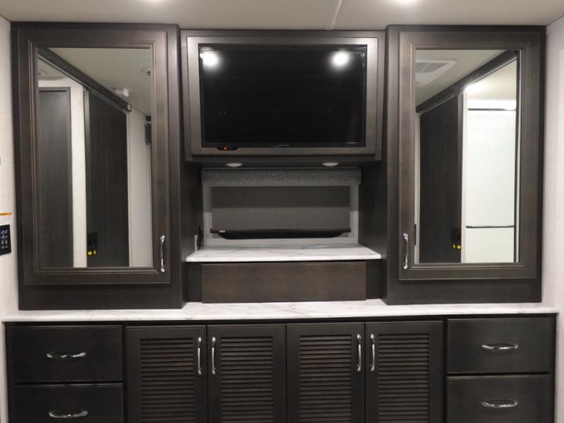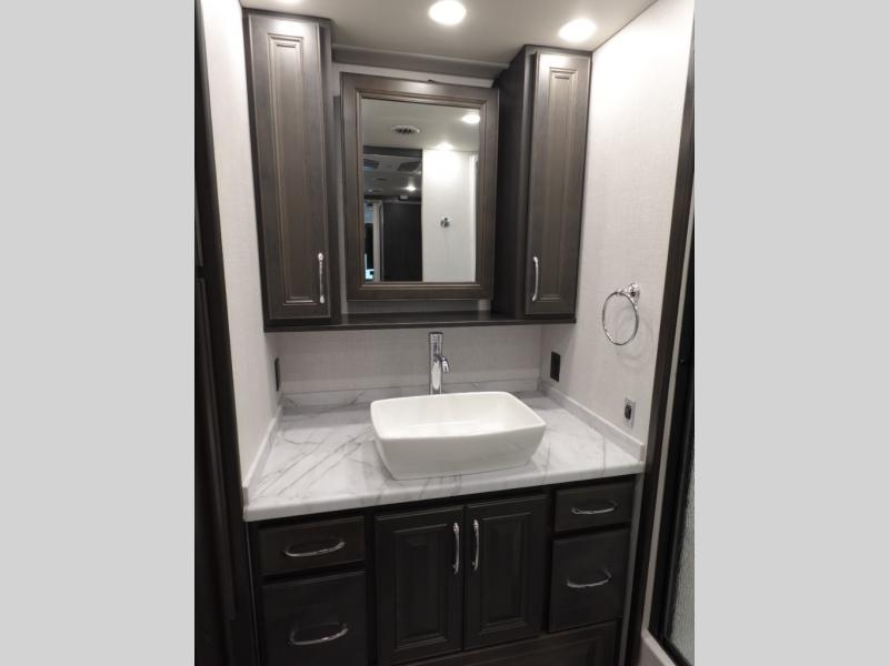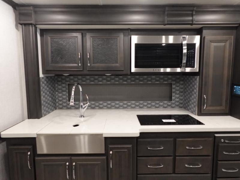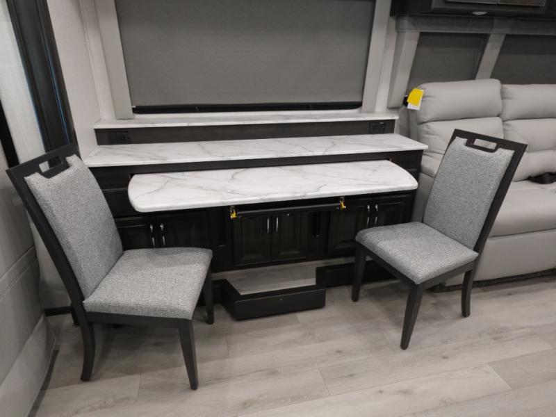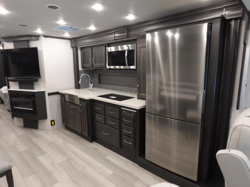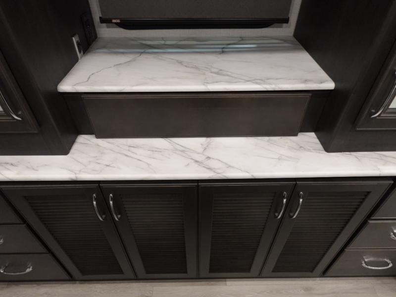 Whether you decide to travel with family or to see friends while you work along the way, this coach offers triple slide outs giving everyone plenty of space to relax, work, or sleep as well as have fun entertaining other RVers. The master suite offers a walk-around Encore Series king bed with double wardrobes/dressers and an LED TV plus a rear full bathroom including a large 50" x 28" shower with a seat. The kids or your guests will have a half bath conveniently located mid-coach. In the main living area you all can watch the LED TV with a cozy fireplace below while sitting on the sofa with two theater seats and the Adap-table dinette and breakfast bar which you might decide to work from as well. And the cook will have full amenities including a convection microwave and residential refrigerator to keep everyone fed.