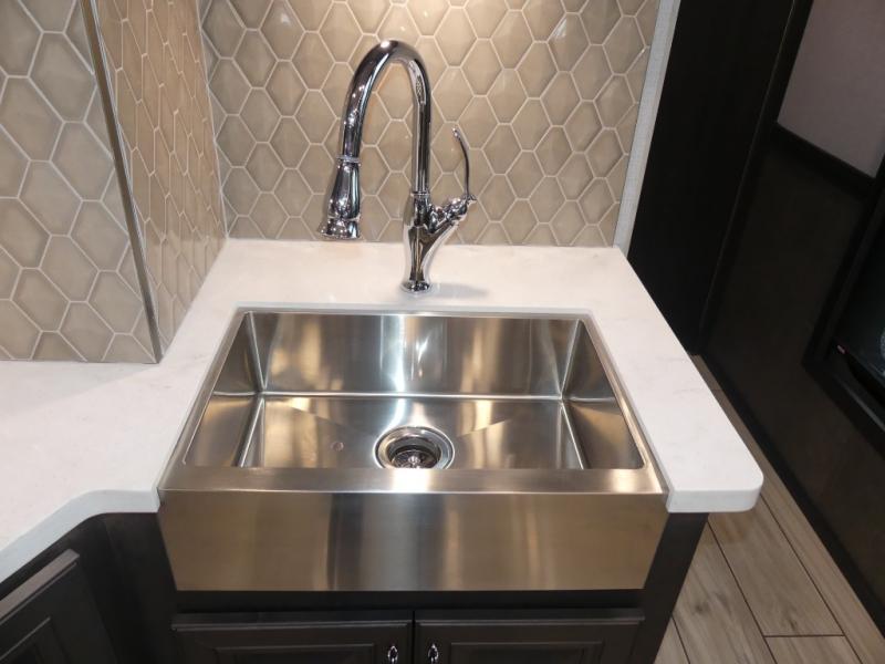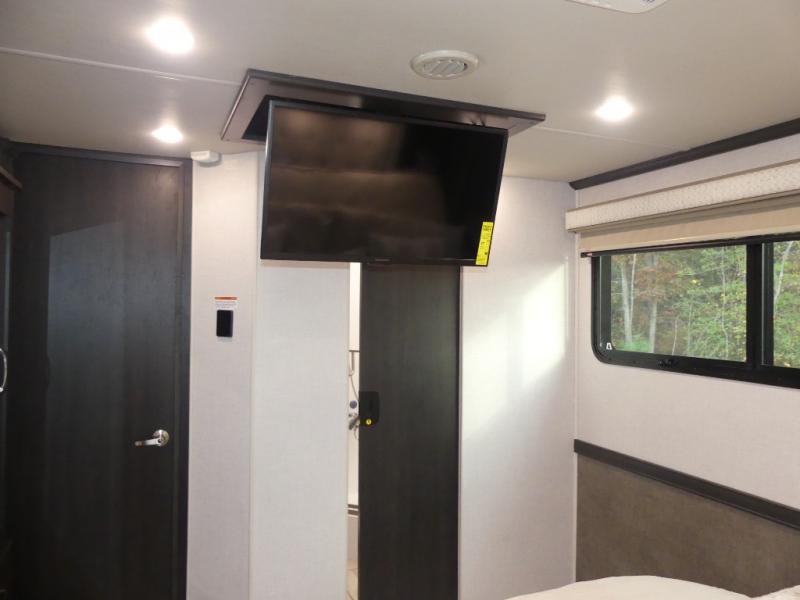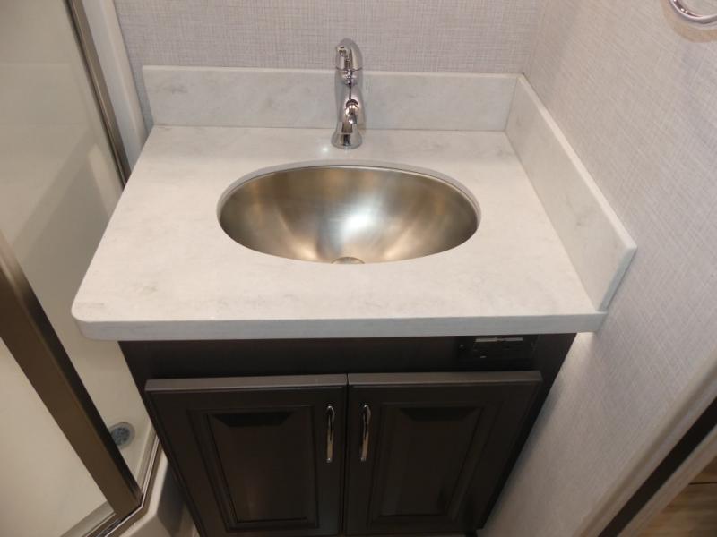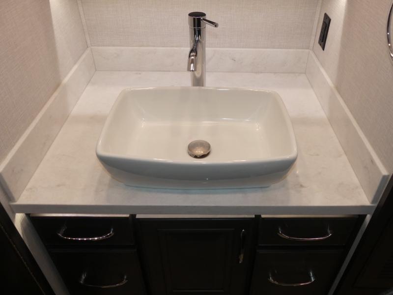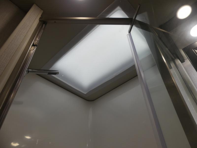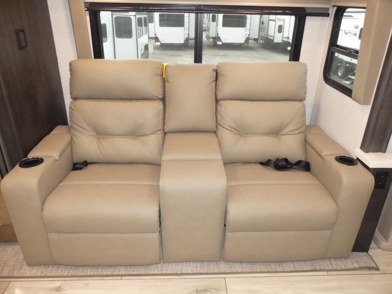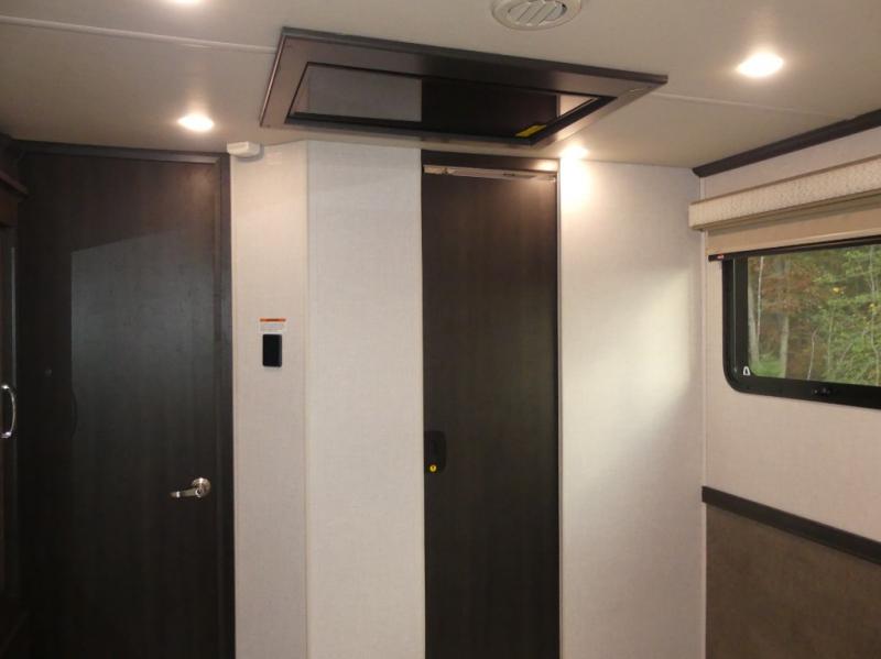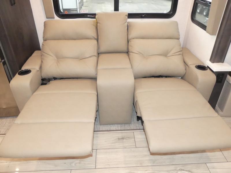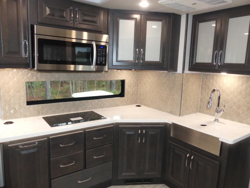 The perfect getaway awaits in this Fleetwood Frontier GTX! A sleek layout with plenty of floor space and two slide outs gives you room to entertain or to relax by yourselves. The kitchen features a unique L-shaped countertop to maximize your work area. There's pull-out storage beneath as well. A residential refrigerator and induction cooktop provide a nice setup to cook almost anything. The kitchen is open to the front living area, so your guests can relax on the theater seat and chat with you while you cook. A dual entry bath is at the center of the coach, with access via the hall or the bedroom. A private half bath with linen closet is tucked behind sliding doors at the rear. Porcelain tile throughout is both stylish and easy to clean.