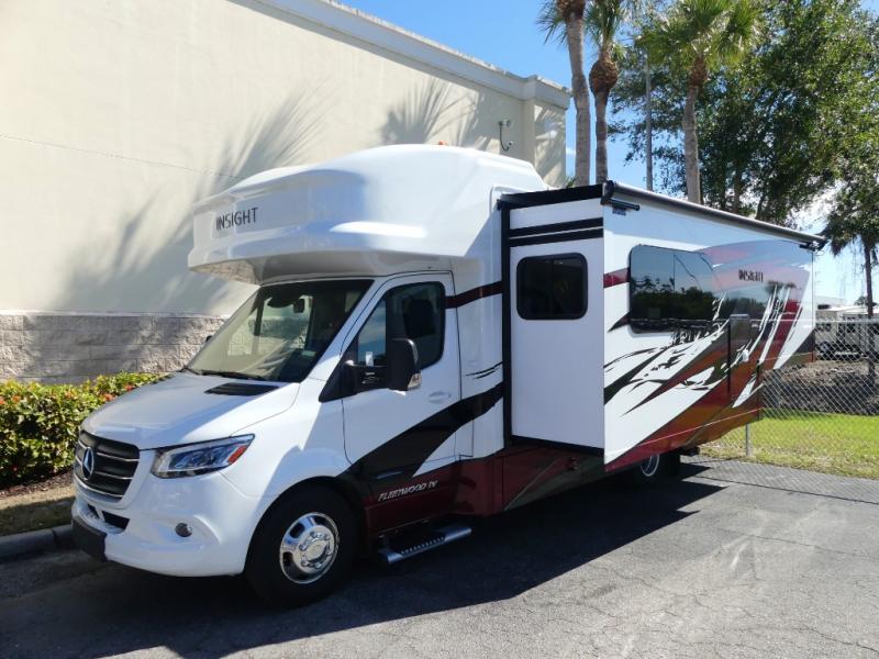 Elevate your journey with the Insight Class C diesel motorhomes by Fleetwood RV. The Mercedes-Benz sprinter chassis and 2.0L turbo diesel engine provide dependability and power wherever you decide to roam, and you'll love the elegant custom full body paint choices. There are also frameless windows outside, along with side swing luggage doors, a Girard power awning with a wind sensor and LED light, plus four point hydraulic levelers for hassle-free set up. The interior is outfitted with solid surface countertops and solid hardwood cabinetry, plus premium linoleum flooring and roller shades and valances. A Truma Comfort Plus tankless water heater provides exceptional performance, and the 3.6kW LP generator will keep you powered up.