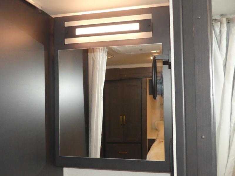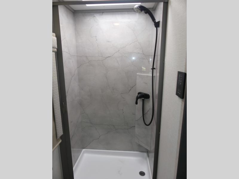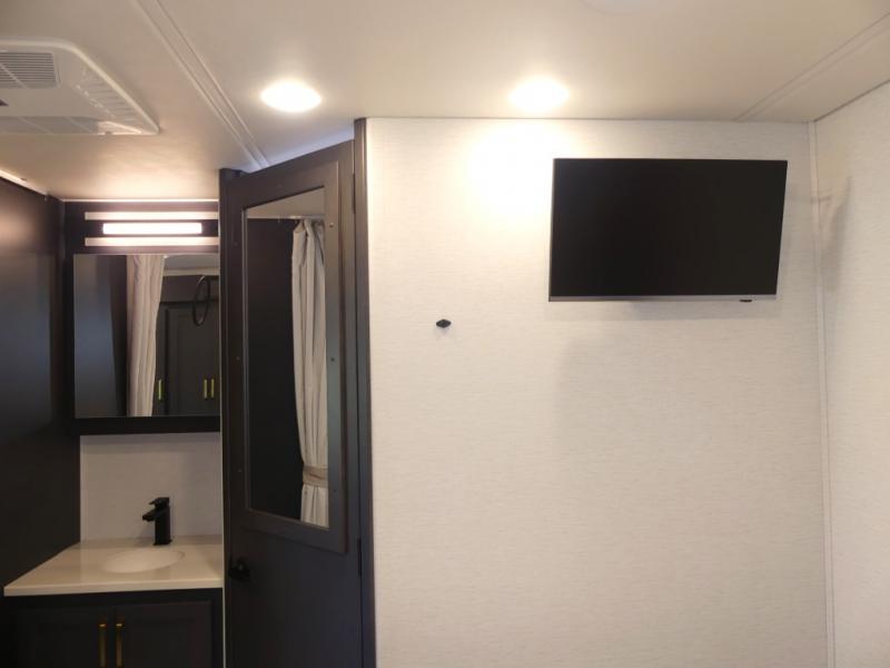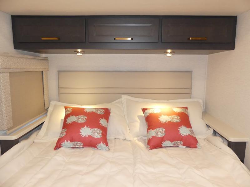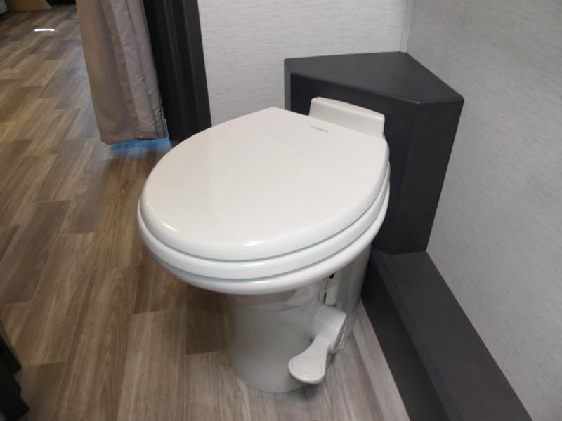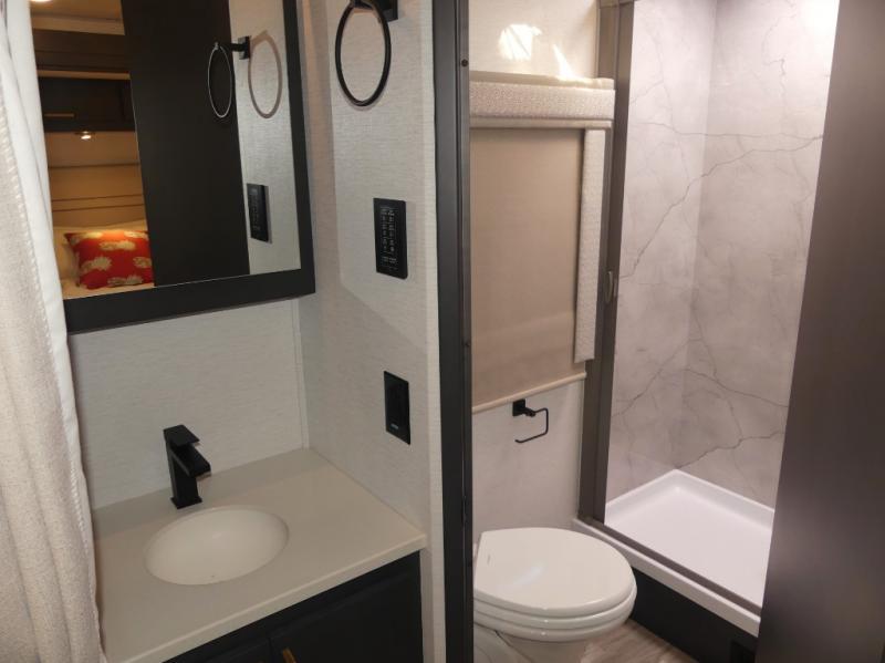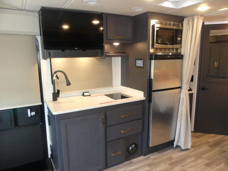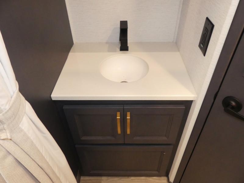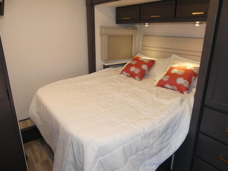 You can't go wrong in this coach! The private bath with a shower and a toilet will let one person freshen up, while another uses the sink just outside the door to brush their teeth. Breakfast can be made on the two burner gas cooktop, and you can grab milk from the 8 cu. ft. 12V compressor two door refrigerator. There is theater seating within the full-wall slide where you can dine, play games, and let a guest or two sleep over. You'll find the rear corner bedroom to be accommodating with its queen bed and overhead cabinet for your things, and any other guests can sleep on the overhead bunk. This model also includes a wardrobe and pantry for clothes and food storage plus exterior storage for camp gear!
