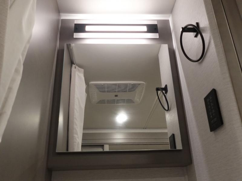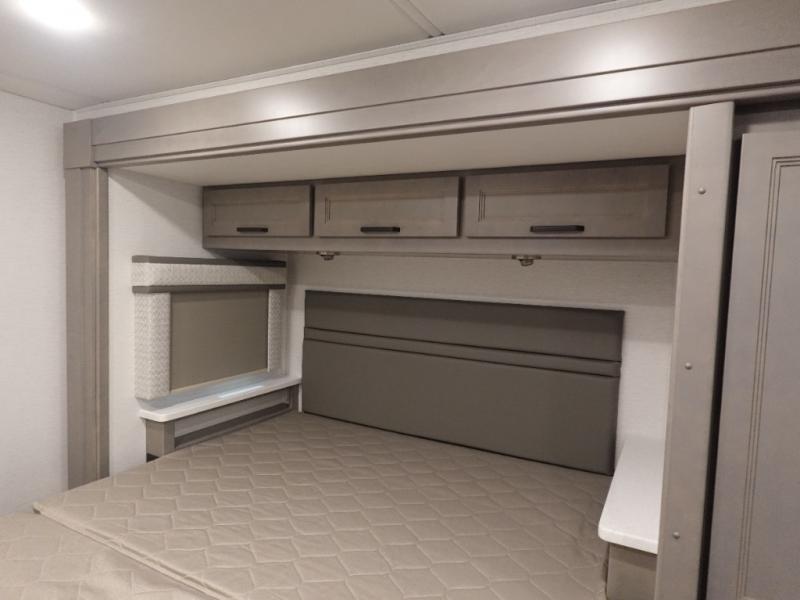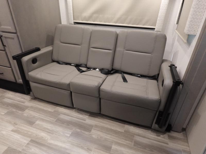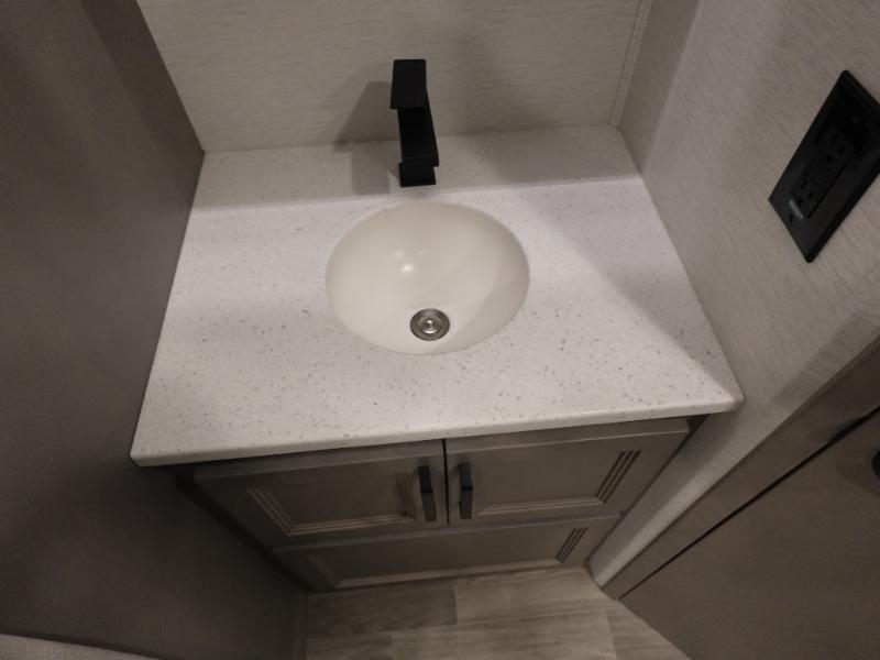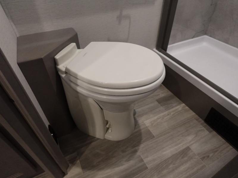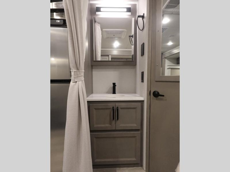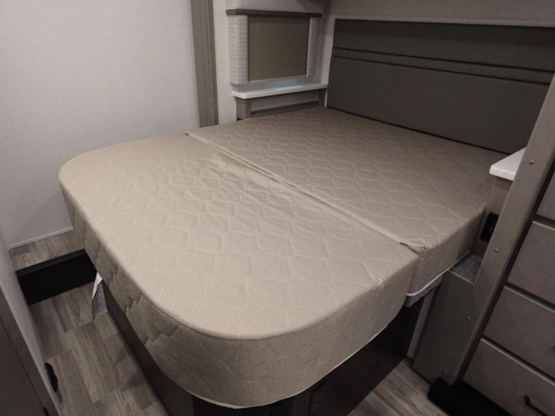 You can't go wrong in this coach that can sleep five to six each night! The private bath with a shower and a toilet will let one person freshen up, while another uses the sink just outside the door to brush their teeth. Breakfast can be made on the two burner gas cooktop, and you can grab milk from the 8 cu. ft. 12V compressor two door refrigerator. There is a booth dinette within the full-wall slide where you can dine, play games, and let a guest or two sleep over. You'll find the rear corner bedroom to be accommodating with its queen bed and overhead cabinet for your things, and any other guests can sleep on the overhead bunk. This model also includes a wardrobe and pantry for clothes and food storage plus exterior storage for camp gear!