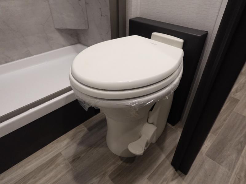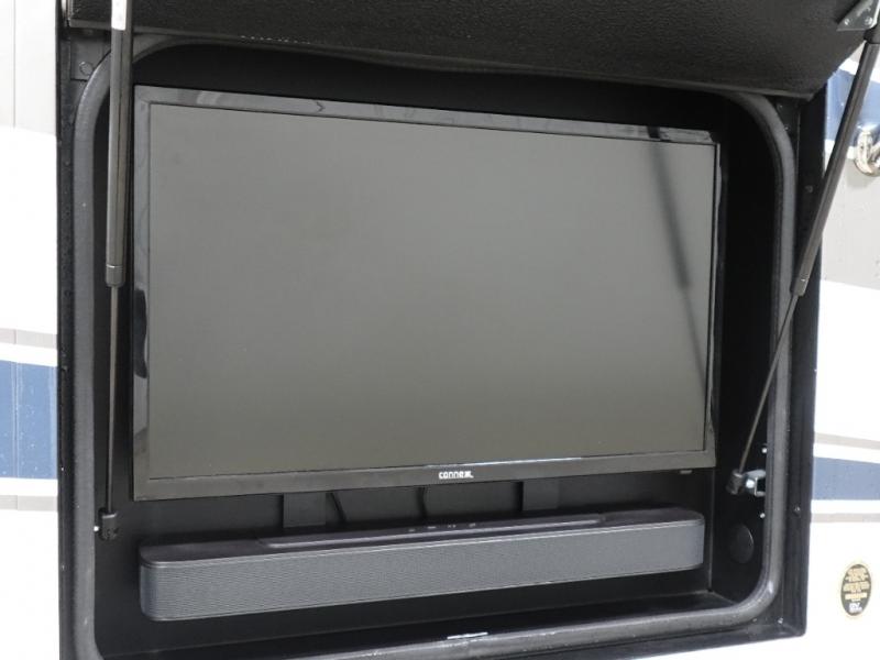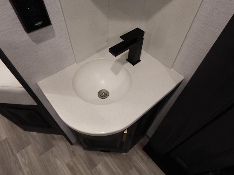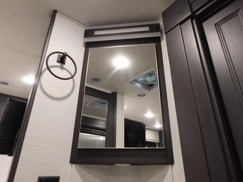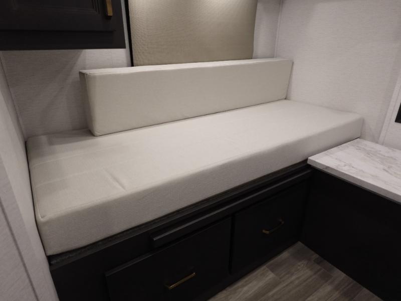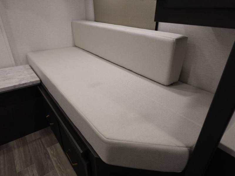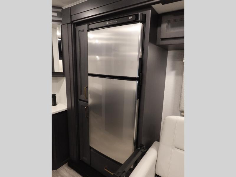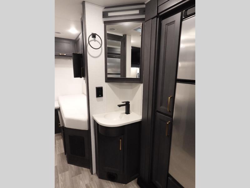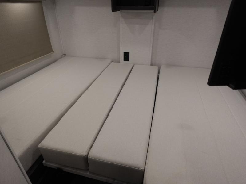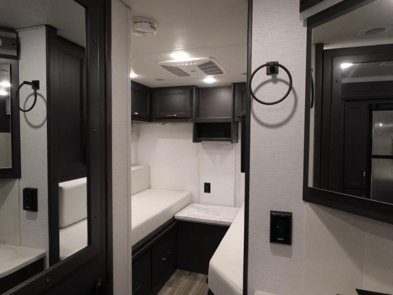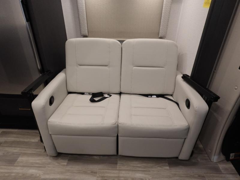 If you enjoy your own sleeping space at night, this coach with twin beds is for you! You'll also find a dresser between the beds and overhead cabinets to keep your space tidy, plus an LED TV to watch movies in bed. A full kitchen lets you cook and store meals, and there is a single bowl undermount stainless steel sink with a cover that provides more counter space when you need it. You'll find the reclining love seat with a removable table within the slide out, along with the 8 cu. ft. refrigerator and pantry for food storage. And the private shower and toilet is right across the hall from the bath sink so two people can freshen up at once; how convenient!