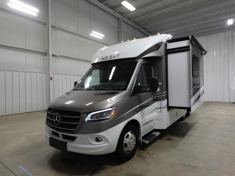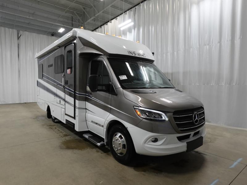 Elevate your journey with the Insight Class C diesel motorhomes by Fleetwood RV. The Mercedes-Benz sprinter chassis and 2.0L turbo diesel engine provide dependability and power wherever you decide to roam, and you'll love the elegant custom full body paint choices. There are also frameless windows outside, along with side swing luggage doors, a Girard power awning with a wind sensor and LED light, plus four point hydraulic levelers for hassle-free set up. The interior is outfitted with solid surface countertops and solid hardwood cabinetry, plus premium linoleum flooring and roller shades and valances. A Truma Comfort Plus tankless water heater provides exceptional performance, and the 3.6kW LP generator will keep you powered up.