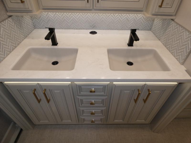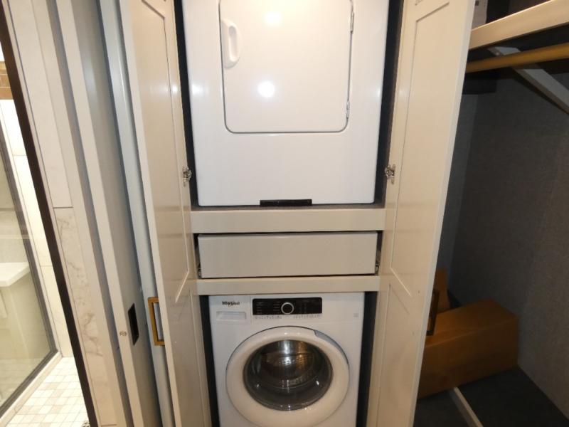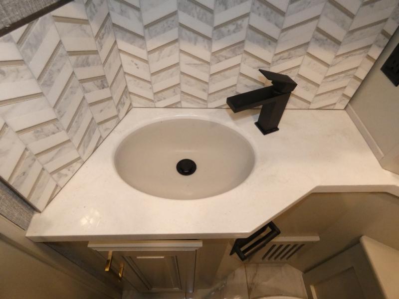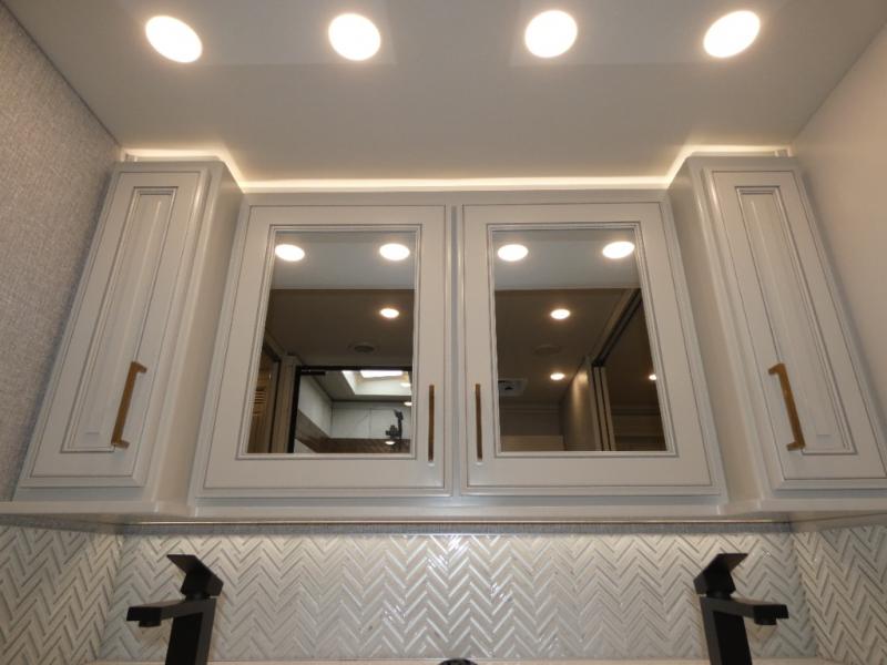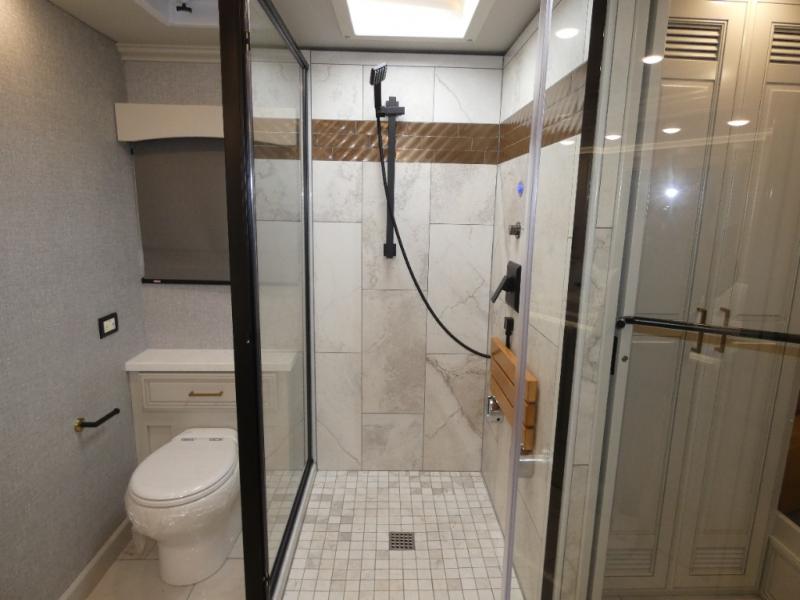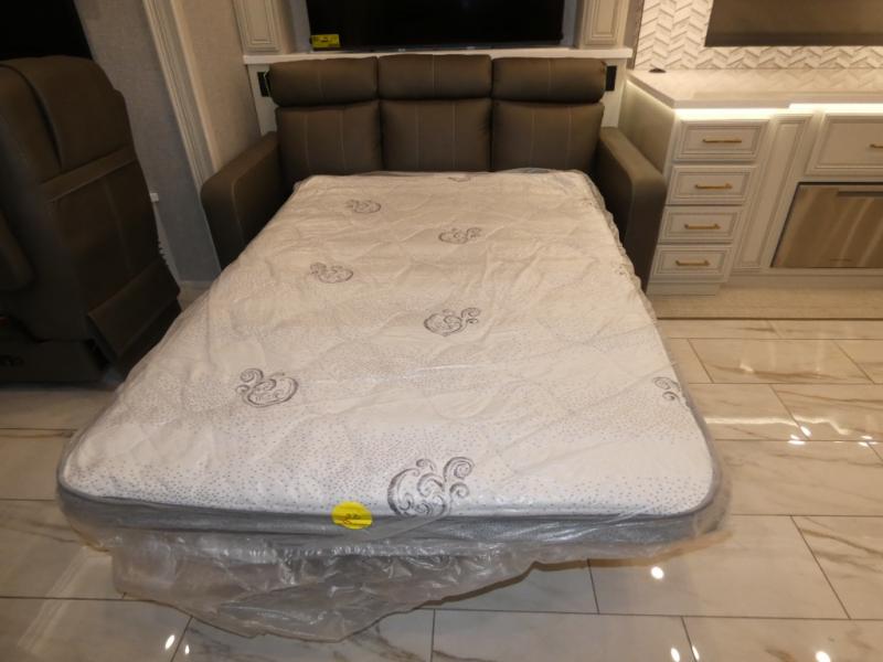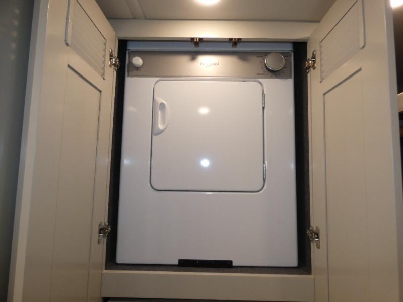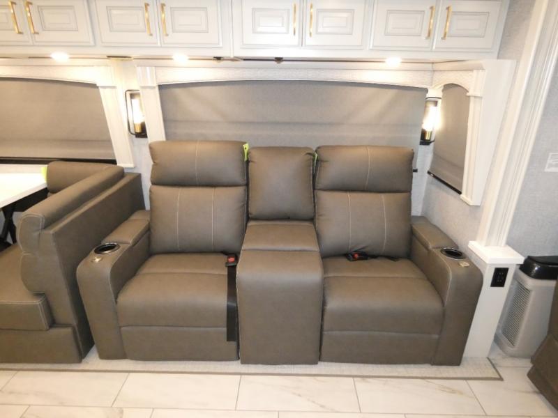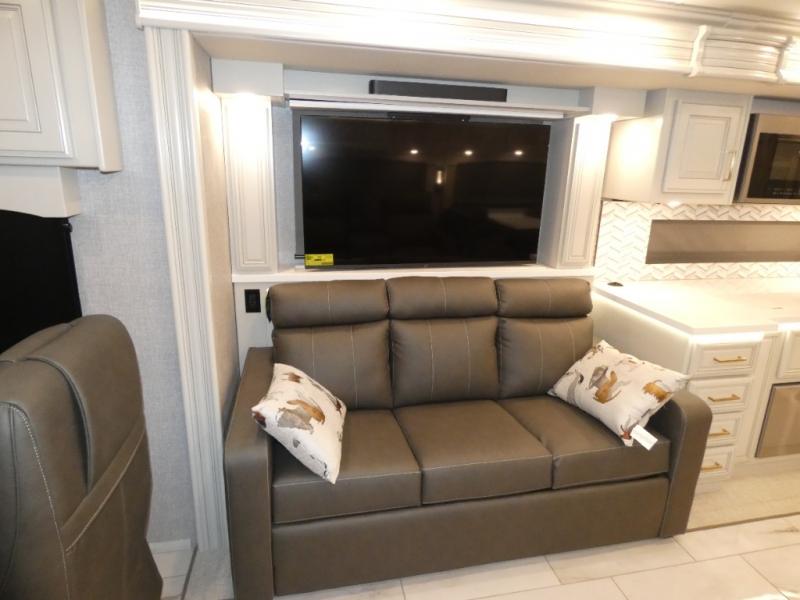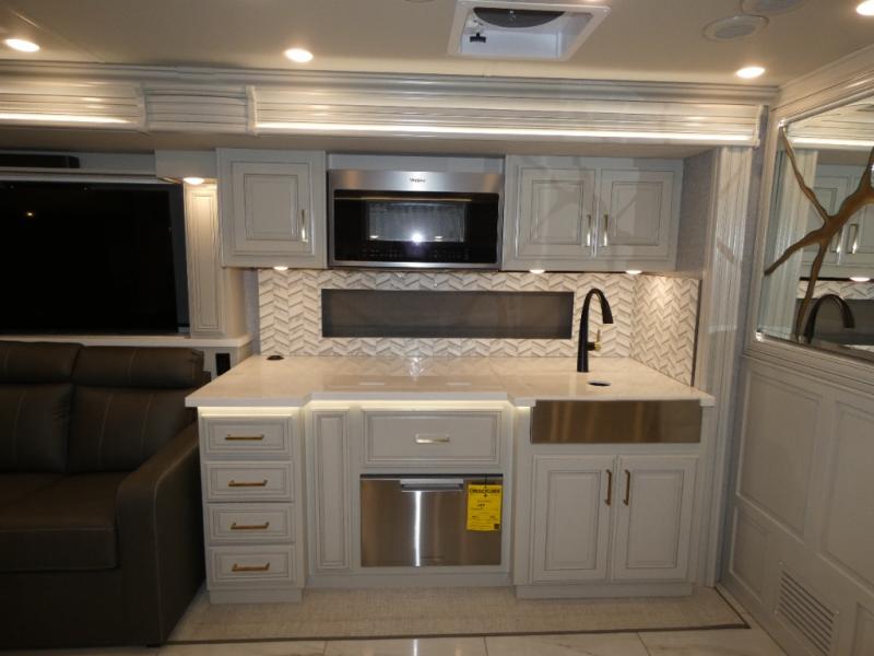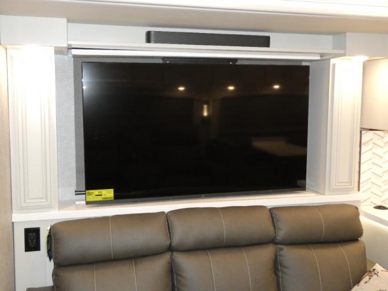 Head across the country or state in this spacious coach! The motion power lounge provides a comfy place to relax, and the sleeper sofa with a full-size mattress will be perfect for guests. The full kitchen includes a two burner induction cooktop and stainless steel over-the-range convection microwave to cook meals, plus a dishwasher for easy clean-up and a residential refrigerator for food storage. You will love having a king bed slide out to sleep on, along with dual bedroom wardrobes and a dresser to keep your clothes tidy. The mid-coach half bath is easily accessible for everyone to use, and the full rear master bath is sure to be a big bonus. Here, you'll find dual bath sinks, a spacious shower, and a walk-in closet with tons of storage and a stackable washer and dryer. This coach also includes LED TVs to keep you entertained, including an exterior entertainment center with a Bluetooth soundbar!